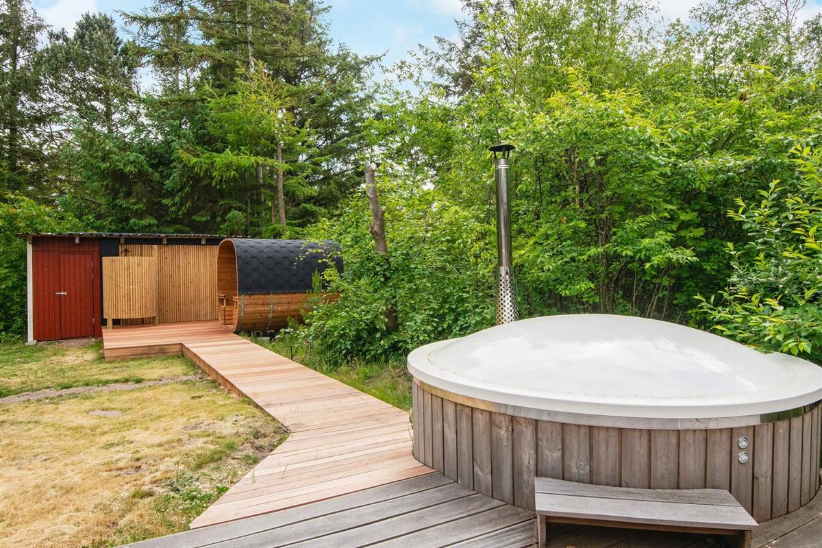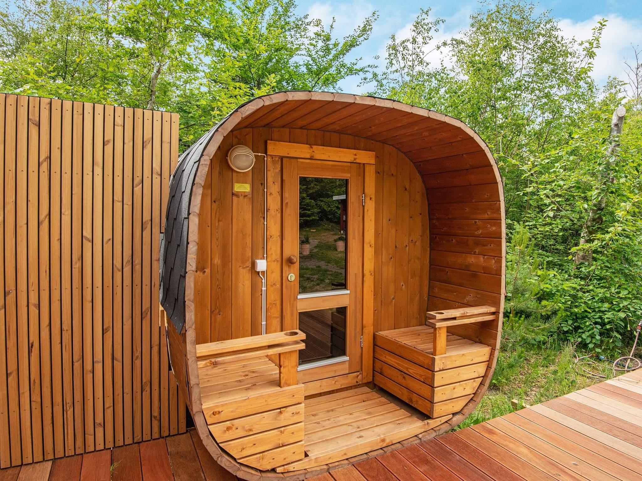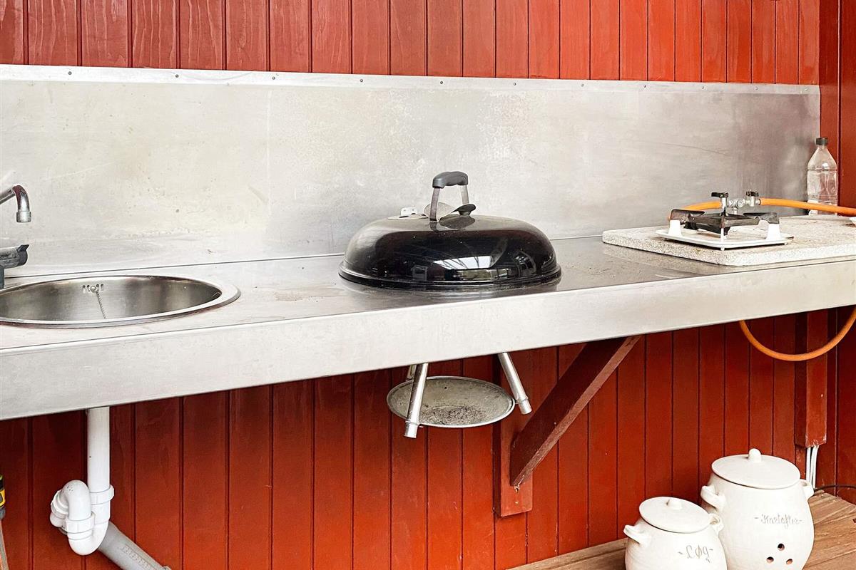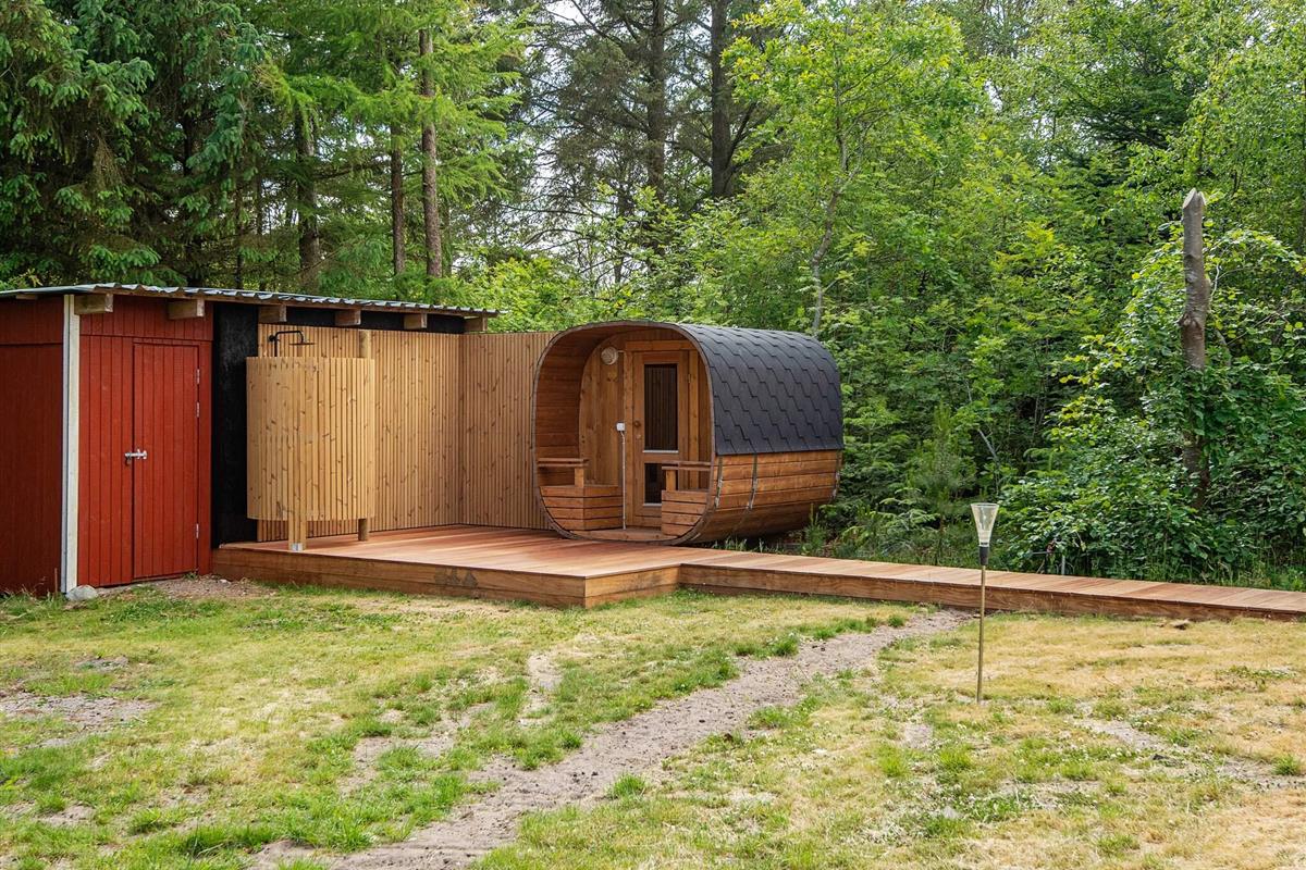 Im schön geschützten Außenbereich finden Sie nicht nur den Außen-Whirlpool. Wildnisbad und die Saunatonne für erholsame Stunden, sondern auch die praktische Außendusche sowie eine Außenküche mit integriertem Kugelgrill. Im Schuppen gibt es einen Gefrierschrank.