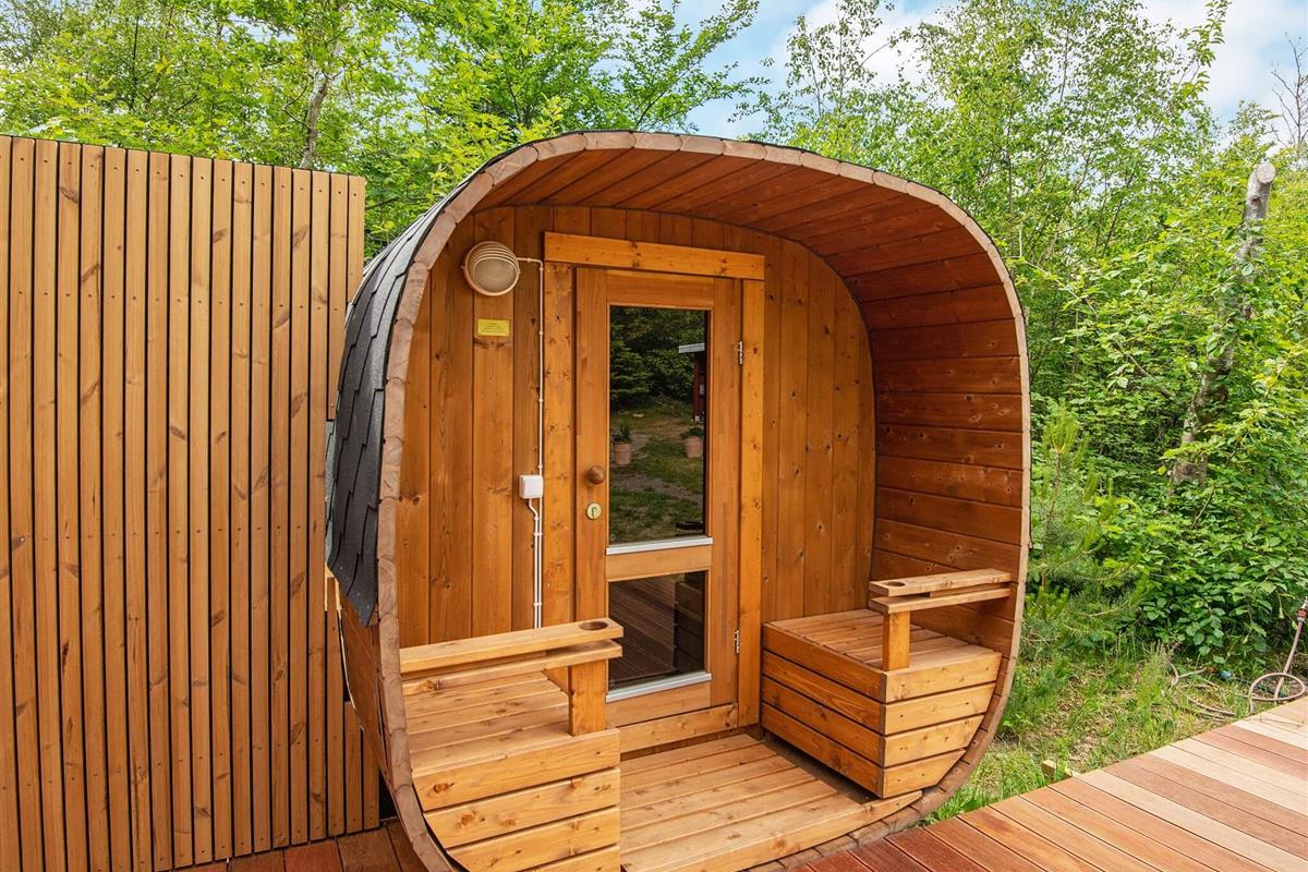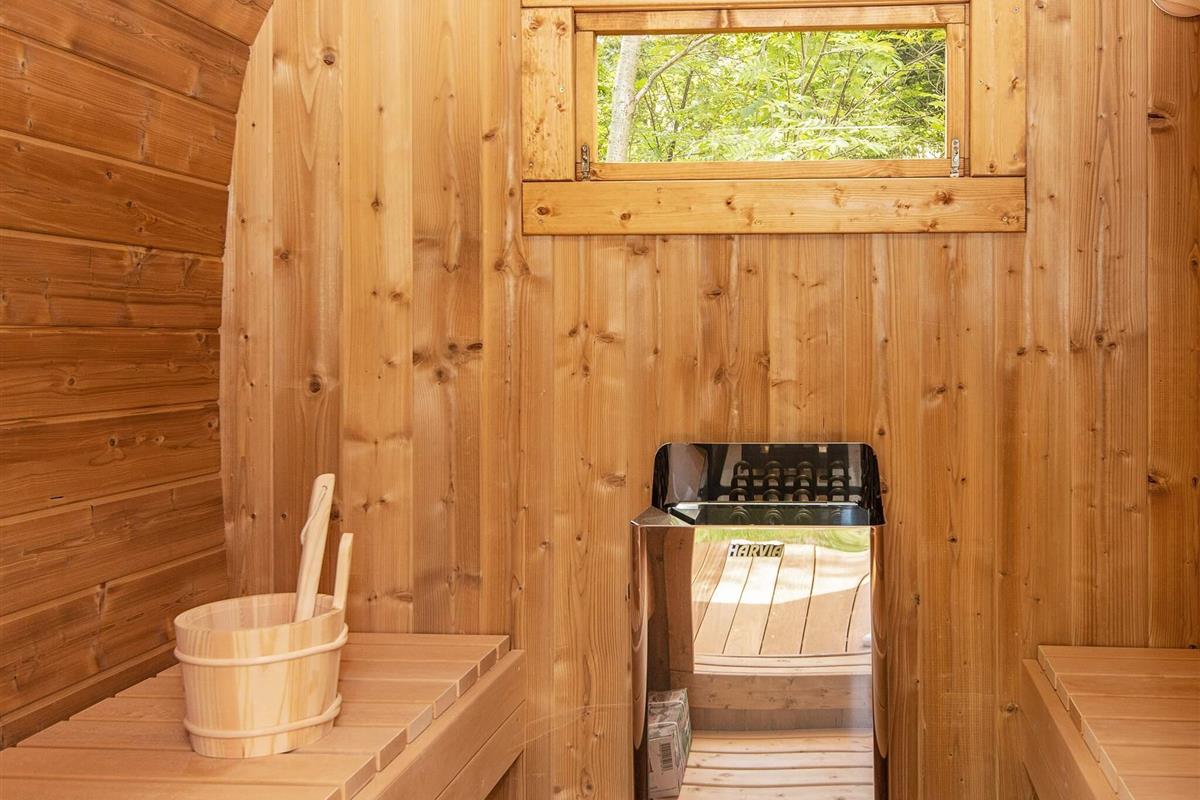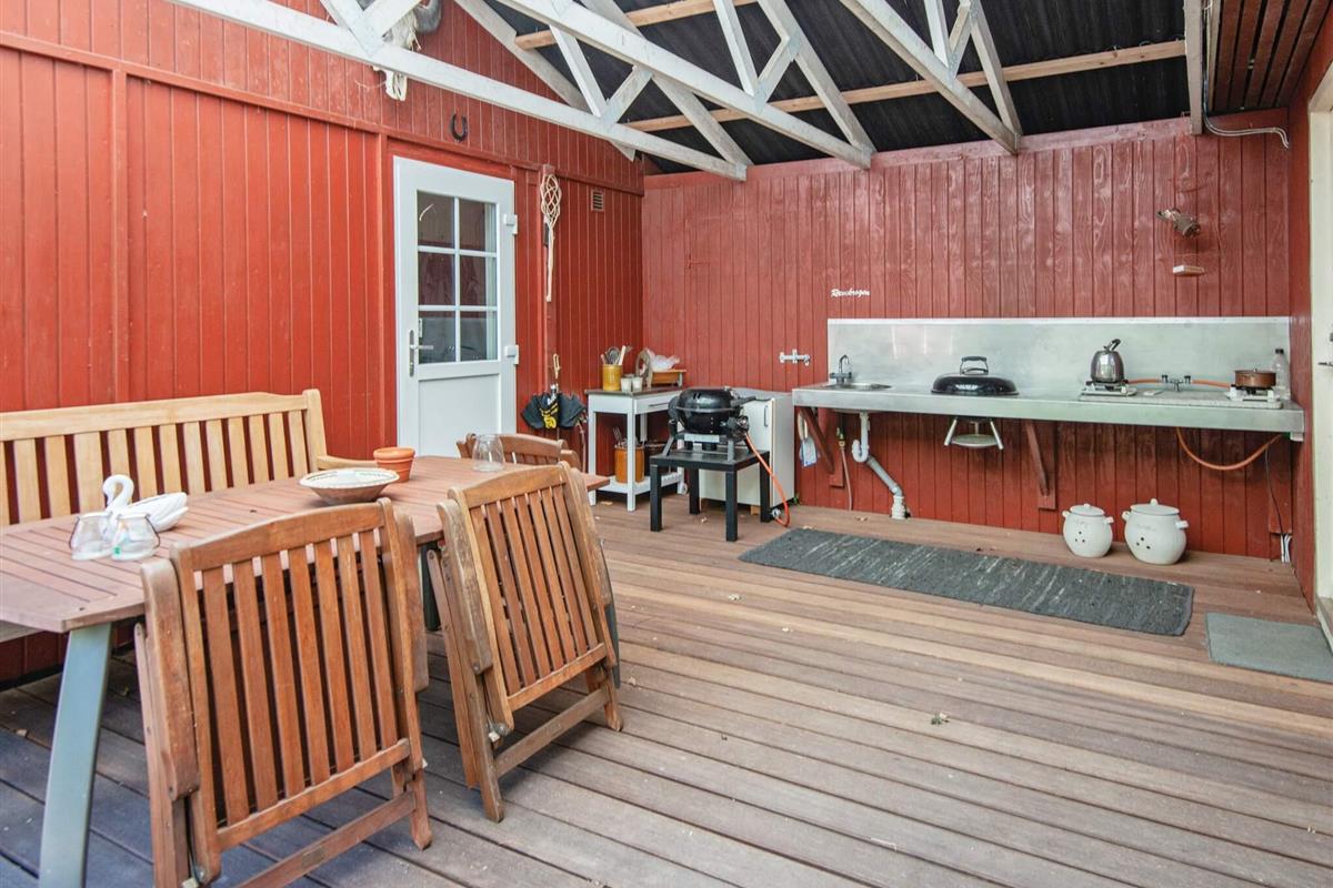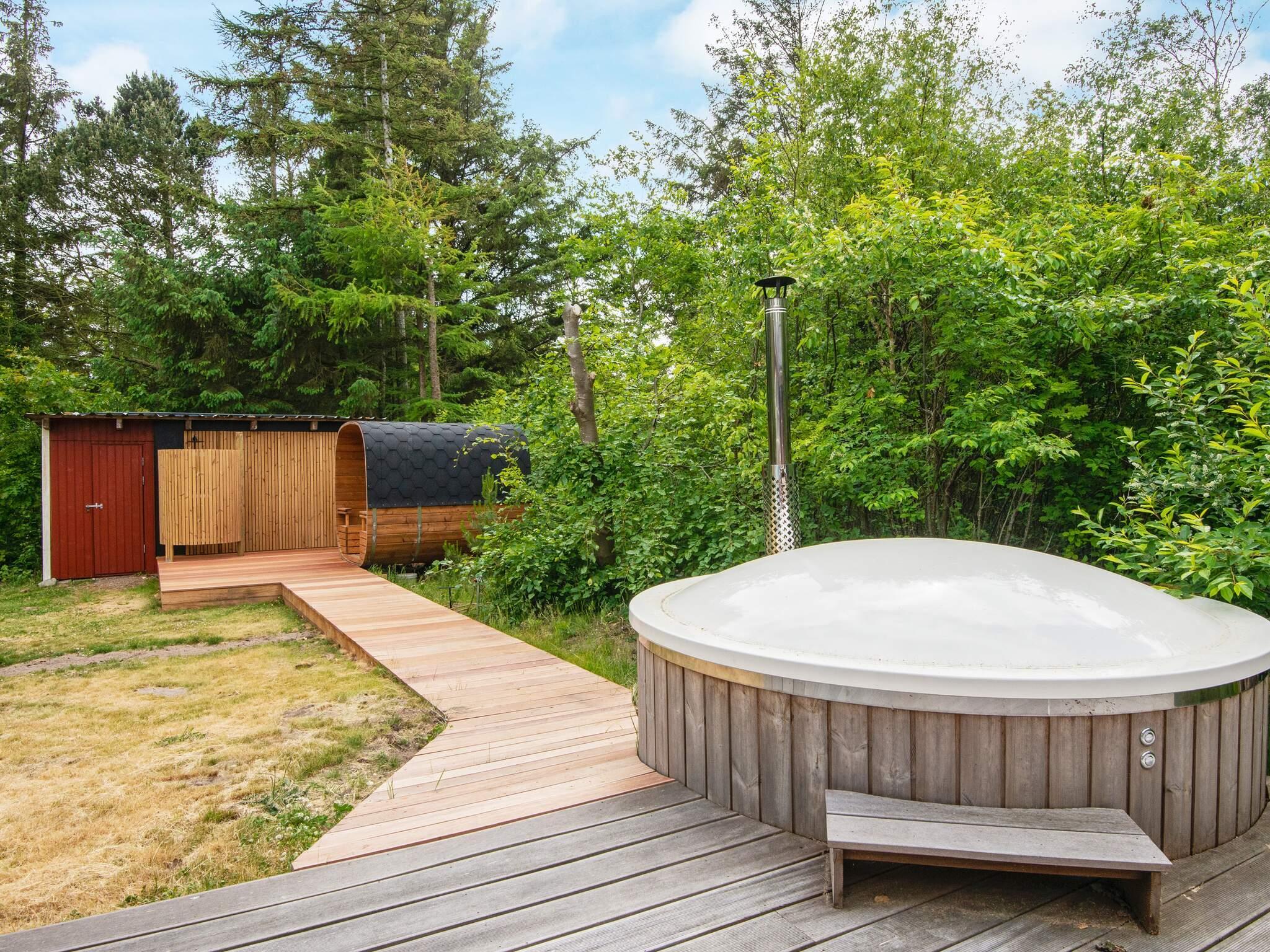 Im schön geschützten Außenbereich finden Sie nicht nur den Außen-Whirlpool. Wildnisbad und die Saunatonne für erholsame Stunden, sondern auch die praktische Außendusche sowie eine Außenküche mit integriertem Kugelgrill. Im Schuppen gibt es einen Gefrierschrank.