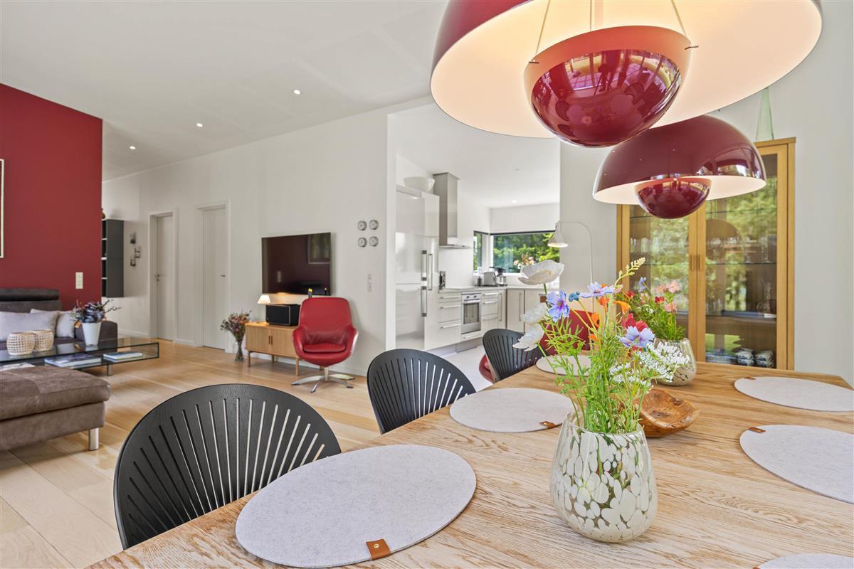 Das offene Wohnkonzept verbindet die Küche mit Spülmaschine, den Essbereich und die gemütliche Sofalandschaft, damit ihr viel Zeit miteinander verbringen könnt, sei es beim Kochen oder bei einem lustigen Spieleabend. Der Wohnbereich ist mit einer Fußbodenheizung ausgestattet und für noch mehr zusätzliche Ferienhausatmosphäre sorgt der Holzofen.