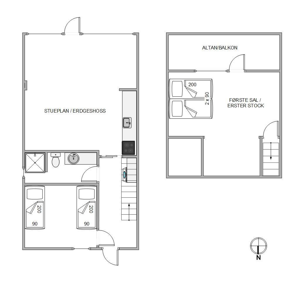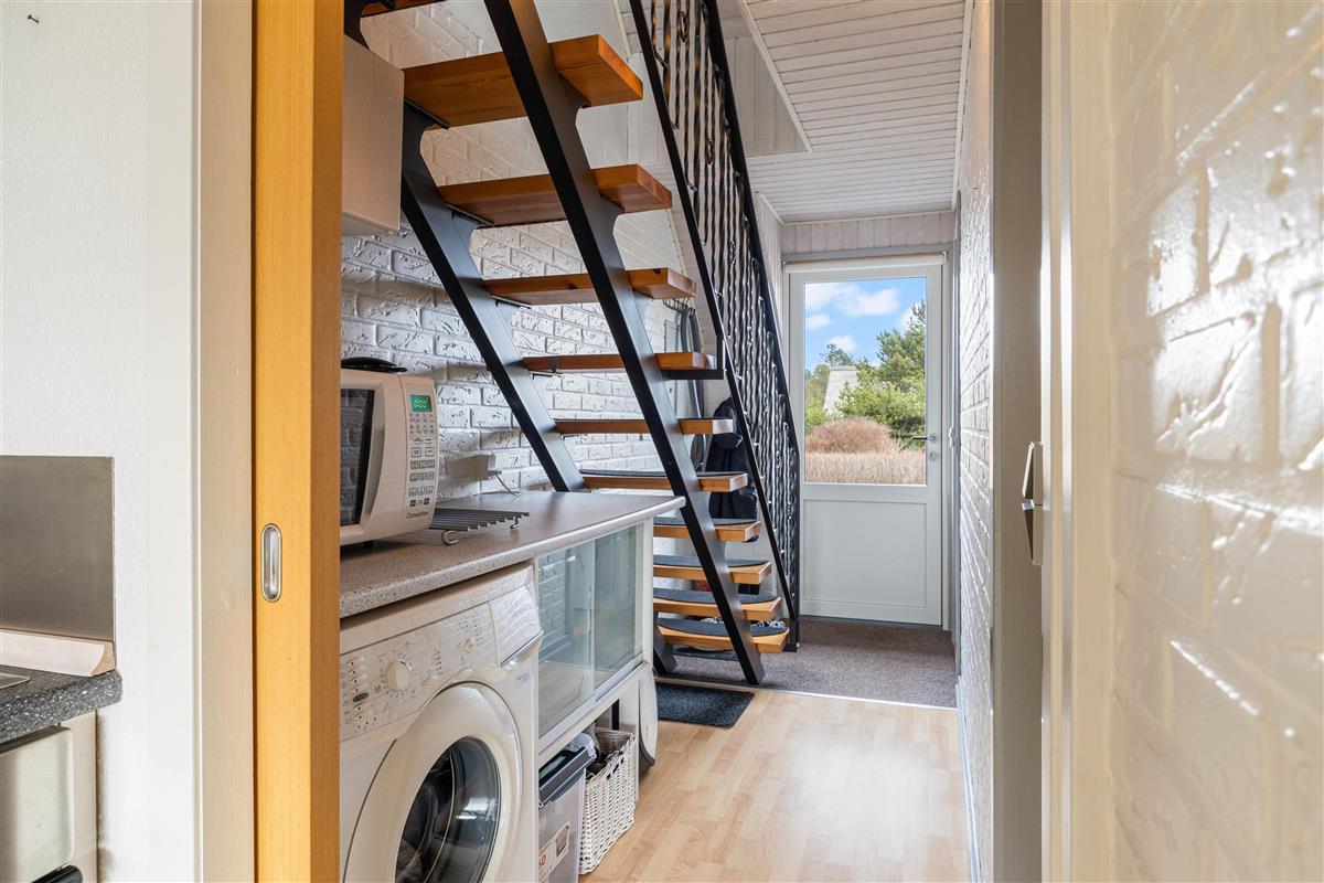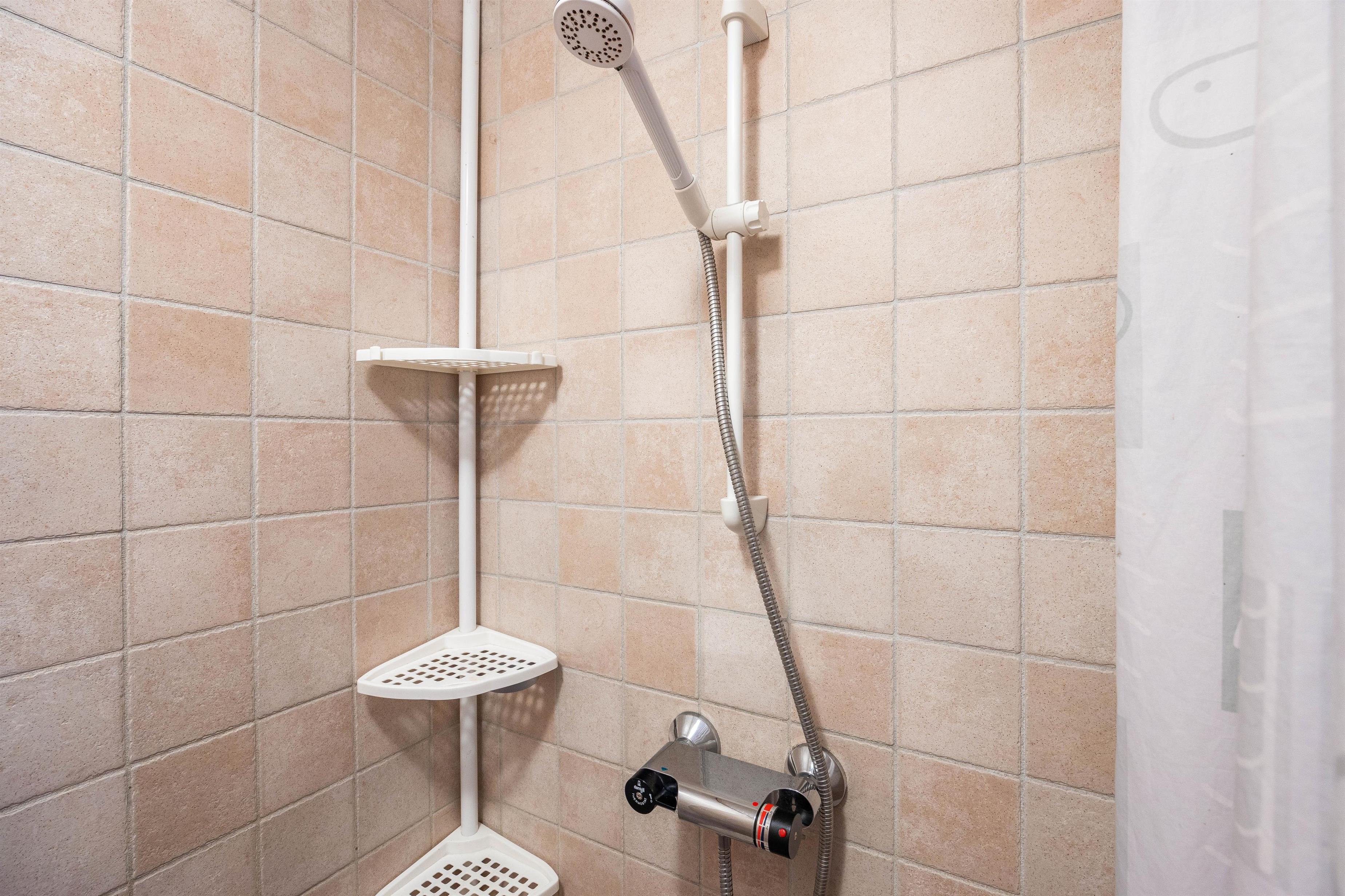 Enter this holiday apartment through the practical hallway, which also houses the washing machine. To the left, you'll find both the bedroom with twin beds and the well-maintained bathroom with underfloor heating. Following the stairs up leads you to the second bedroom, featuring a comfortable double bed. From here, you have access to the balcony offering views over the area.