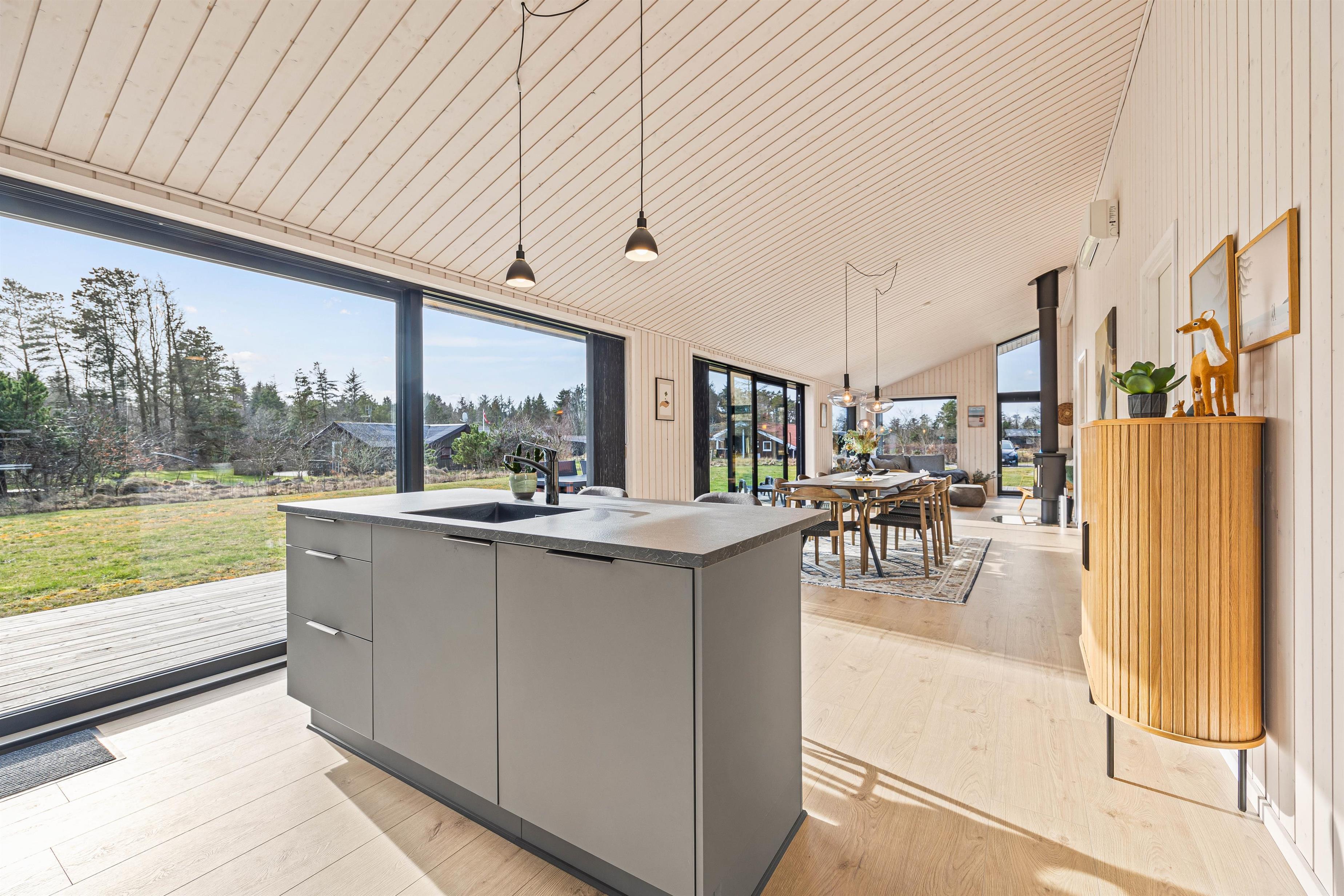The large panoramic windows of this holiday home, built in 2020, not only allow plenty of natural light but also offer views of the beautiful surroundings.