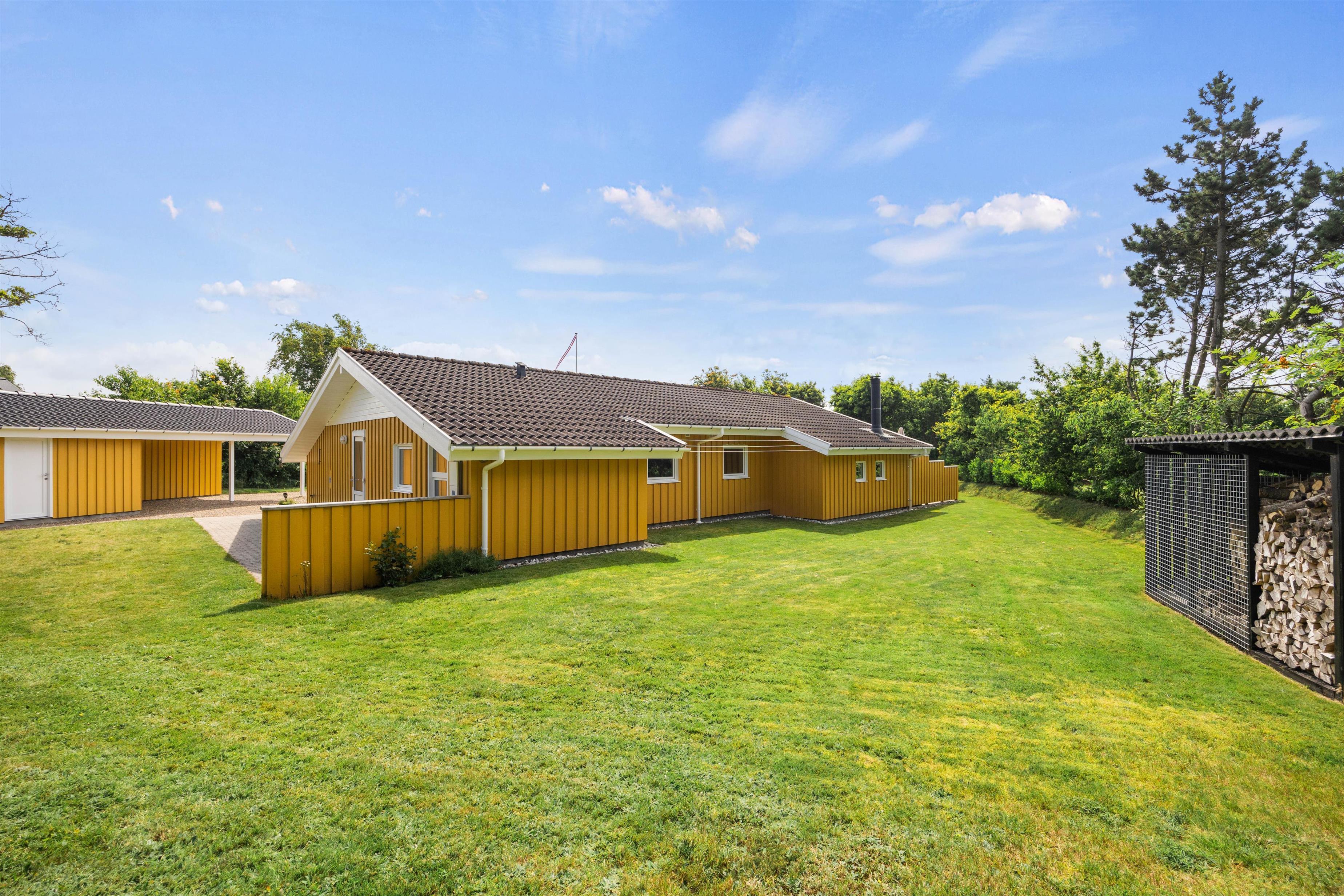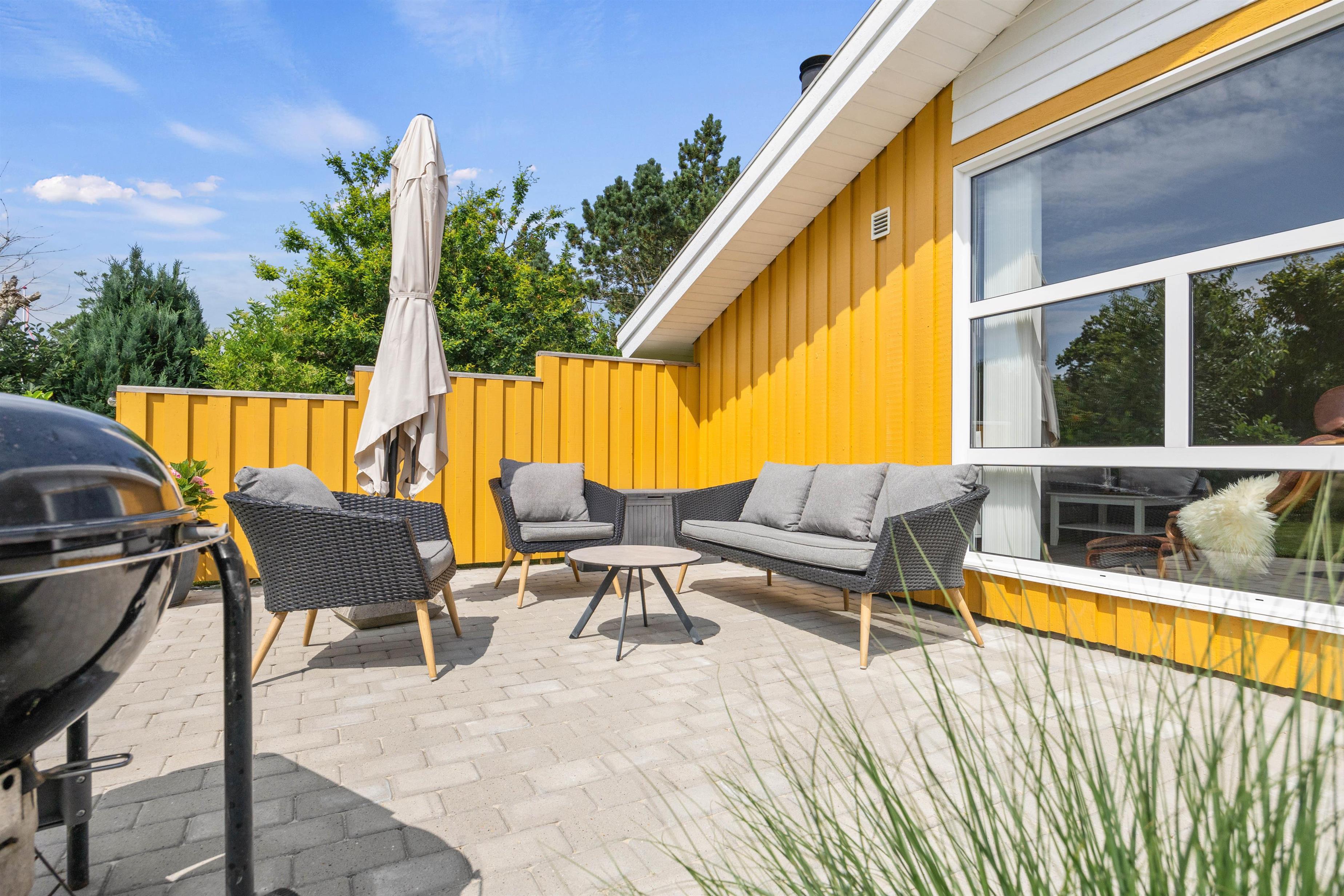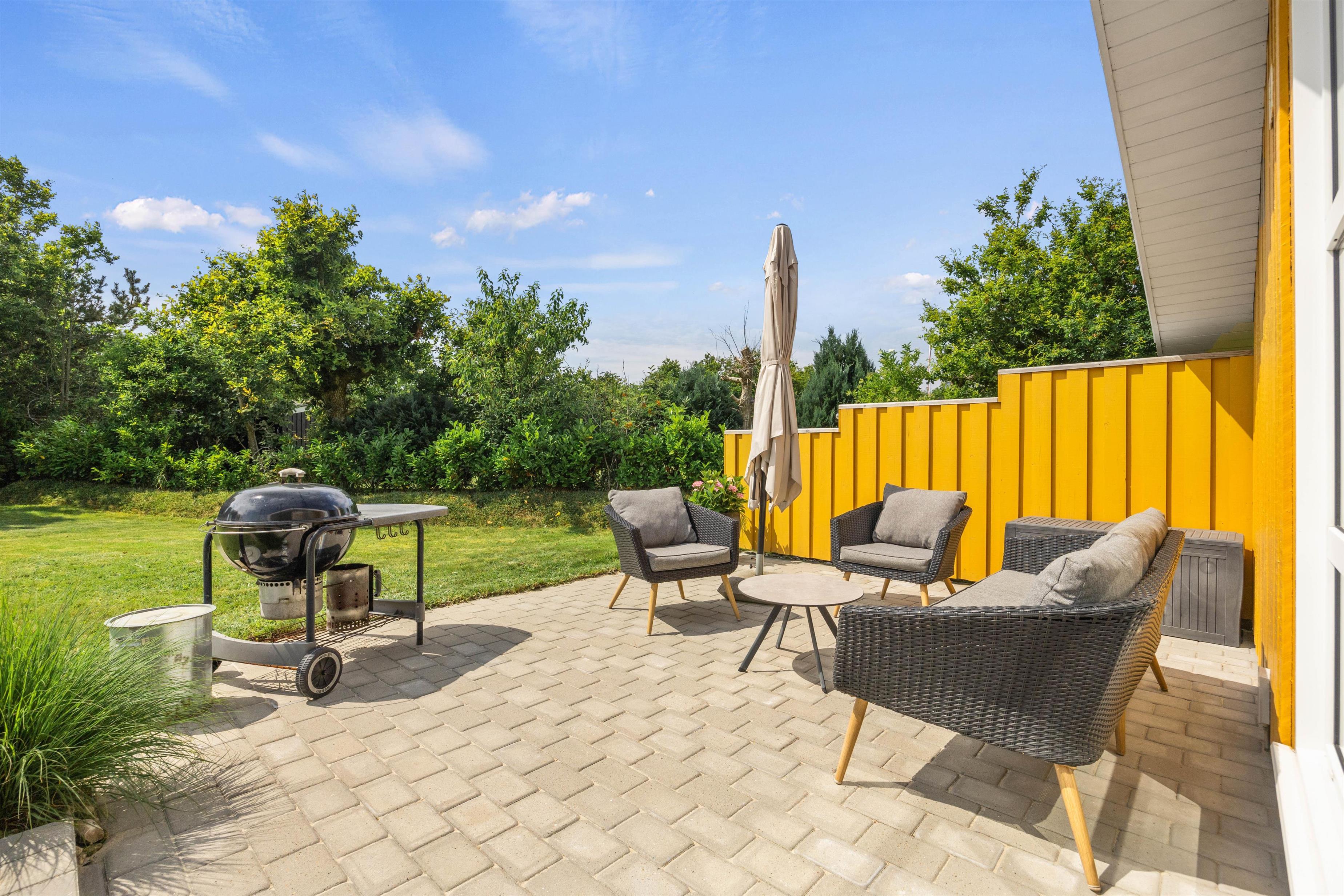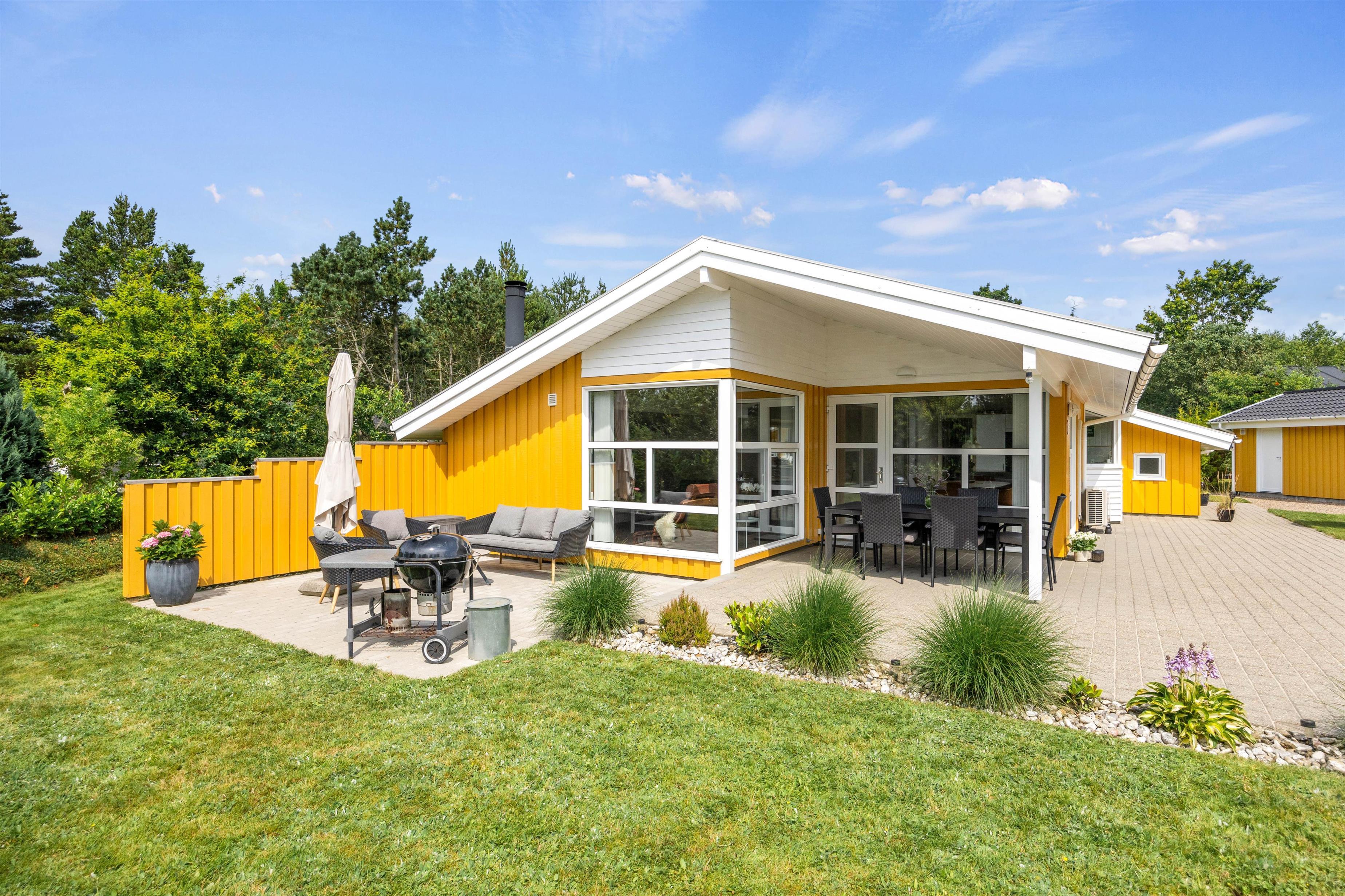 Situated on the outskirts of Henne Strand, the holiday home stands on a well-maintained large plot. The terrace comes equipped with garden furniture and a barbecue, perfect for enjoying time outdoors. There are several areas on the terrace for both sun and shade, with a covered section allowing outdoor seating even during brief showers. The expansive lawn is ideal for ball games and other activities.