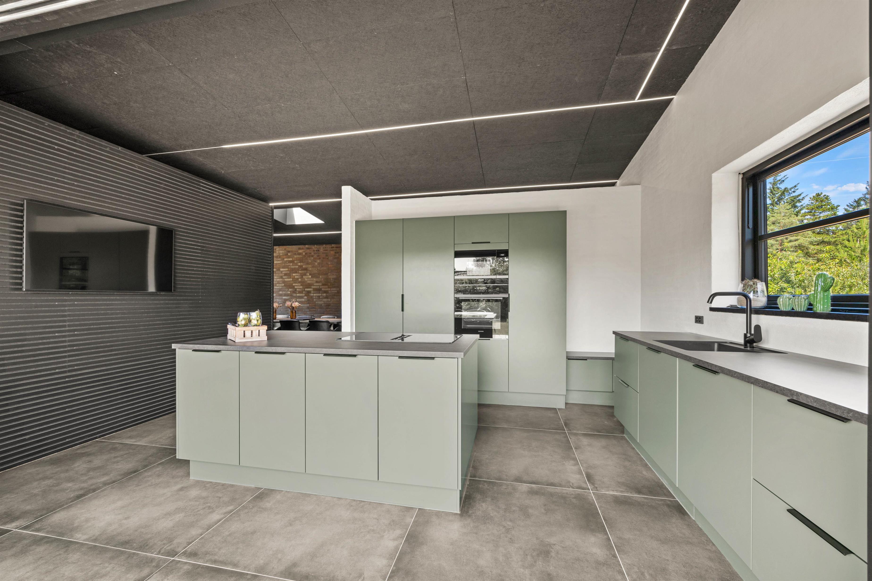 The kitchen is perfect for social cooking, while the sofa arrangement invites cosy evenings of games or films. The wood-burning stove adds extra comfort and warmth.