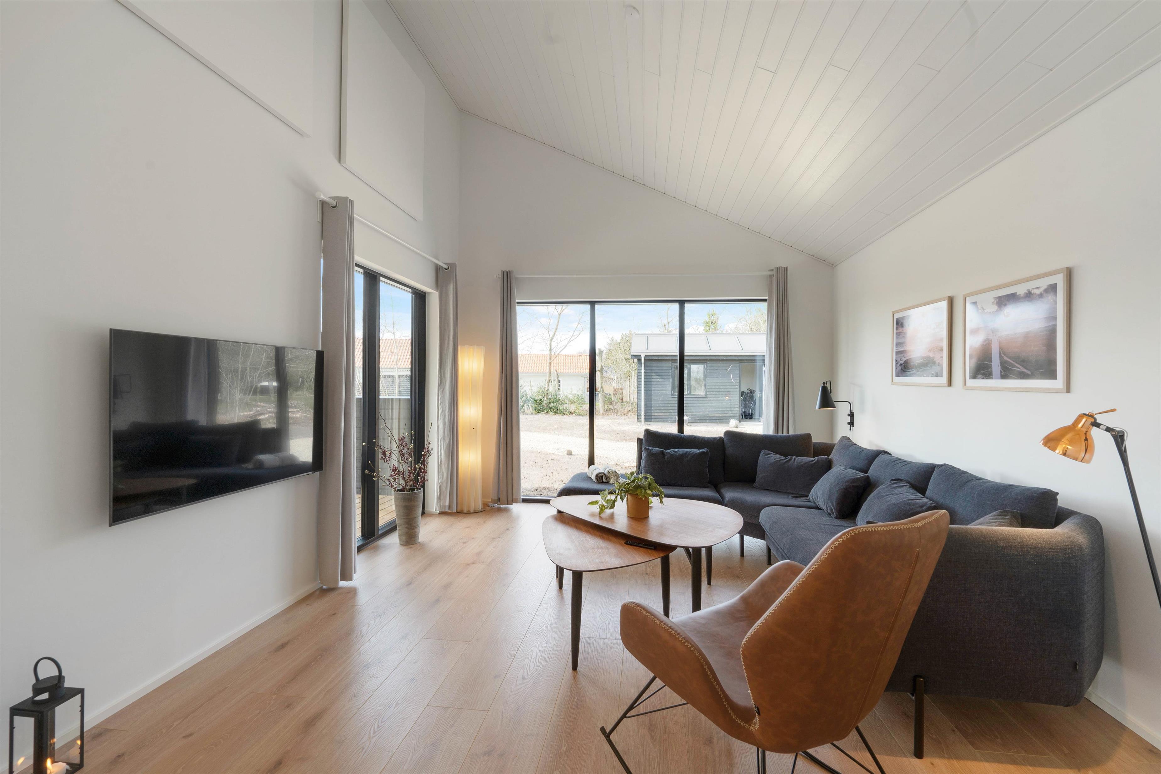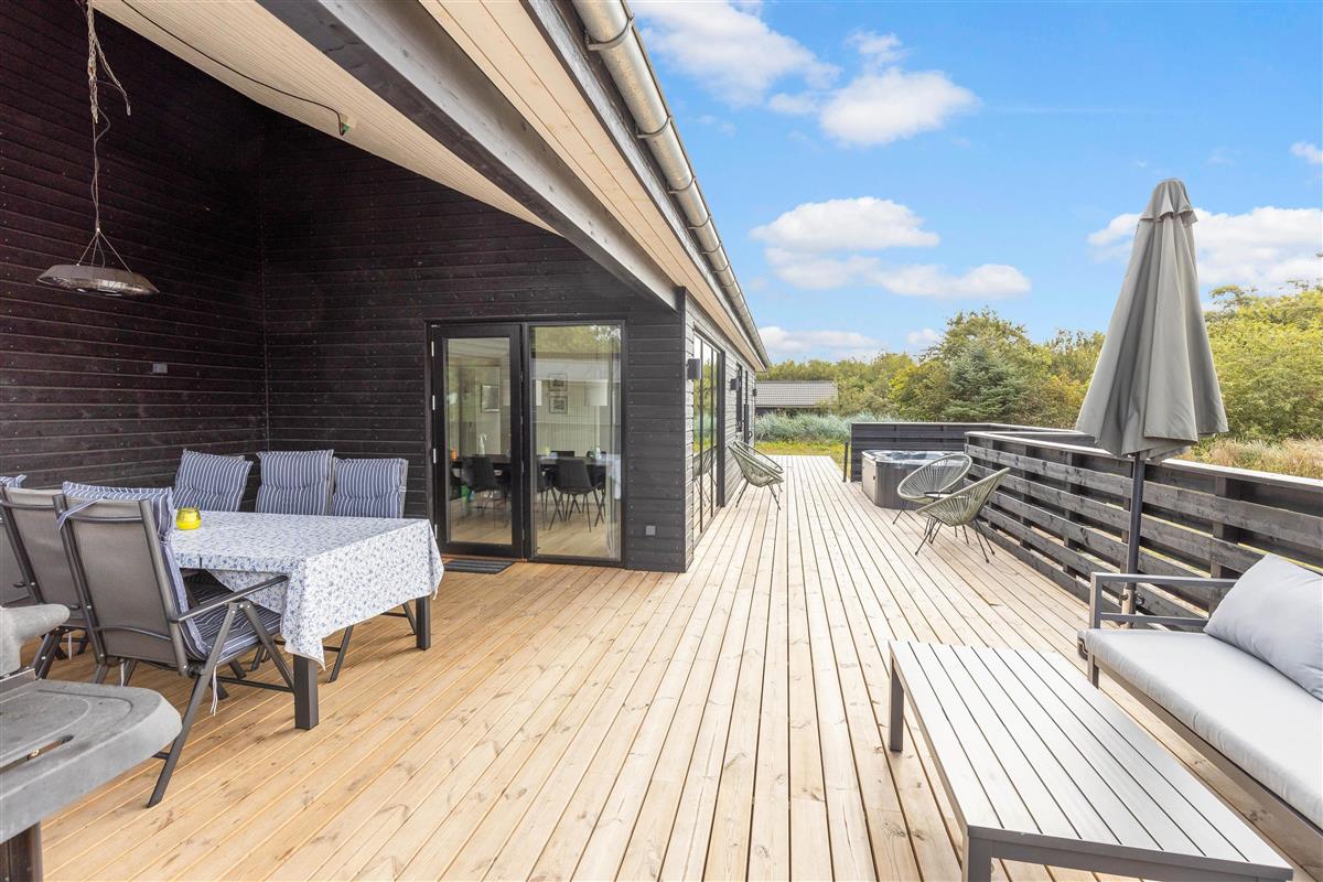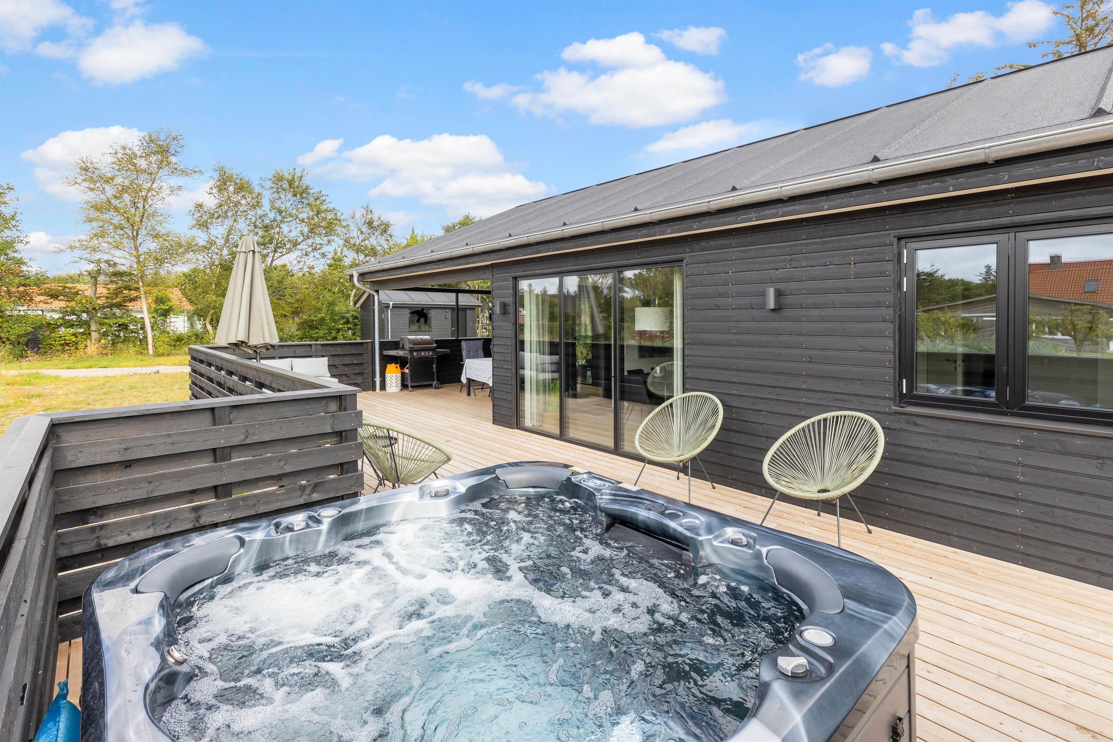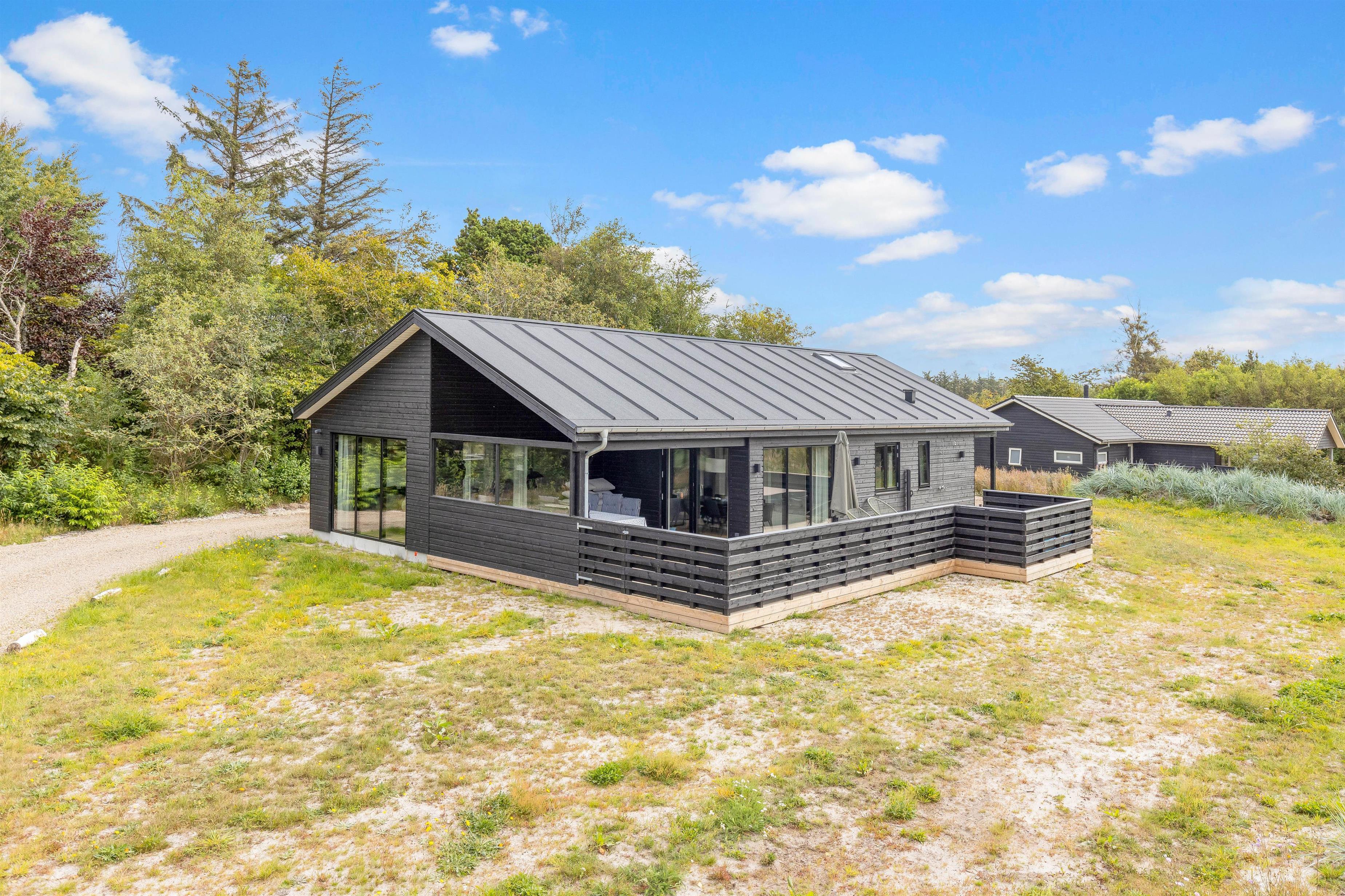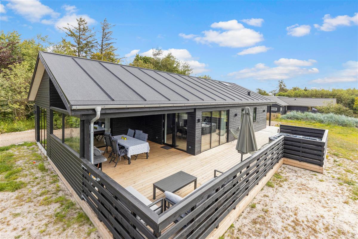 Located in the second row on a spacious 1,800-square-metre plot near the beautiful Henne golf course, this holiday home built in spring 2022 accommodates up to 6 people and 2 dogs. The outdoor hot tub is undoubtedly the highlight, where you can relax in warm, bubbling water whilst stargazing, regardless of the season - an open-air bath is truly something special. Additionally, there's an outdoor shower and a Type 2 electric vehicle charging point installed at the holiday home.