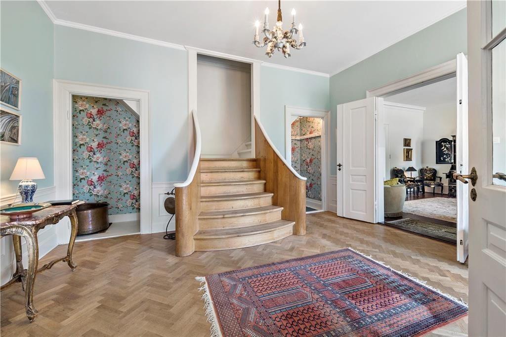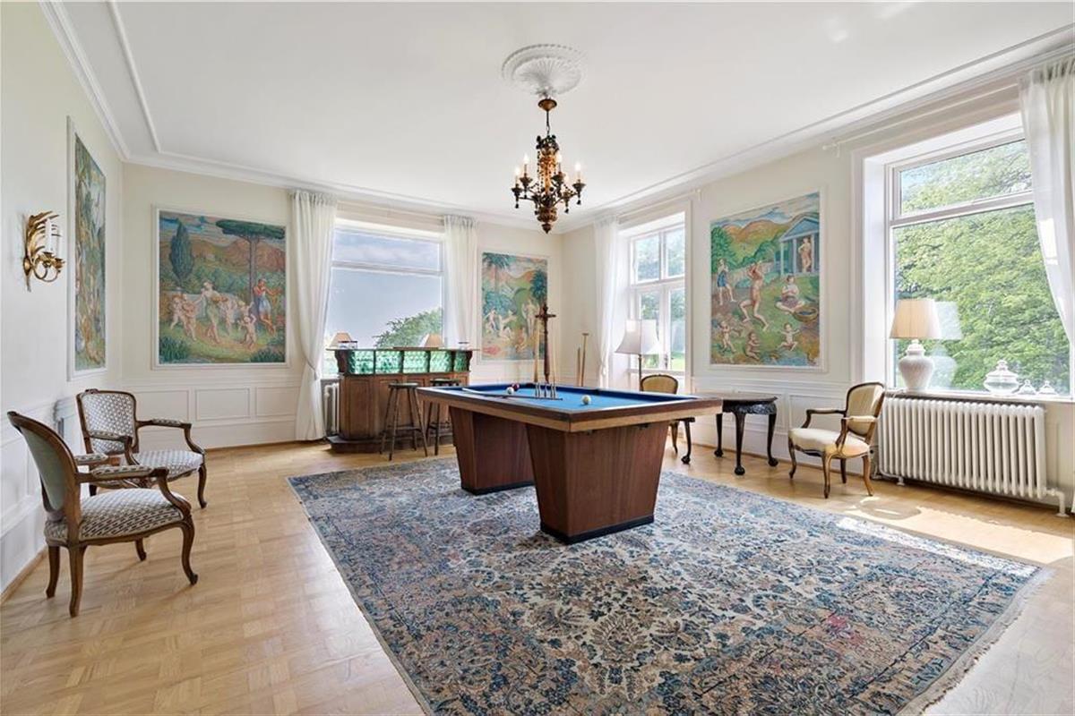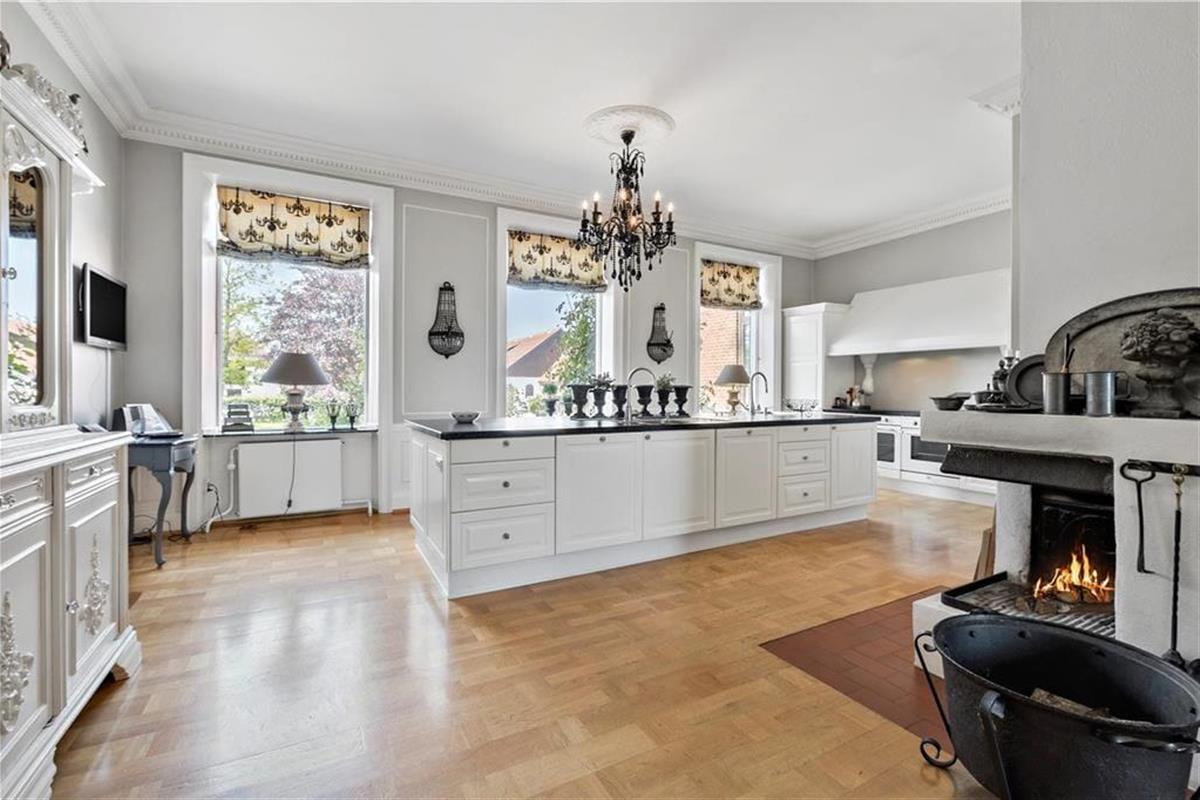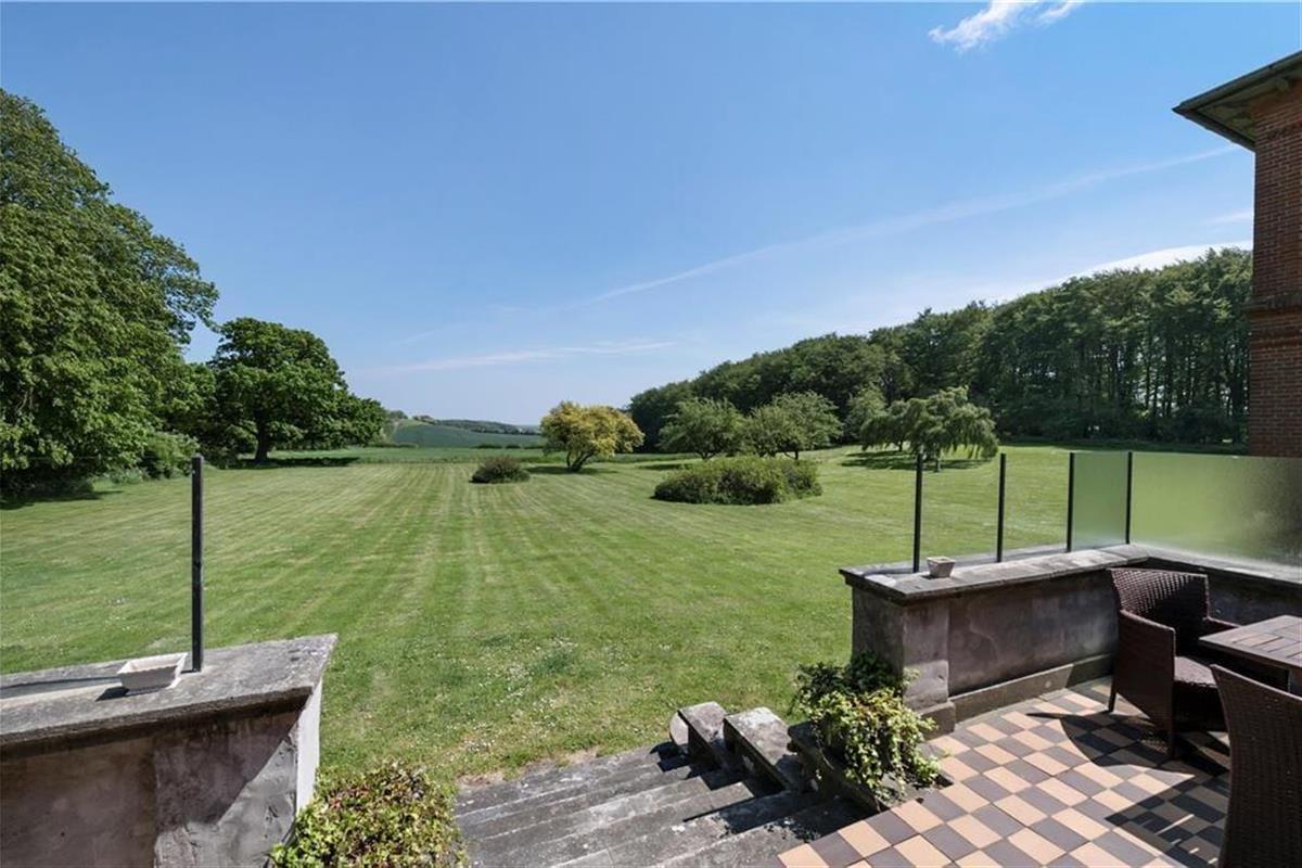 Außerdem ist eine große Halle vorhanden, von der das TV-Zimmer und anschließend der Salon betreten wird, in dem Sie sich zu einem Drink vor dem Abendessen treffen können. Im Billardzimmer gibt es ebenfalls eine hauseigene Bar mit Blick über den Garten, Felder und den Langelandbelt in der Ferne. Des Weiteren steht eine Küche im Landhausstil mit offenem Kamin zur Verfügung. In der Erweiterung der Küche befindet sich das Esszimmer. Der Wintergarten bietet Zugang zu einer Ostterrasse. Außerdem sind eine Küche zum Anrichten sowie ein Hauswirtschaftsraum vorhanden.
