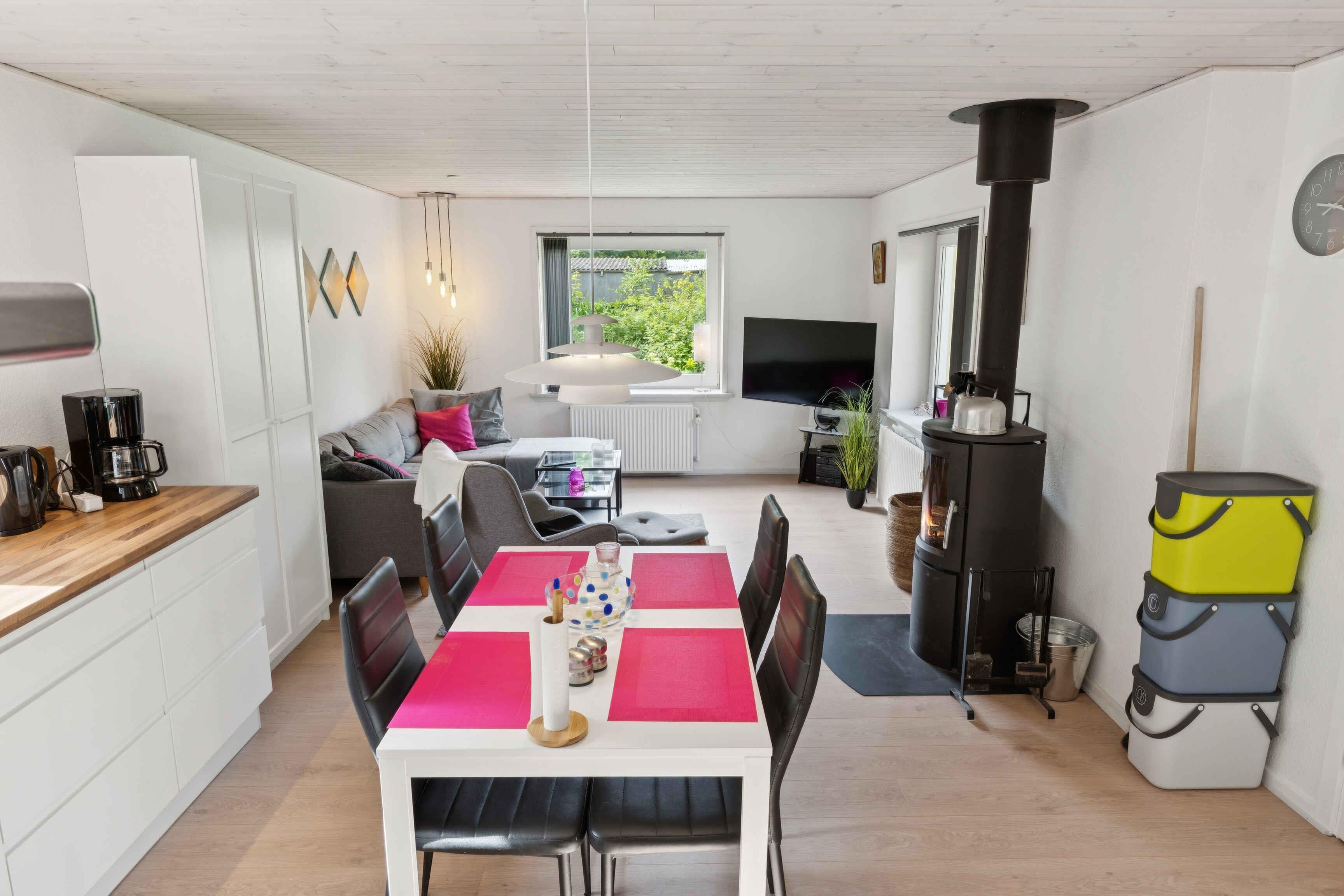Dit vakantiehuis van 96 m² is een uitstekende keuze voor een ontspannen vakantie met familie of vrienden. Het huis beschikt over twee slaapkamers en vier slaapplaatsen, en biedt een fijne basis met rust en ruimte om van de vakantie te genieten – zowel binnen als buiten. De inrichting is eenvoudig en persoonlijk met een open keuken- en eetruimte, een goede eethoek en een woonkamer. Vanuit de woonkamer is er directe toegang tot een terras waar je van de zon en maaltijden in de open lucht kunt genieten. Het huis is uitgerust met zowel een wasmachine als een vaatwasser, zodat praktische zaken tijdens de vakantie soepel verlopen. Brandhout is gratis beschikbaar. De ligging nodigt uit tot een natuurvakantie in Noord-Jutland. Je bent dicht bij de winkels van Hjørring, maar toch ver genoeg van verkeer en lawaai. In de omgeving kun je wandelen, fietsen en genieten van de natuur in rustige omstandigheden. 14 km naar het westen ligt de Noordzee met enkele van de mooiste zandstranden van Denemarken. Het zwemwater is helder en er is volop ruimte om te spelen, te ontspannen en lange wandelingen te maken. In de omgeving vind je ook charmante kustplaatsen zoals Lønstrup en Løkken met kunstambachten, ijsstalletjes en gezellige cafés. Het vakantiehuis is geschikt voor wie op zoek is naar een rustige omgeving en een goed vertrekpunt om het beste van Noord-Jutland te ontdekken. Je zit hier nooit ver van stad of natuur – en je kunt je vakantie helemaal naar eigen wens invullen. Let op: Niet te huur voor commercieel gebruik.