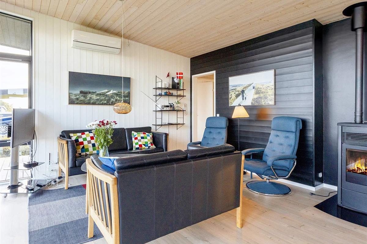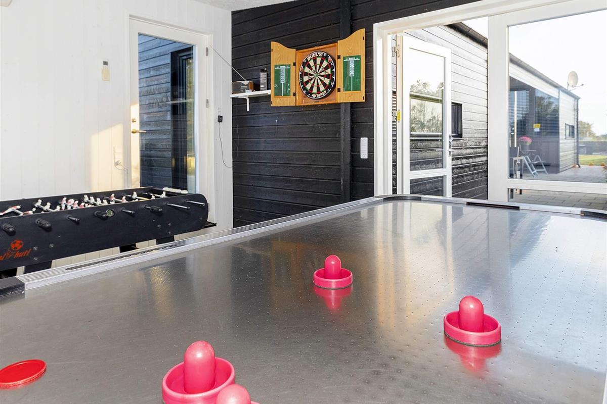 Zum Zeitvertreib wurde ein sogenannter Aktivitätsbereich mit Tischfußball, Airhockey und Darts eingerichtet. Außerdem vier Schlafzimmer mit je einem Doppelbett und durchgehend moderne Einrichtung im Haus. Es stehen zwei Bäder mit Dusche/WC und angenehmer Fußbodenheizung bereit. Außerdem gut ausgestattete Küche, inklusive moderner Spülmaschine mit Touchpad, Mikrowelle, Ceranfeld, Gefrier- und Kühlschrank.