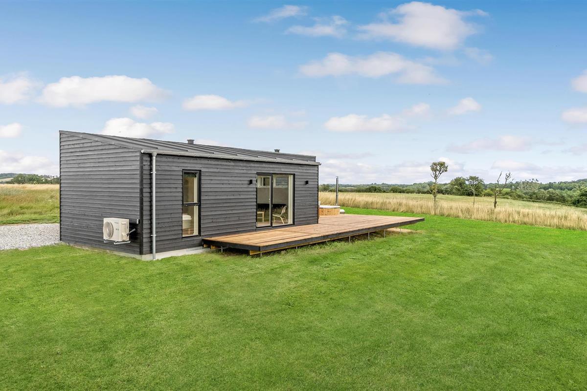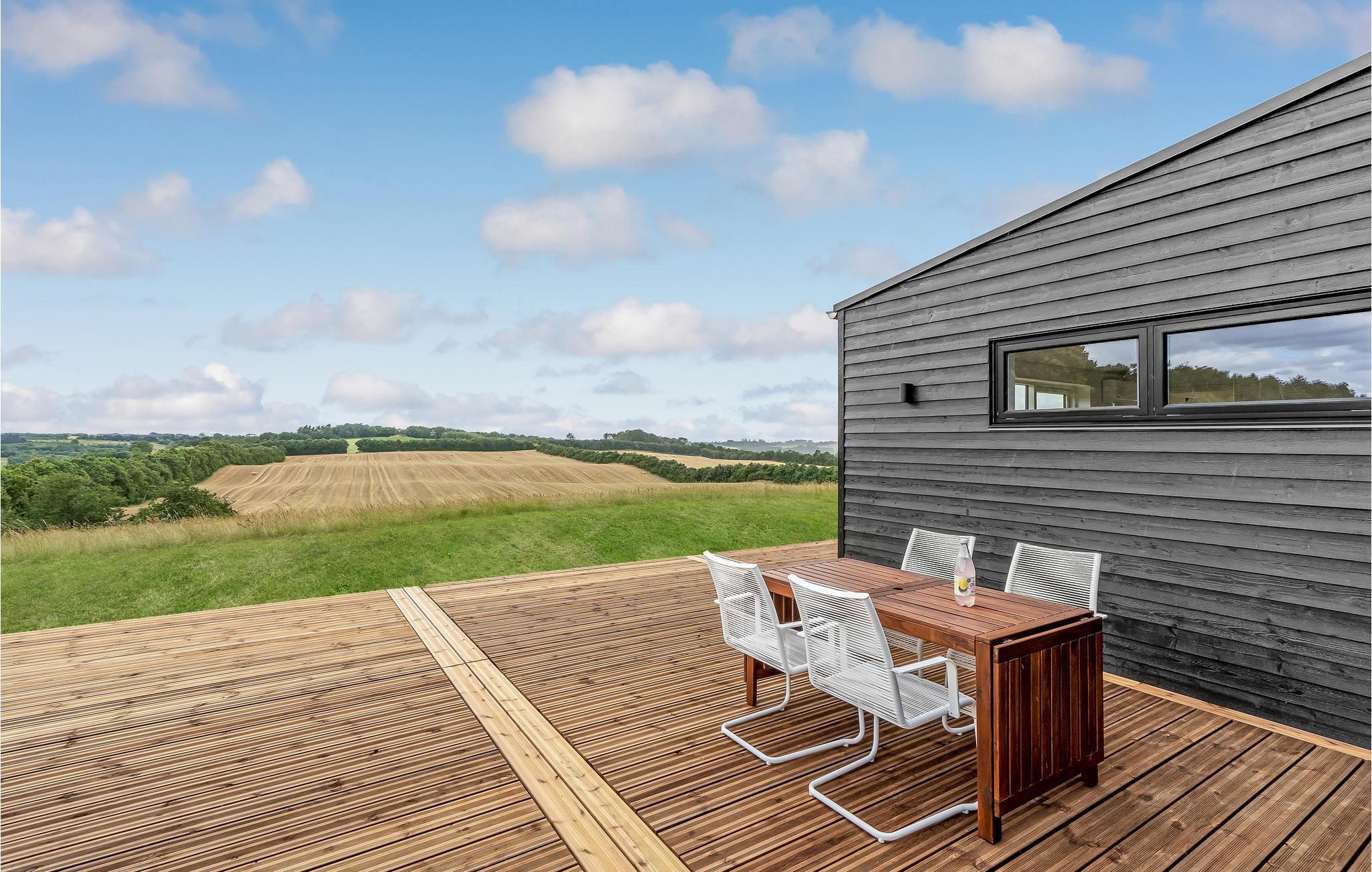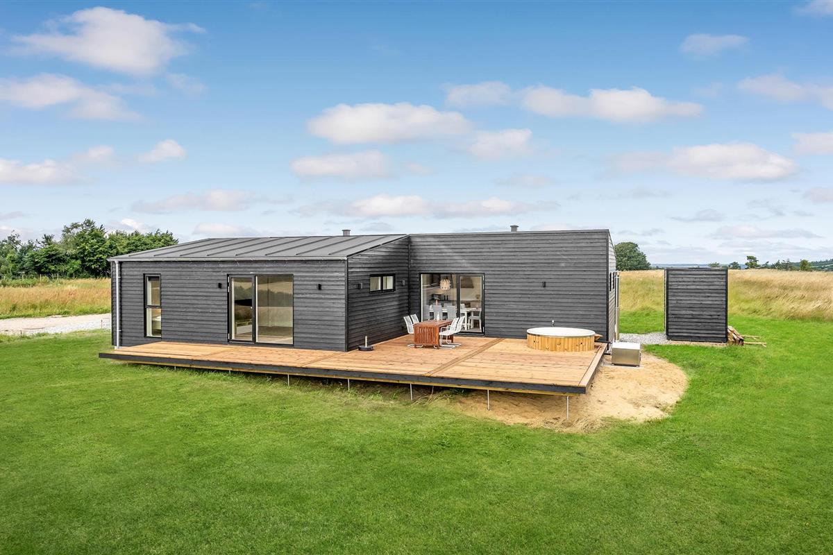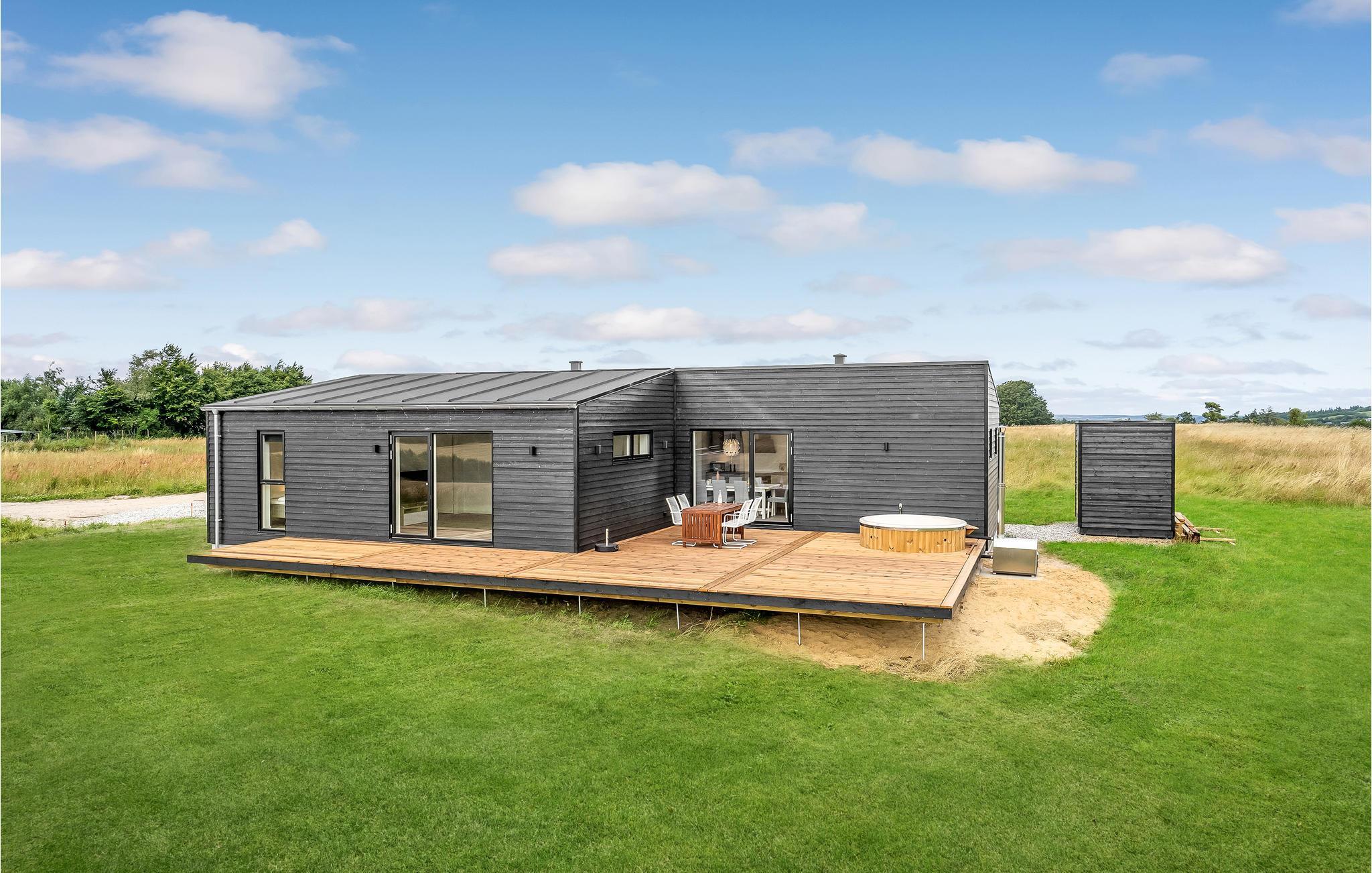 Modern vakantiehuis in Hjarbæk met Finse houten badkamer en terras voor ontspanning.