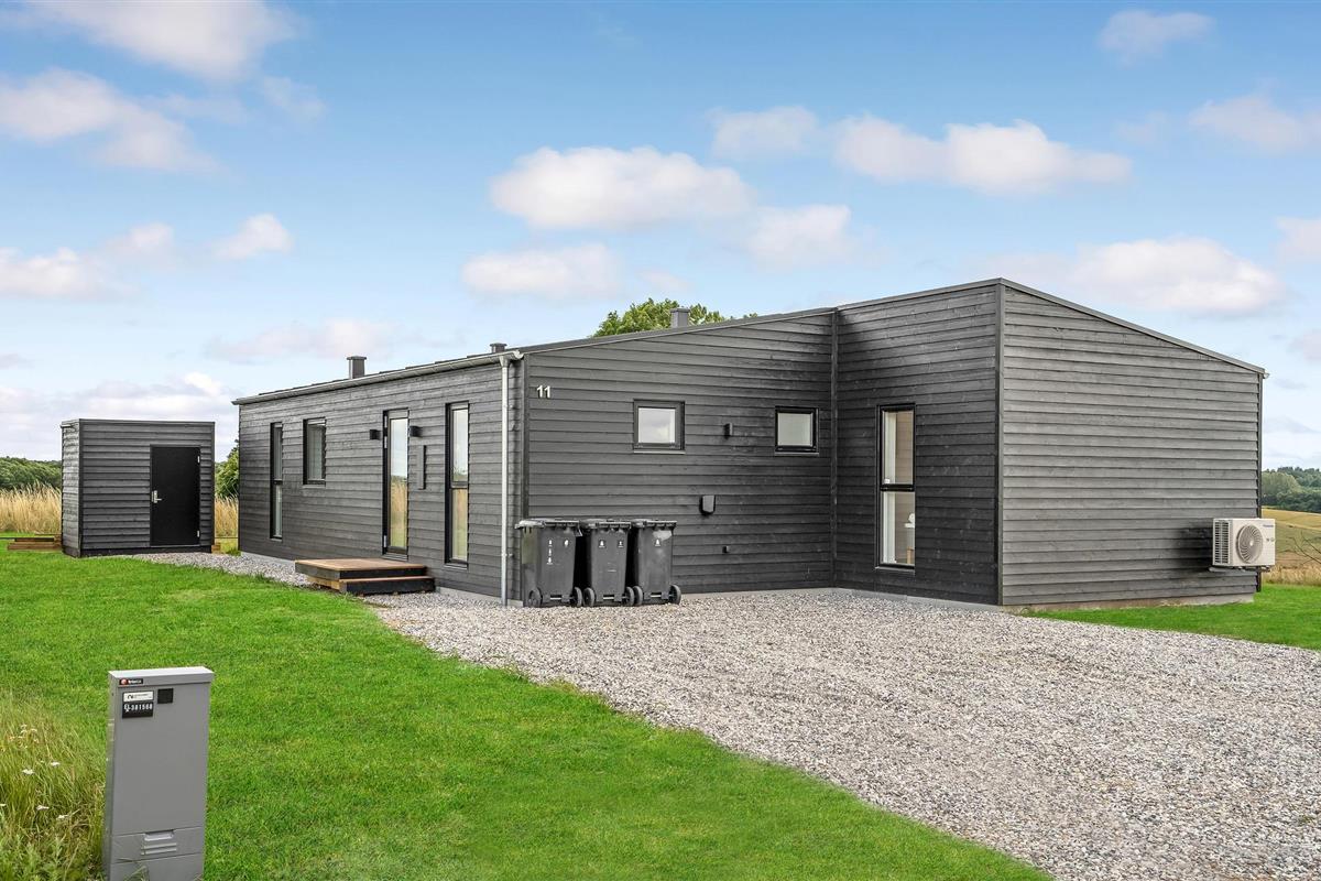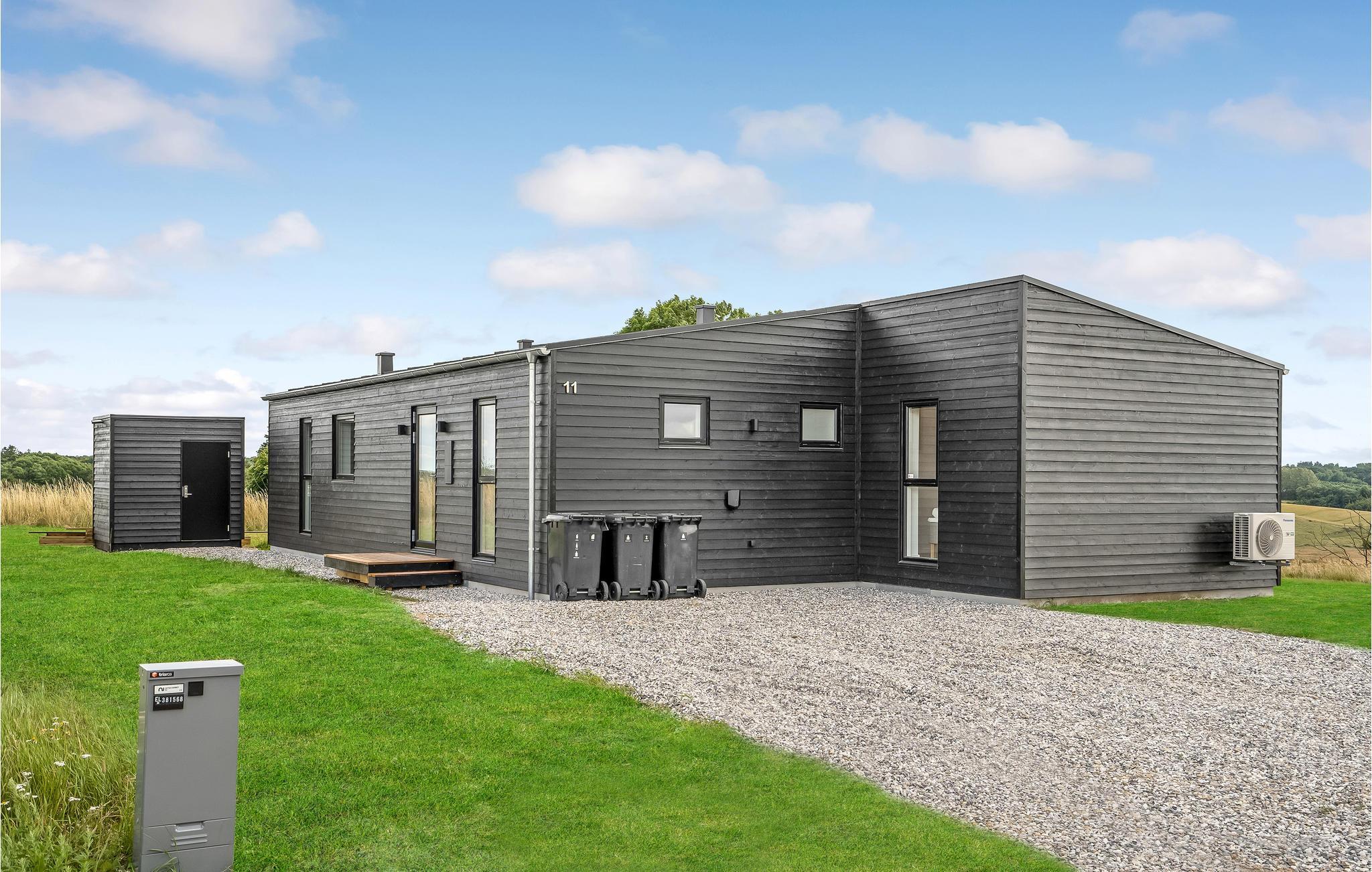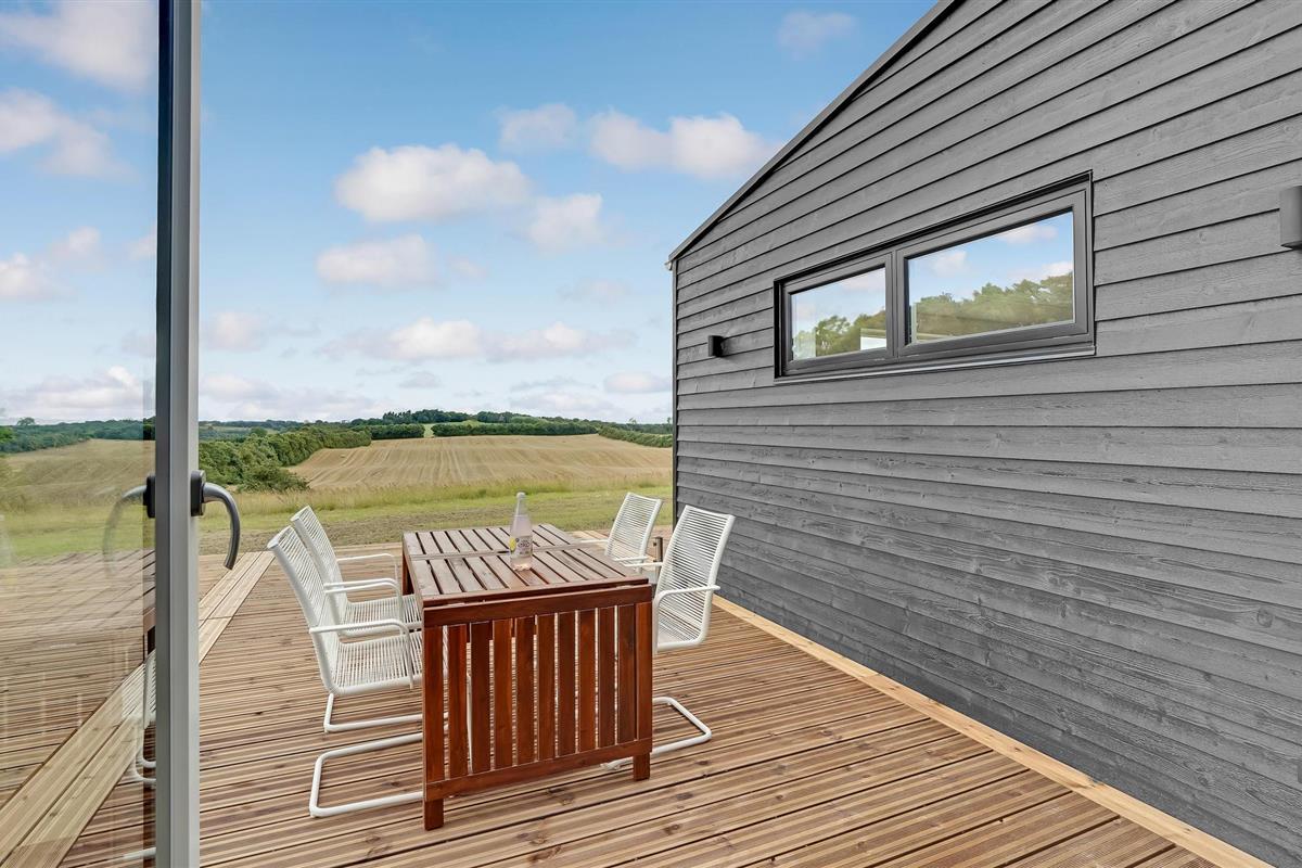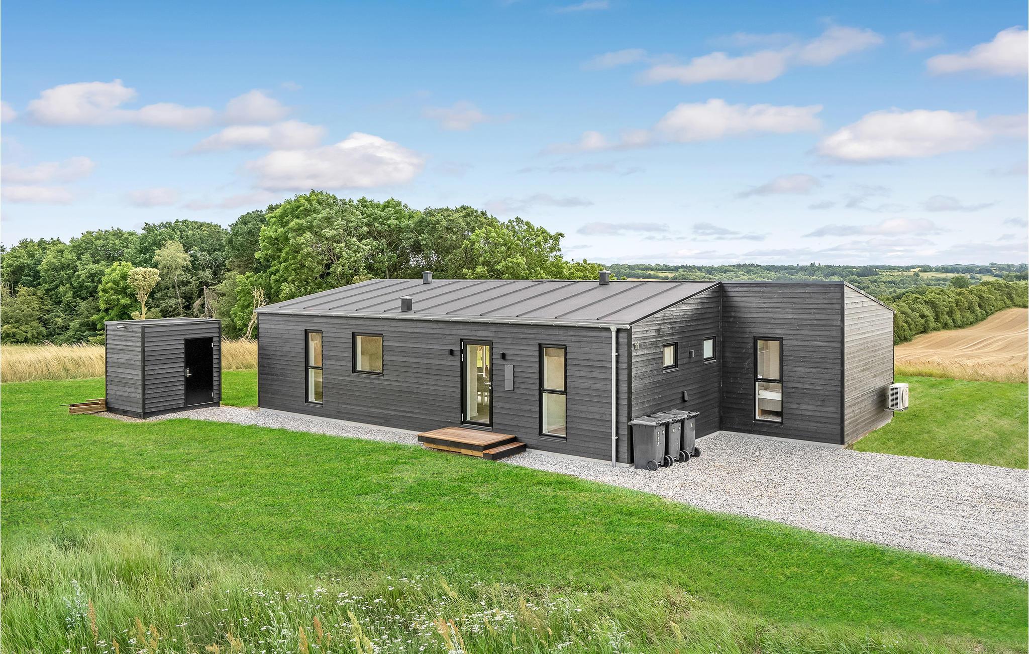 Modern vakantiehuis in Hjarbæk met Finse houten badkamer en terras voor ontspanning.