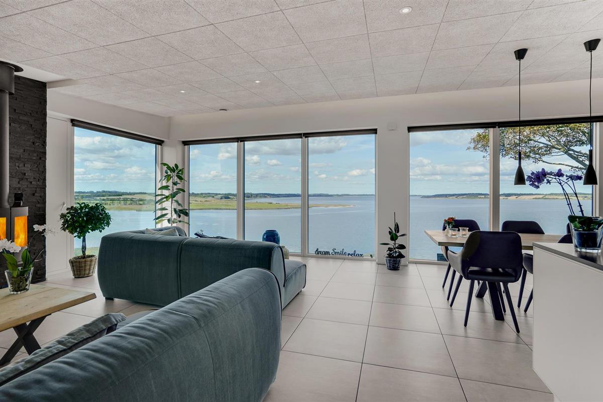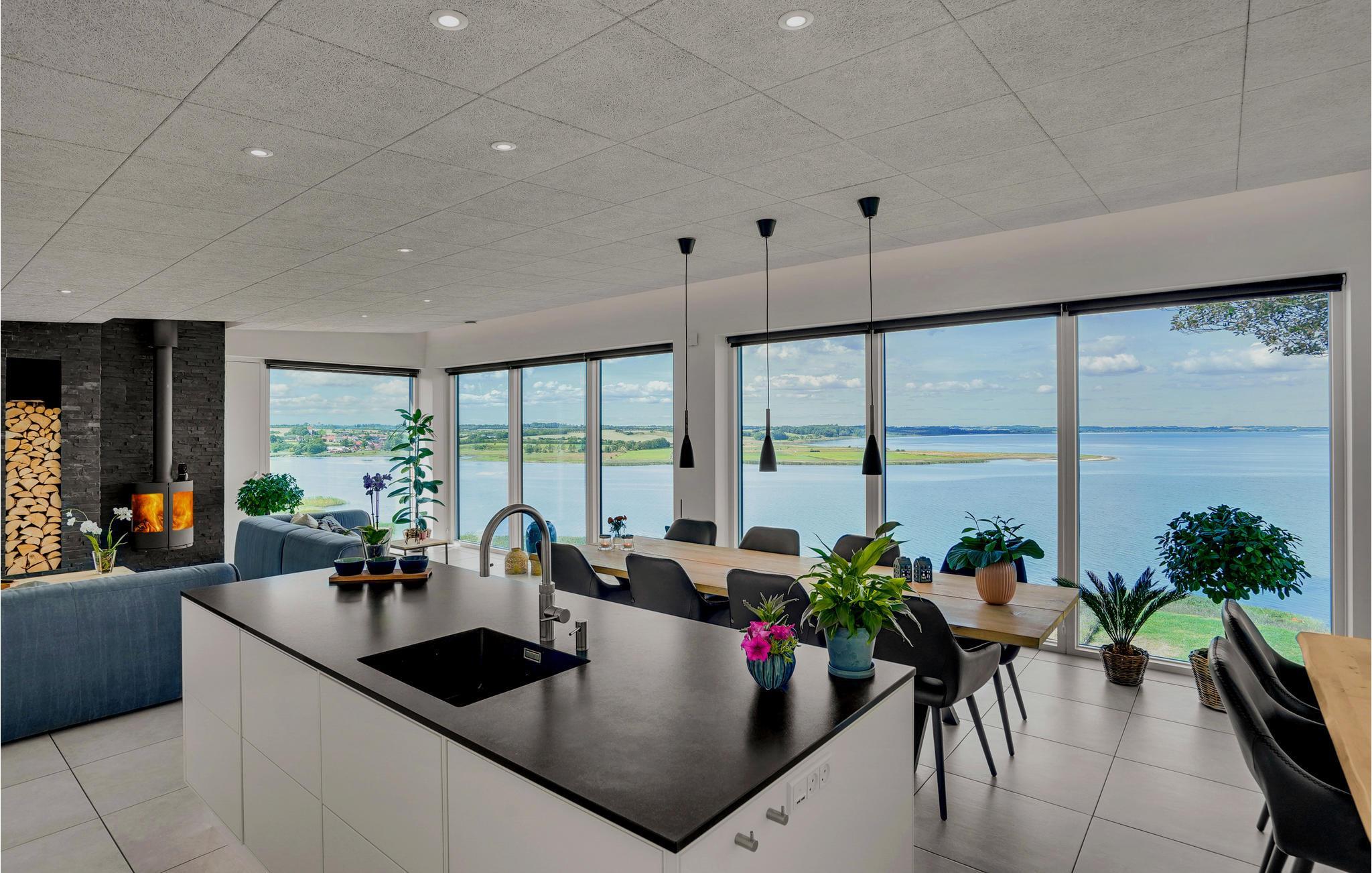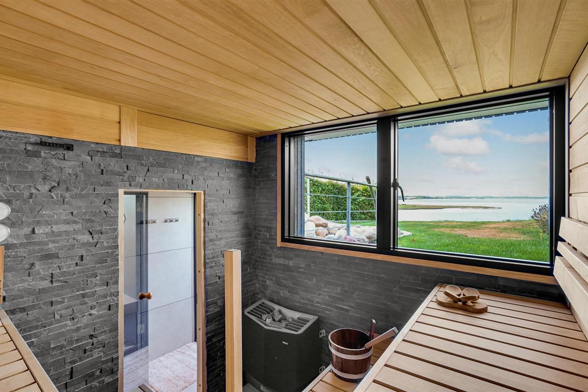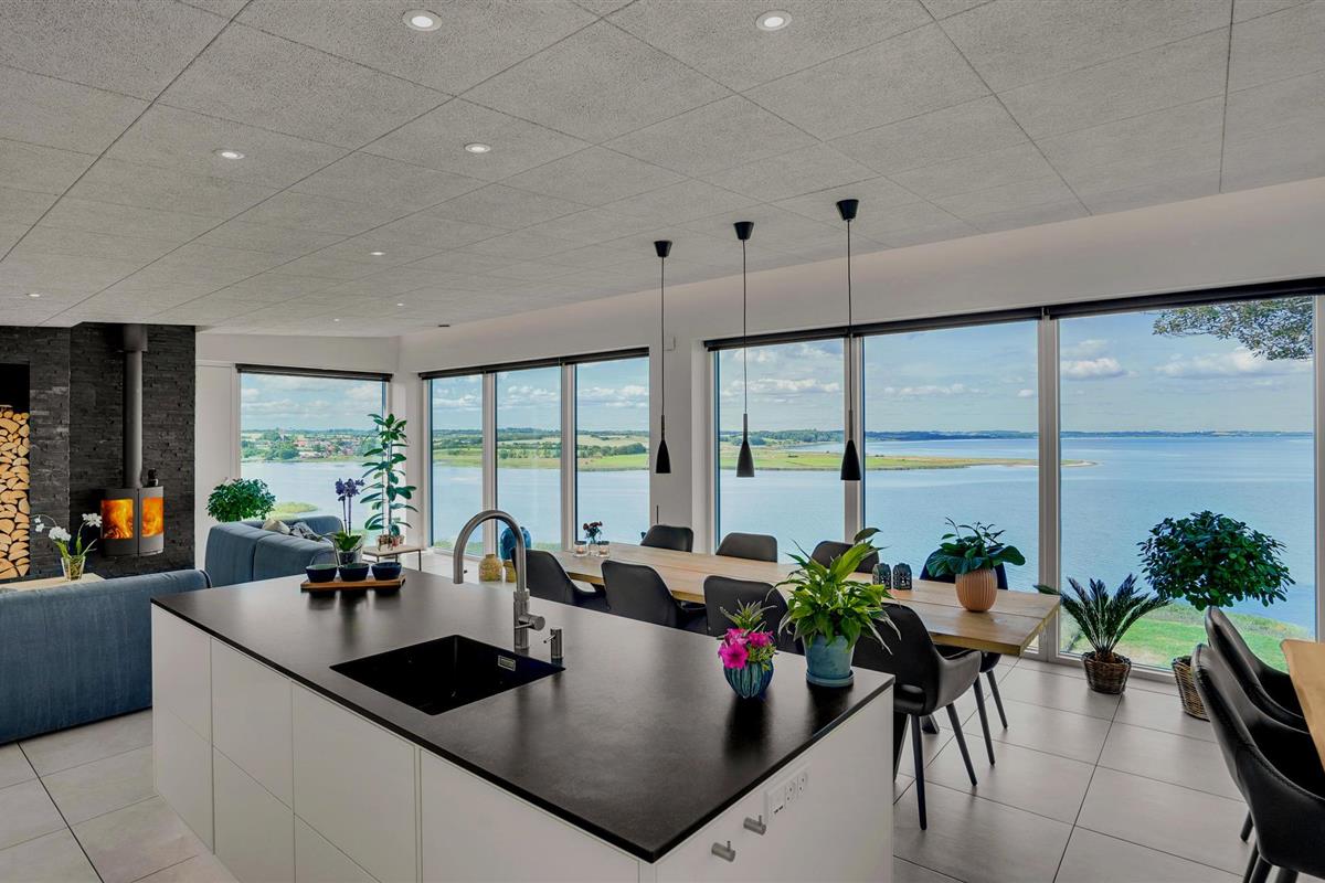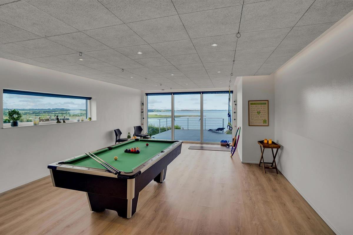 Door de ingenieuze manier waarop het huis in het terrein is gebouwd, heb je een uitzicht van meer dan 180 graden over het fjord en het landschap, waarvan je kunt genieten vanuit de keuken en woonkamer op de bovenverdieping, maar ook vanuit de activiteitenruimte met biljart, waarop ook tafeltennistafels kunnen worden geplaatst, en de wellnessruimte op de benedenverdieping, die onder andere een infraroodsauna biedt.