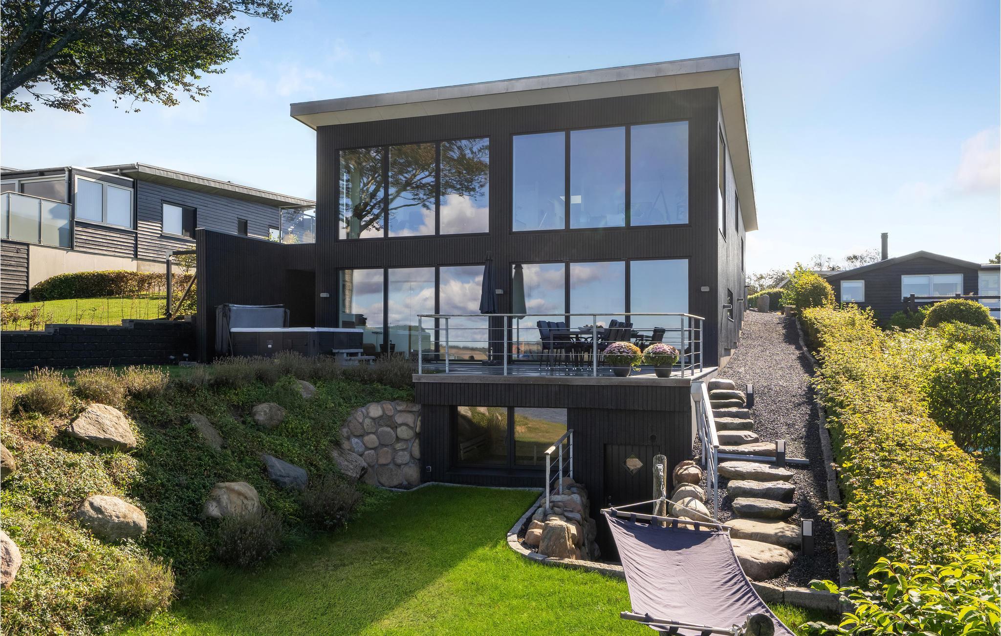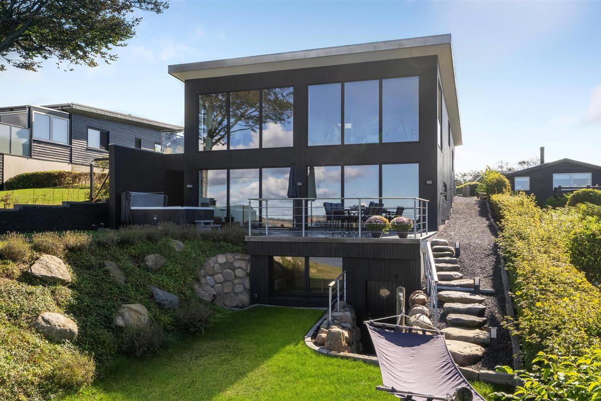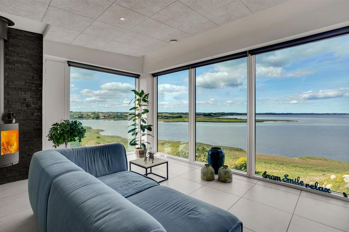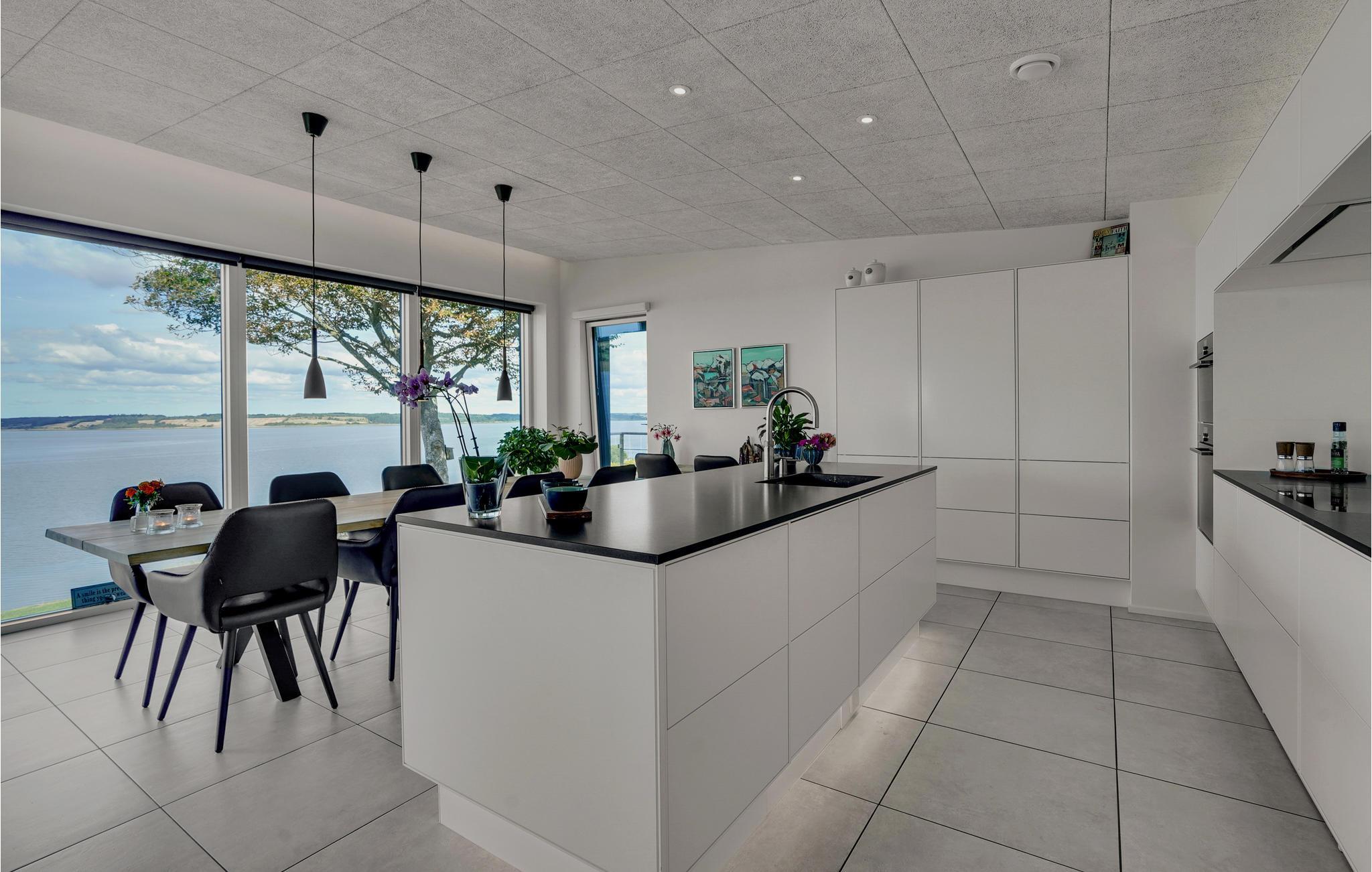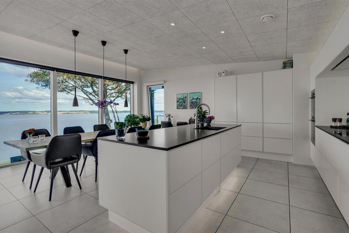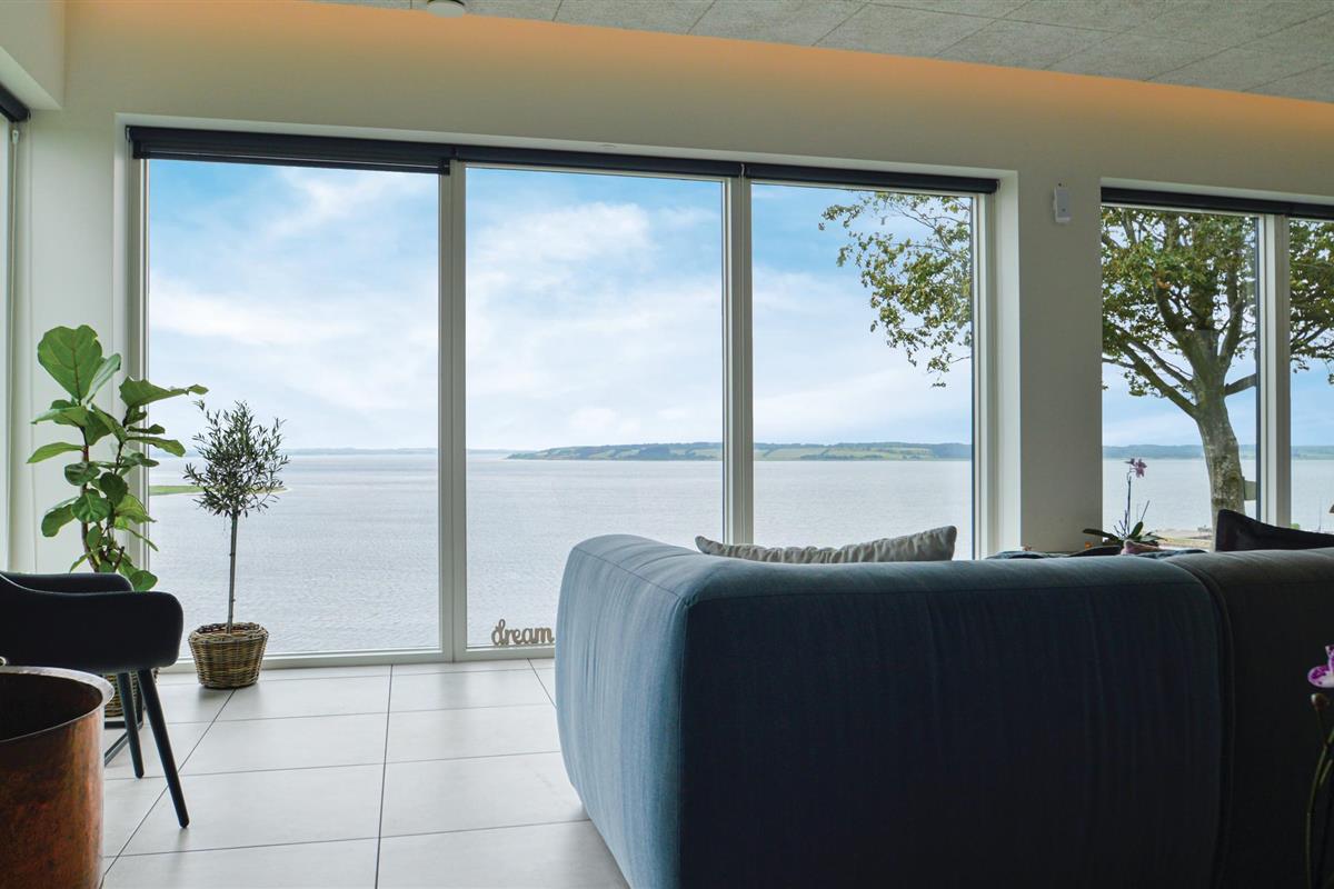 Door de ingenieuze manier waarop het huis in het terrein is gebouwd, heb je een uitzicht van meer dan 180 graden over het fjord en het landschap, waarvan je kunt genieten vanuit de keuken en woonkamer op de bovenverdieping, maar ook vanuit de activiteitenruimte met biljart, waarop ook tafeltennistafels kunnen worden geplaatst, en de wellnessruimte op de benedenverdieping, die onder andere een infraroodsauna biedt.
