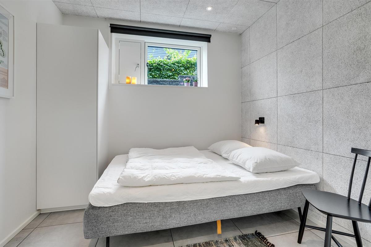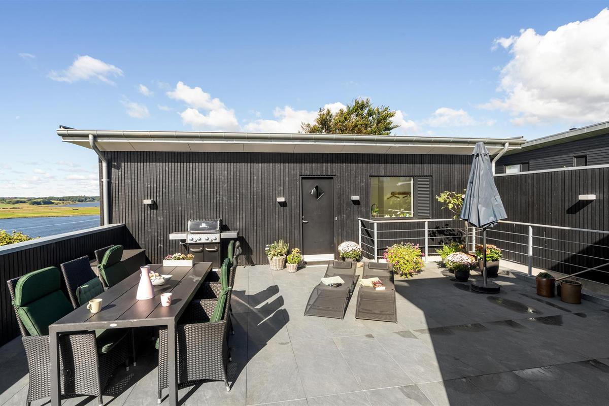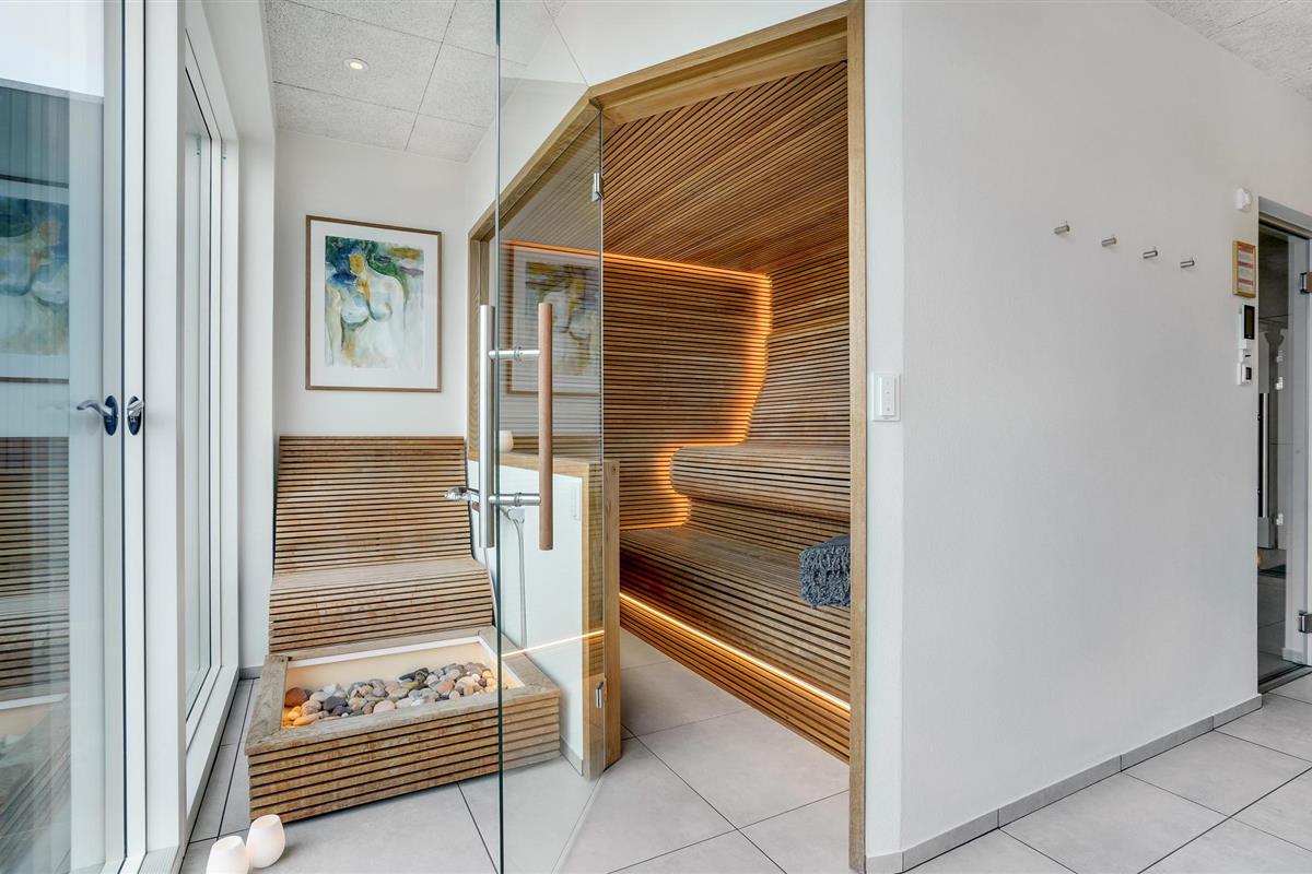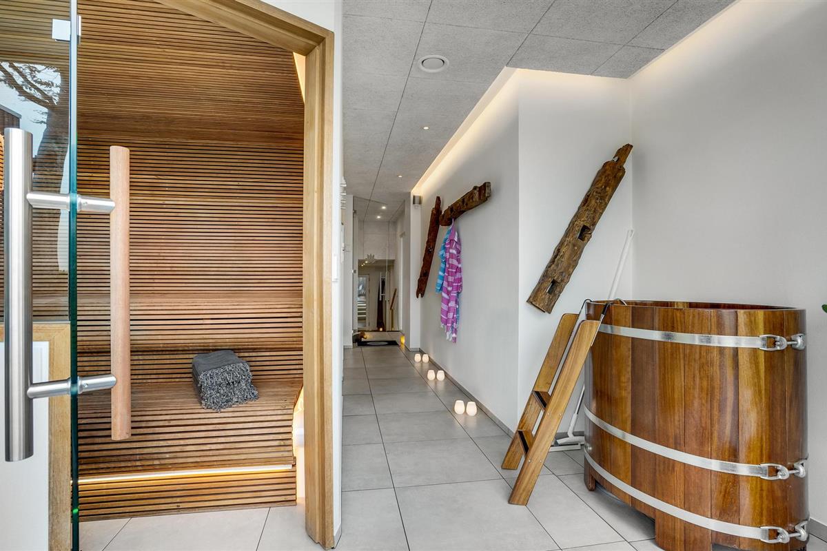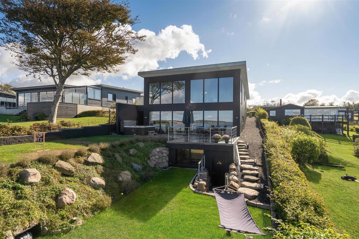 Door de ingenieuze manier waarop het huis in het terrein is gebouwd, heb je een uitzicht van meer dan 180 graden over het fjord en het landschap, waarvan je kunt genieten vanuit de keuken en woonkamer op de bovenverdieping, maar ook vanuit de activiteitenruimte met biljart, waarop ook tafeltennistafels kunnen worden geplaatst, en de wellnessruimte op de benedenverdieping, die onder andere een infraroodsauna biedt.