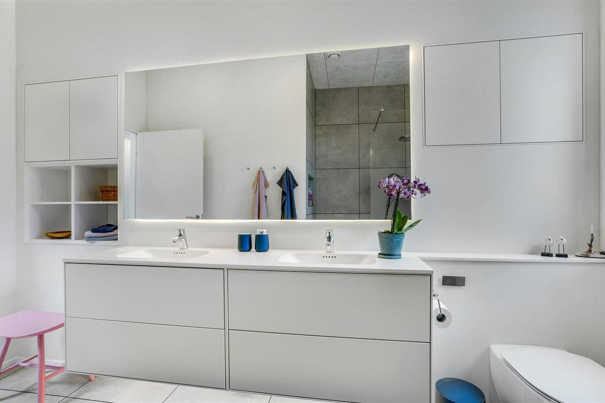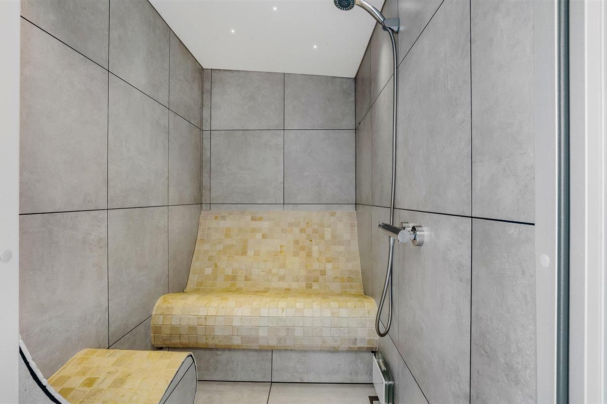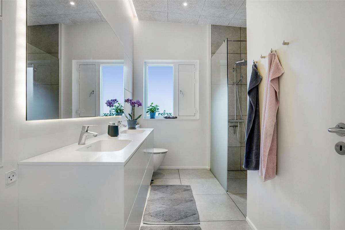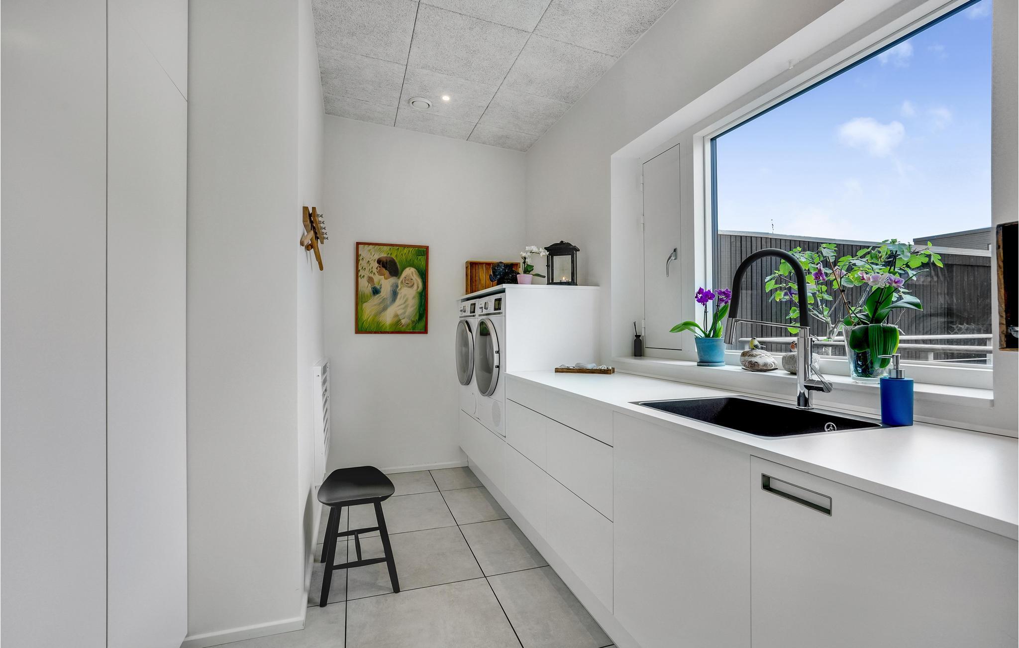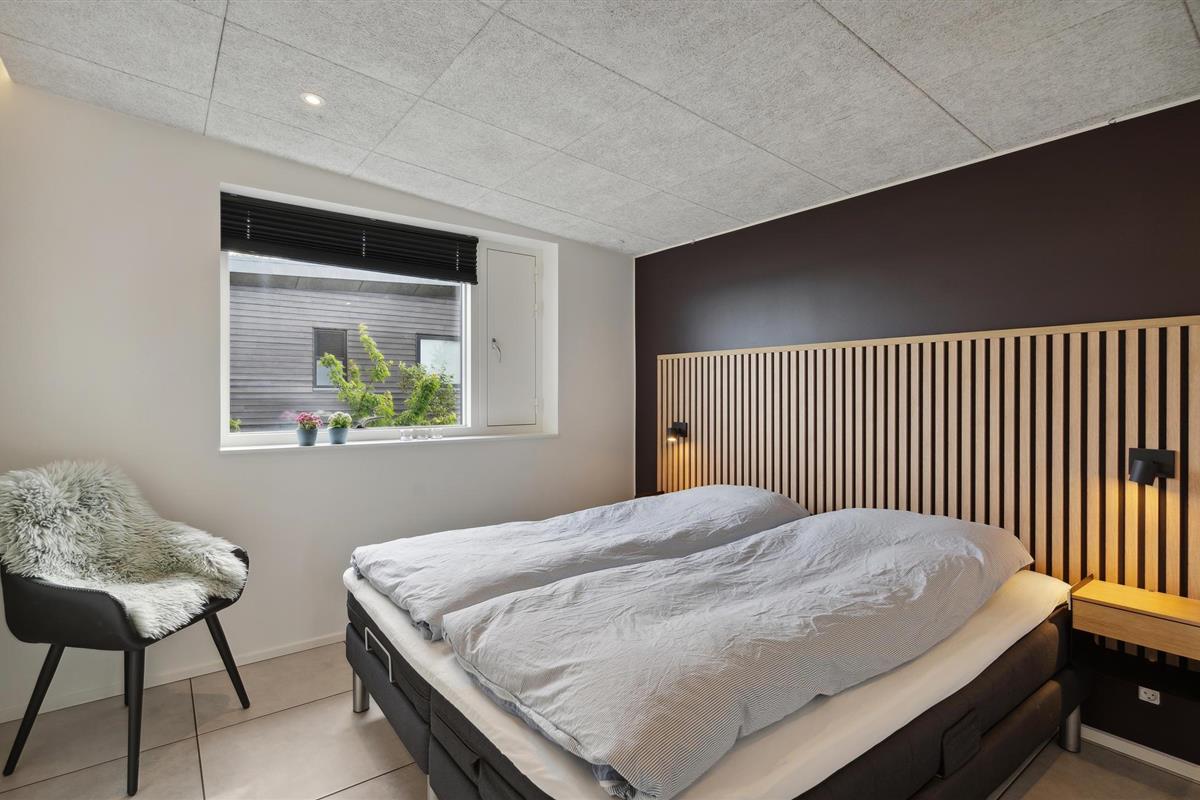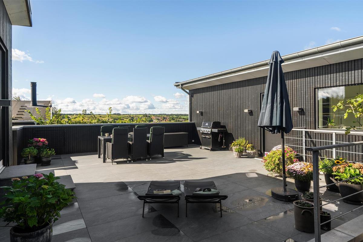 Door de ingenieuze manier waarop het huis in het terrein is gebouwd, heb je een uitzicht van meer dan 180 graden over het fjord en het landschap, waarvan je kunt genieten vanuit de keuken en woonkamer op de bovenverdieping, maar ook vanuit de activiteitenruimte met biljart, waarop ook tafeltennistafels kunnen worden geplaatst, en de wellnessruimte op de benedenverdieping, die onder andere een infraroodsauna biedt.