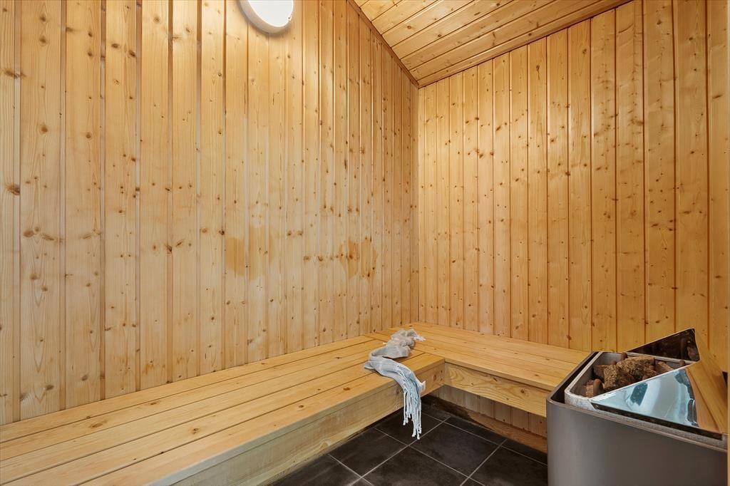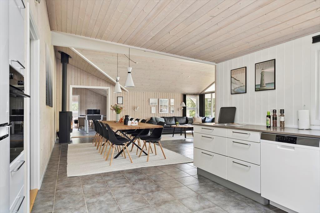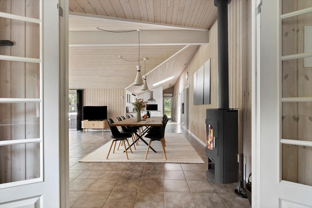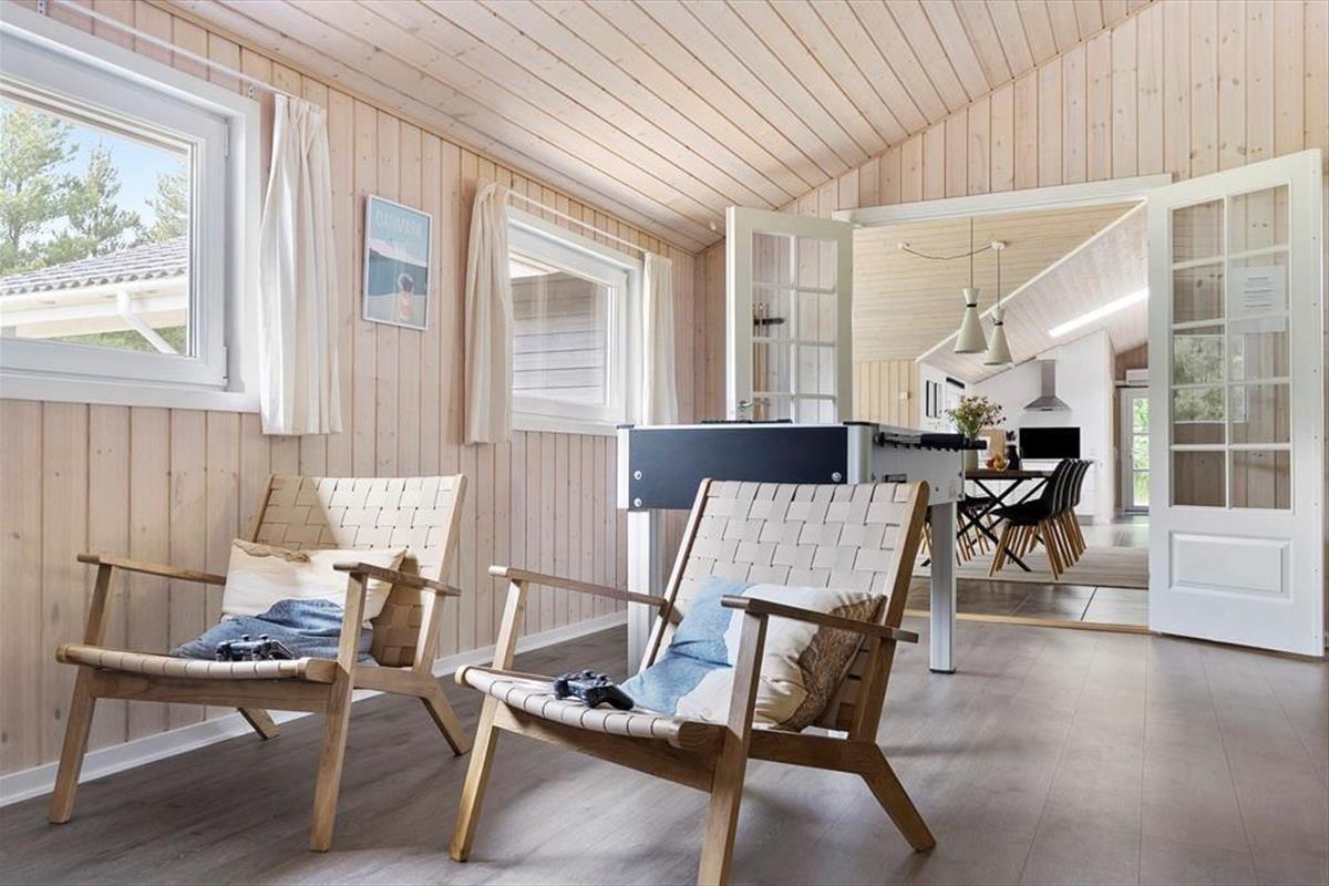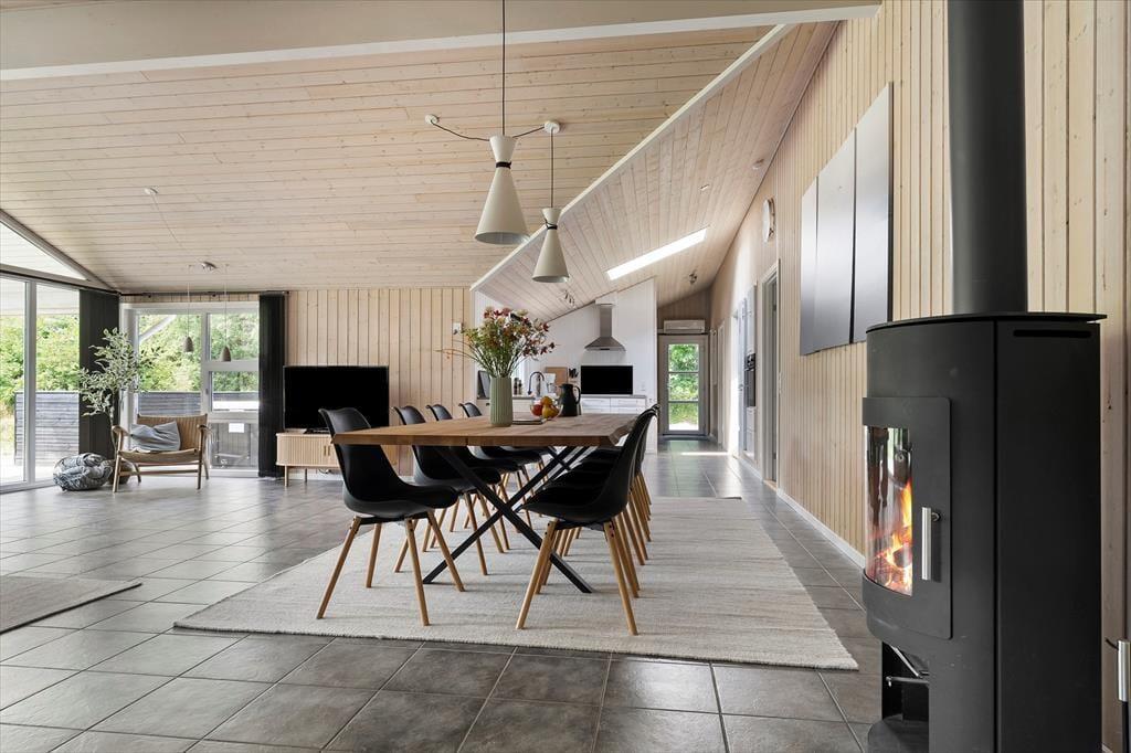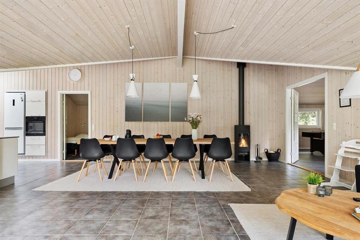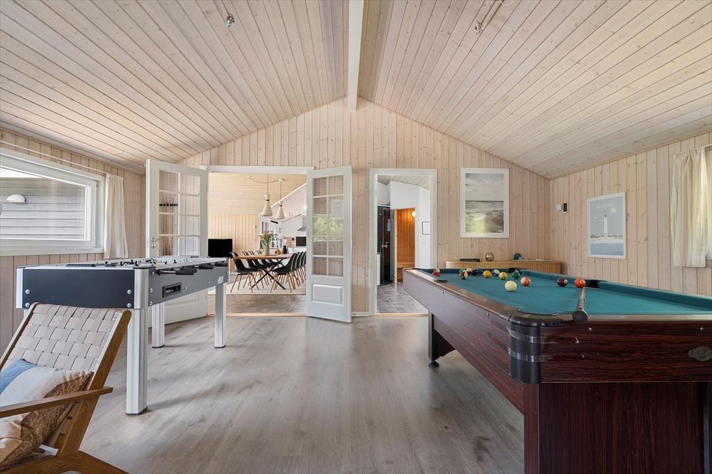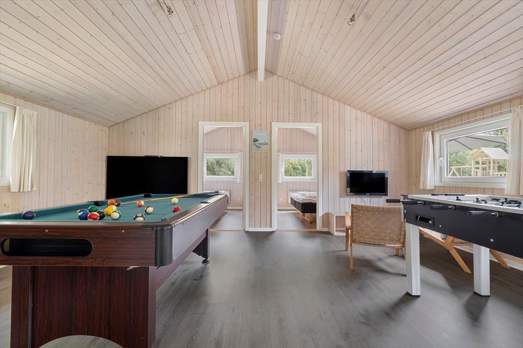 Vom Eingangsbereich gelangen Sie direkt in den Aufenthaltsraum, der sich offen aus dem Wohnraum und der Küche zusammensetzt. Der große, einladende Raum beinhaltet einen langen Esstisch, eine Polstersitzgruppe und einen Kaminofen. In diesem gemütlich und geschmackvoll eingerichteten Raum werden Sie sich gerne alle gemeinsam aufhalten und die Mahlzeiten zusammen genießen. Im Aktivitätsraum können Sie Tischtennis-, Tischkicker- und Billardturniere veranstalten. Wer es lieber entspannter angehen lässt, der zieht sich in den Whirlpool oder in die Sauna zurück im größeren der beiden Badezimmer. Beide Bäder verfügen über eine Duschnische. Zu den nicht ganz so offensichtlichen Annehmlichkeiten zählt die Fußbodenheizung, die sich durch fast das gesamte Haus erstreckt.