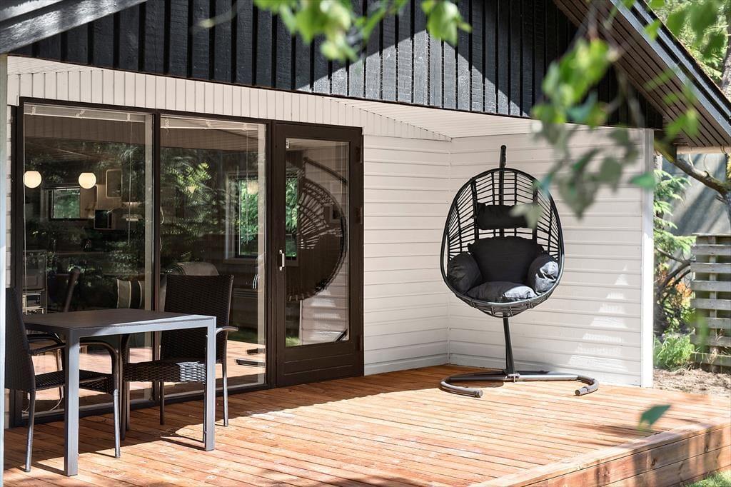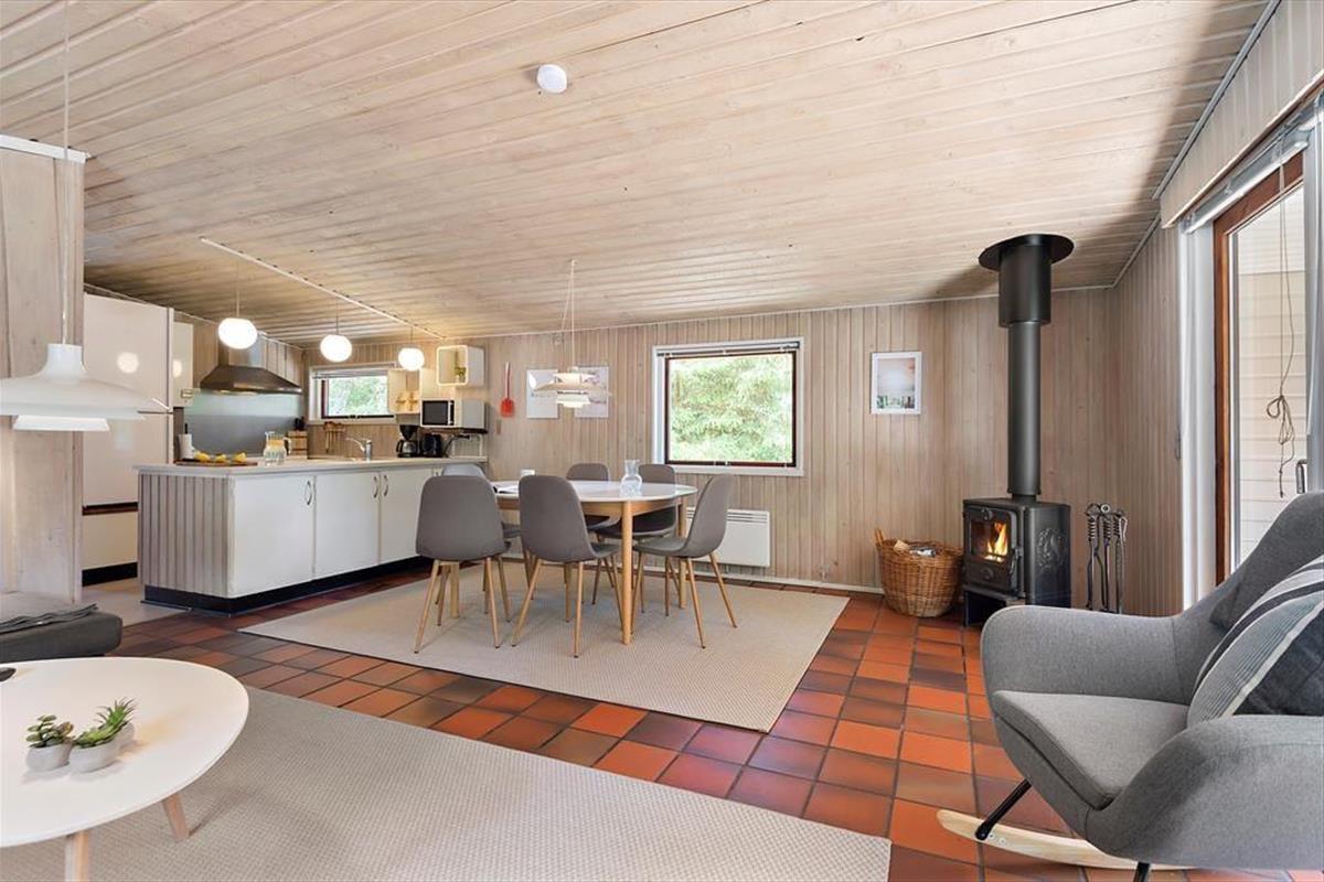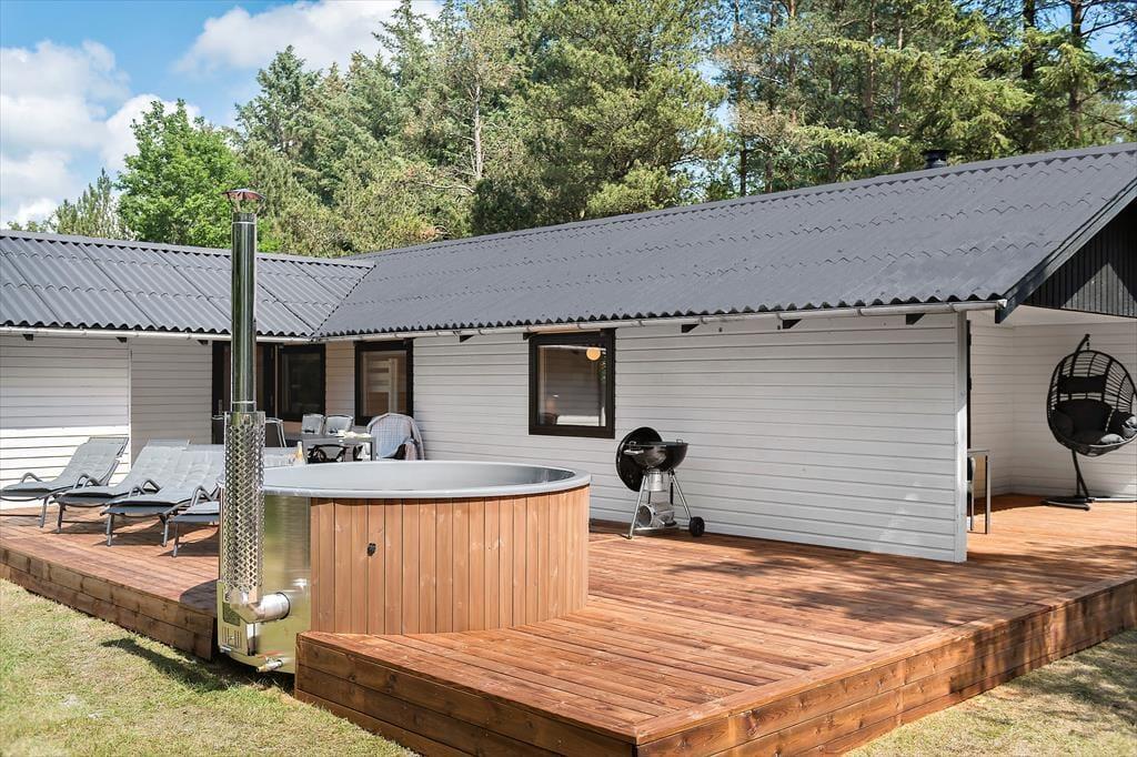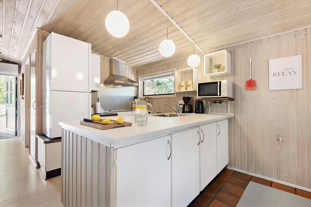 Im Inneren des Ferienhauses wirst du von einer hellen Einrichtung und einer gemütlichen Atmosphäre empfangen. Das offene Wohnzimmer mit großen Fenstern lässt das Tageslicht hereinströmen und bietet direkten Zugang zur großen Holzterrasse, wo du das Wildnisbad findest. Abends kannst du die Flammen im Kamin genießen, während du dich mit einem guten Buch oder einem Film entspannst. Die Küche ist original, aber ausgestattet, damit du leckere Mahlzeiten zubereiten kannst, die du mit der Familie am geräumigen Esstisch genießen kannst. Die Schlafzimmer laden zu erholsamen Nächten ein, damit du frisch und ausgeruht in einen weiteren schönen Ferientag starten kannst.