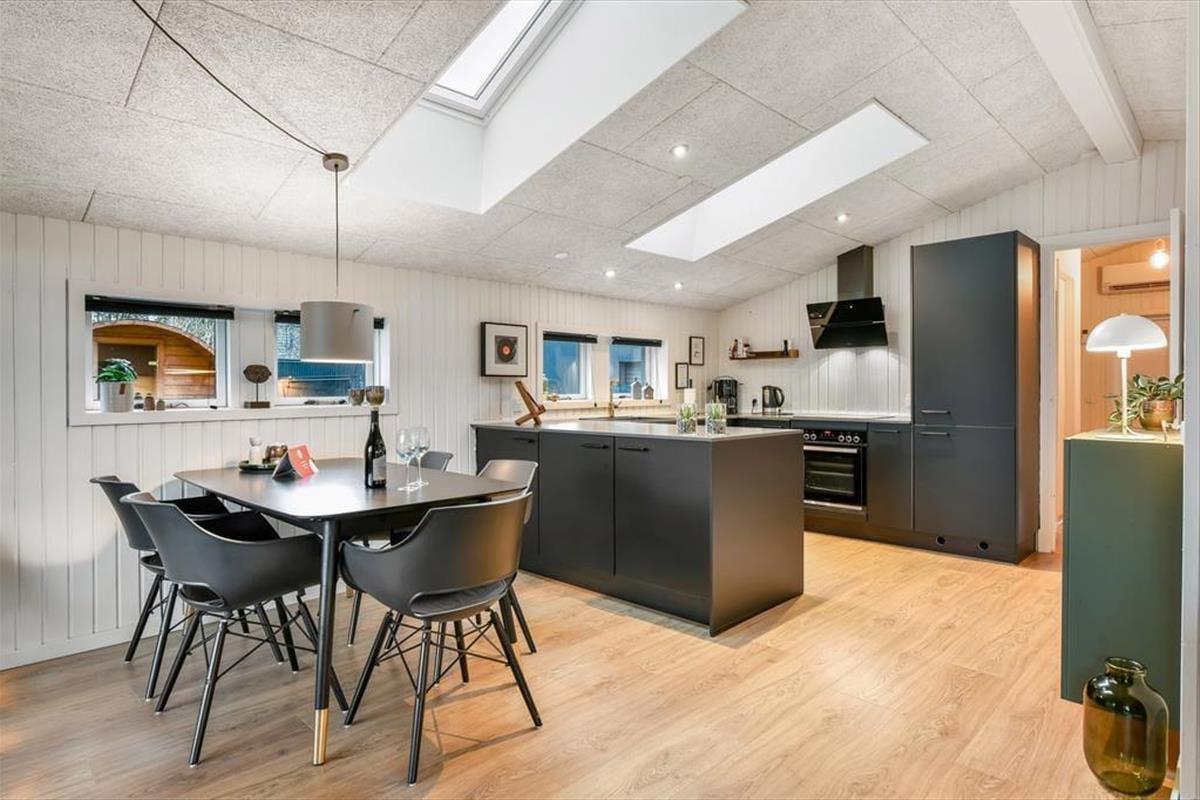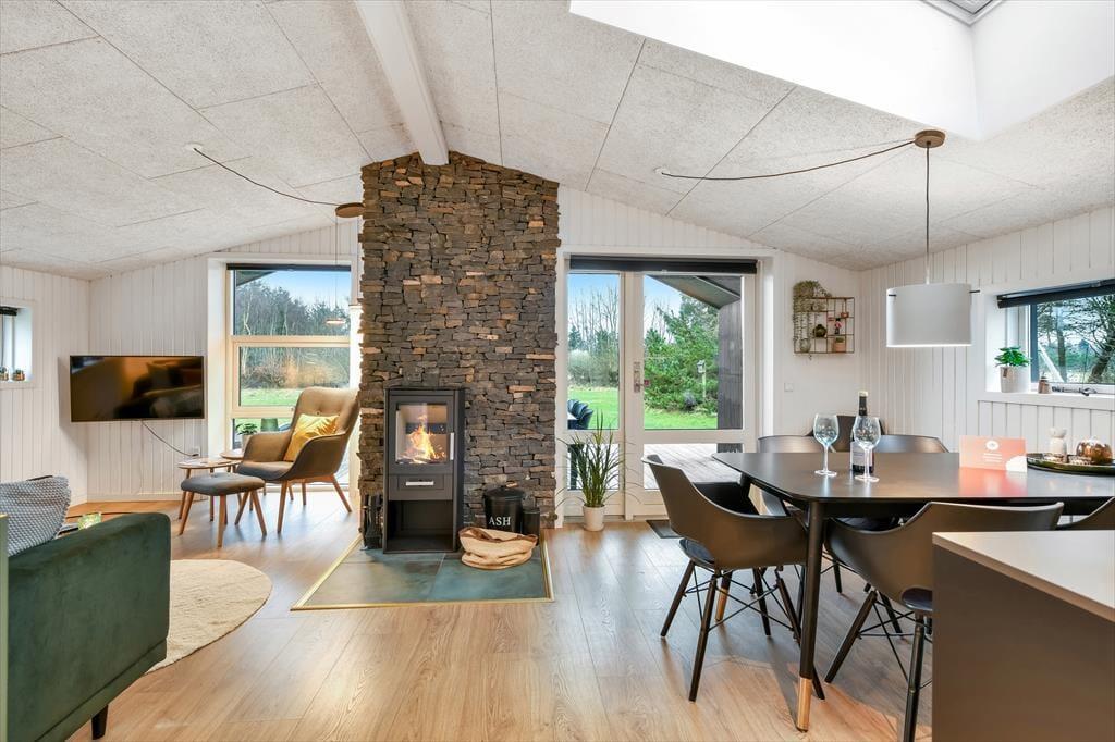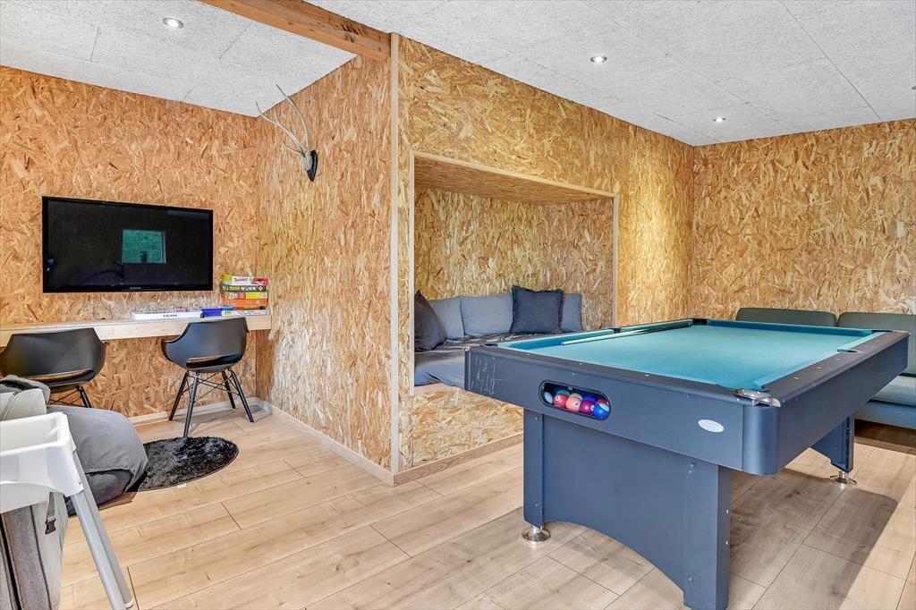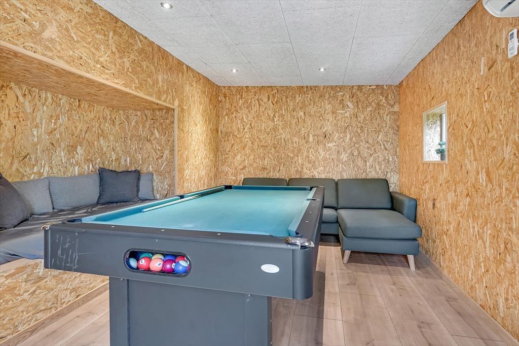 Das Ferienhaus präsentiert sich mit einer einladenden Atmosphäre, die es dir leicht macht, dich vom Moment deines Betretens an wie zu Hause zu fühlen. Die stilvolle Einrichtung kombiniert modernen Komfort mit klassischer Gemütlichkeit und schafft so einen angenehmen Rahmen für deinen Urlaub. Das Haus verfügt über eine gut ausgestattete Küche, in der du leckere Mahlzeiten zubereiten kannst, die du im geräumigen Ess- und Wohnzimmer genießen kannst. Hier gibt es auch Platz, um sich um den Kamin zu versammeln, der besonders an kühleren Abenden eine warme und gemütliche Atmosphäre schafft. Ihr könnt viel Zeit im schönen Aktivitätsraum verbringen, wo du das Billard- und Pooltisch findest, und eine gemütliche Nische bietet die Möglichkeit, in einem guten Buch zu lesen. Ein praktischer Arbeitsplatz stellt sicher, dass du alltägliche Aufgaben auch im Urlaub problemlos erledigen kannst, oder die Kinder können hier sitzen, um zu zeichnen oder einen Film anzusehen.