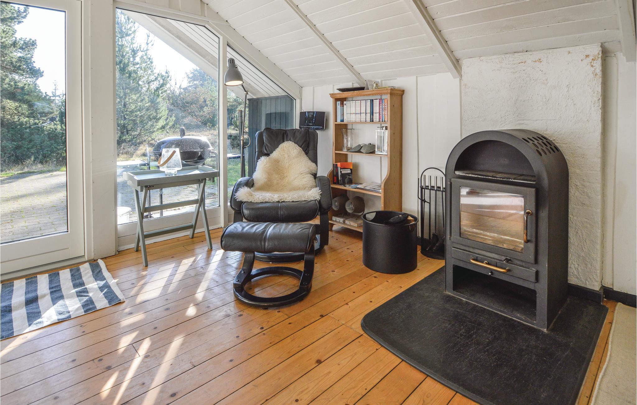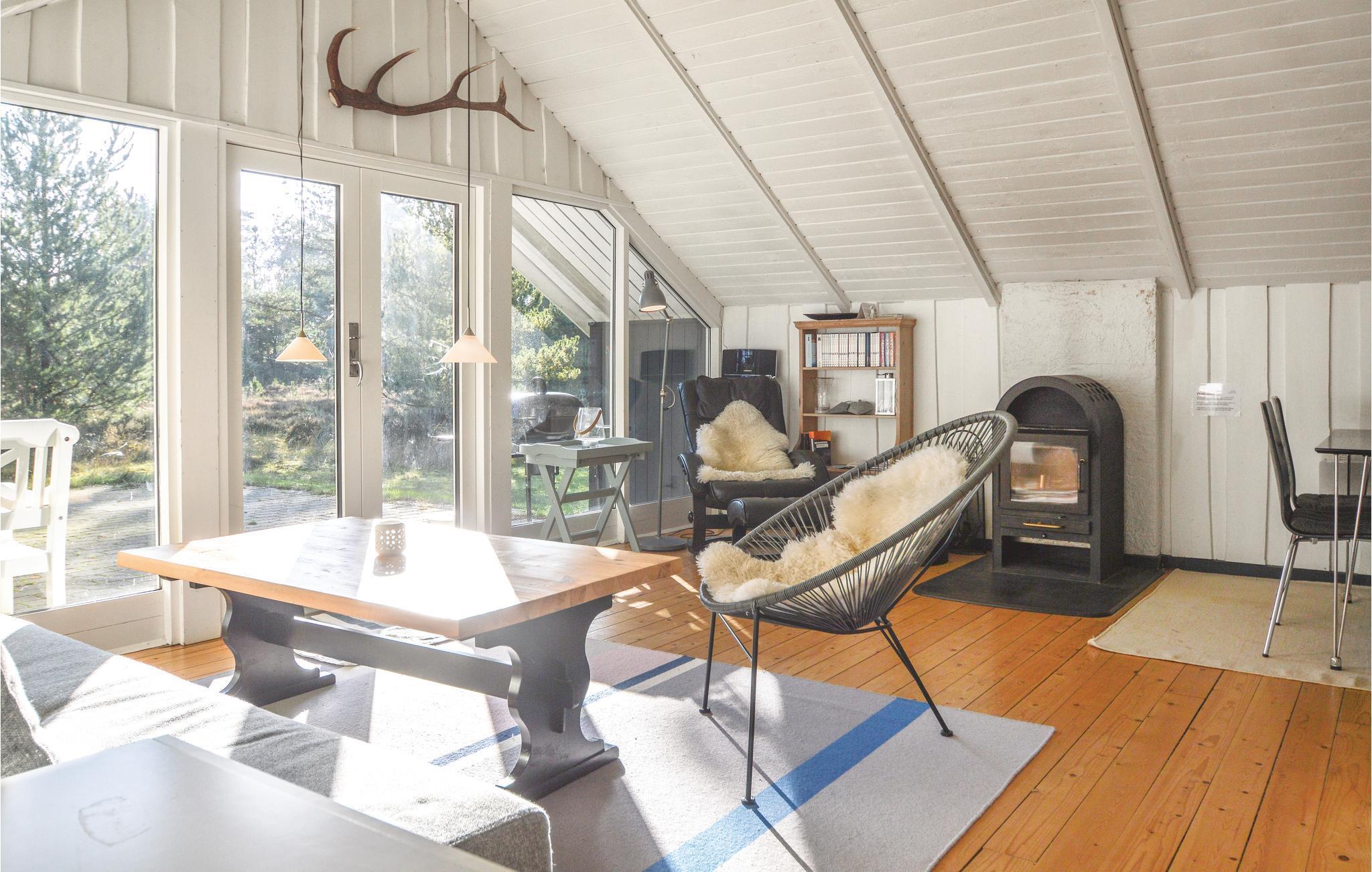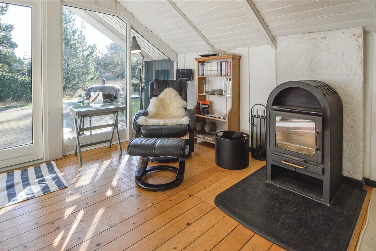 Traditioneel vakantiehuis in Blåvand met licht interieur, houtkachel en groot terras aan een natuurlijke tuin.