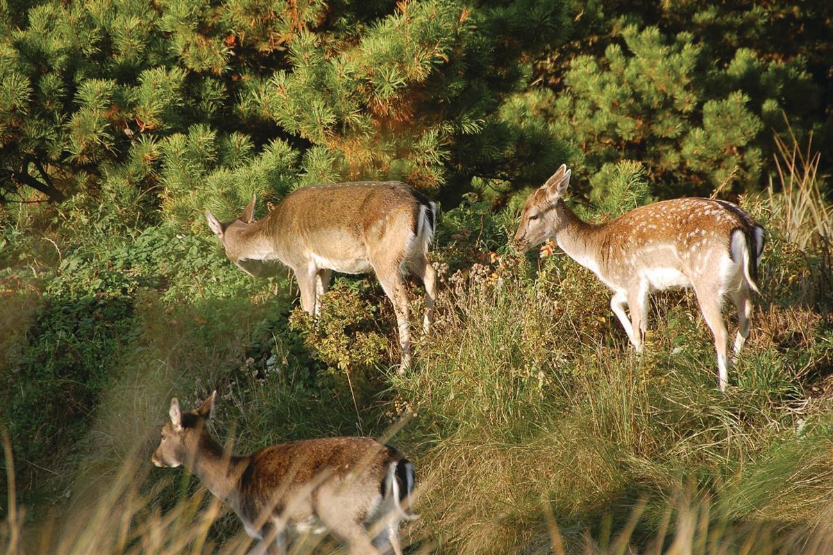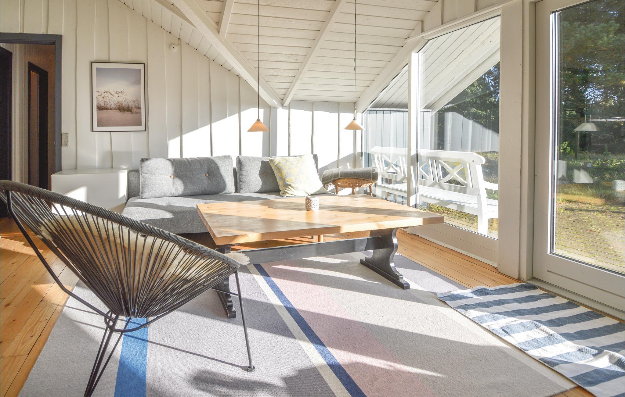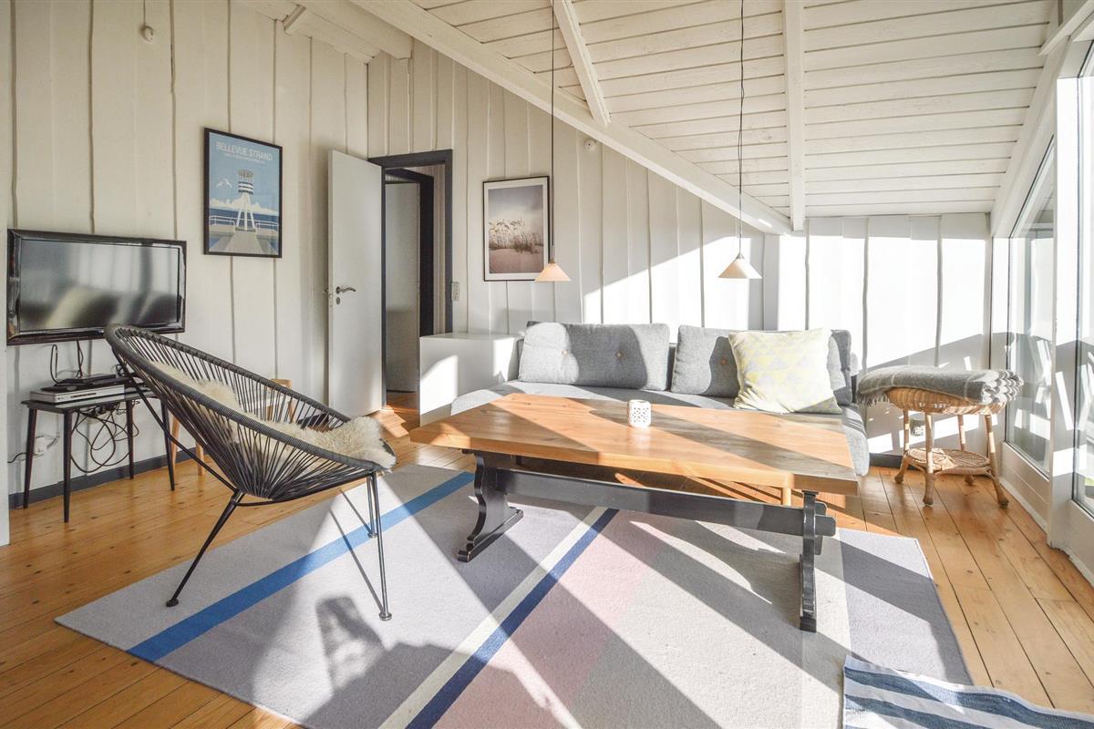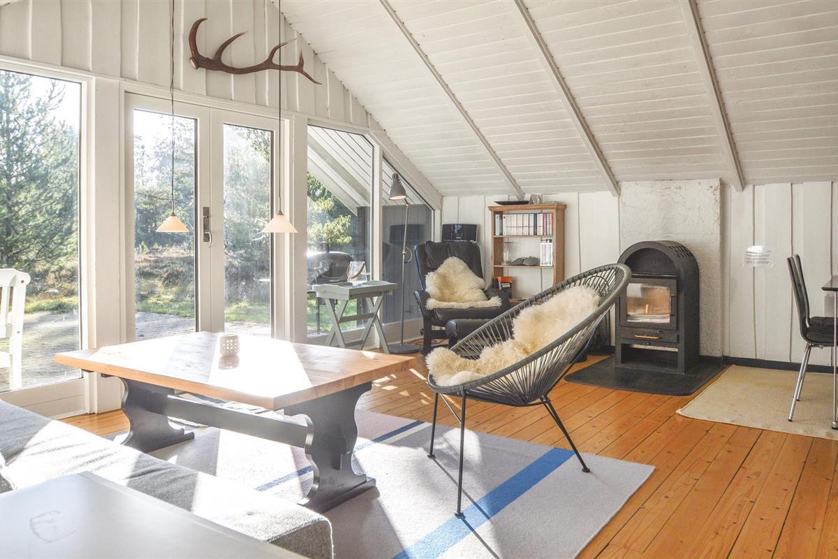 Traditioneel vakantiehuis in Blåvand met licht interieur, houtkachel en groot terras aan een natuurlijke tuin.