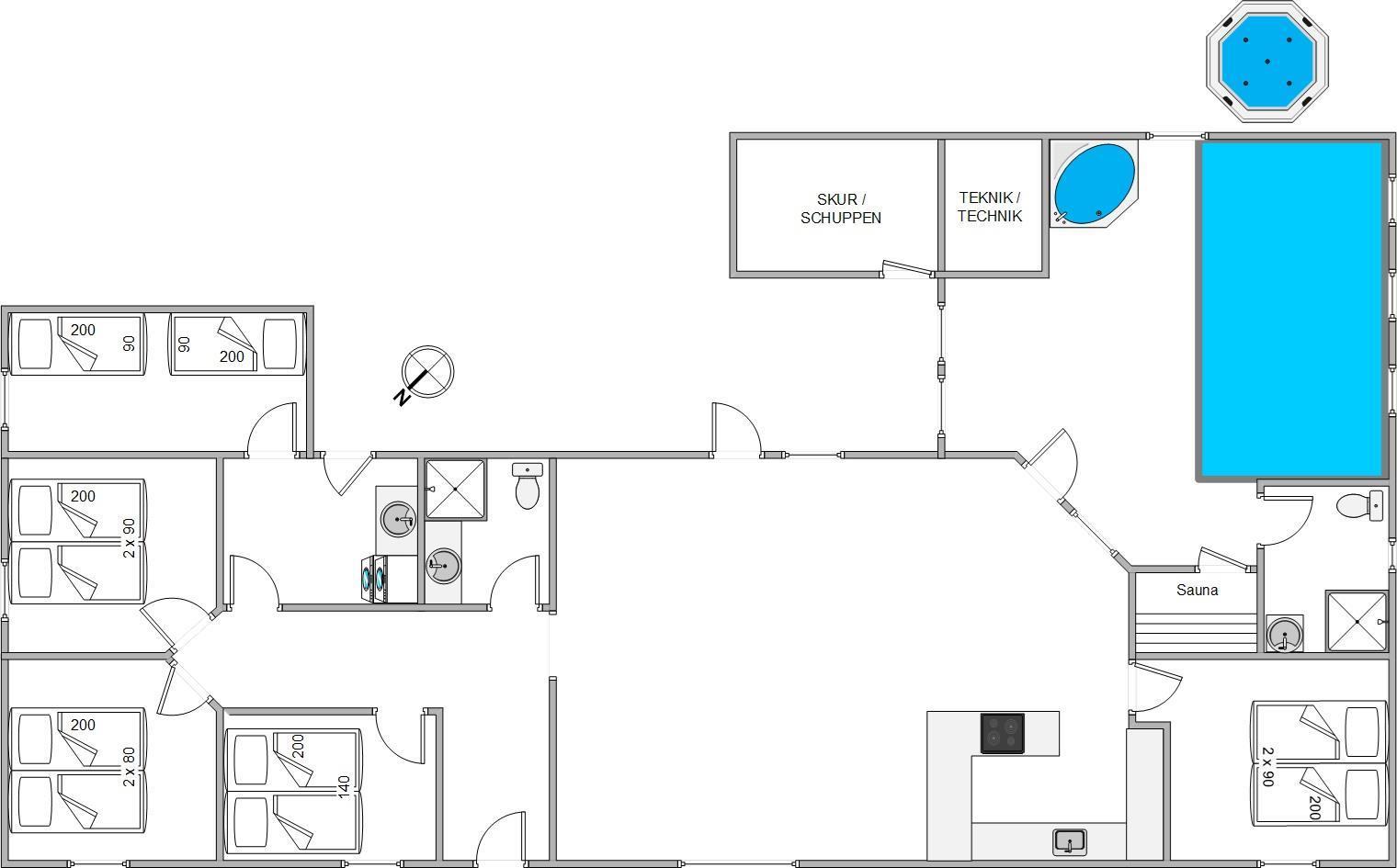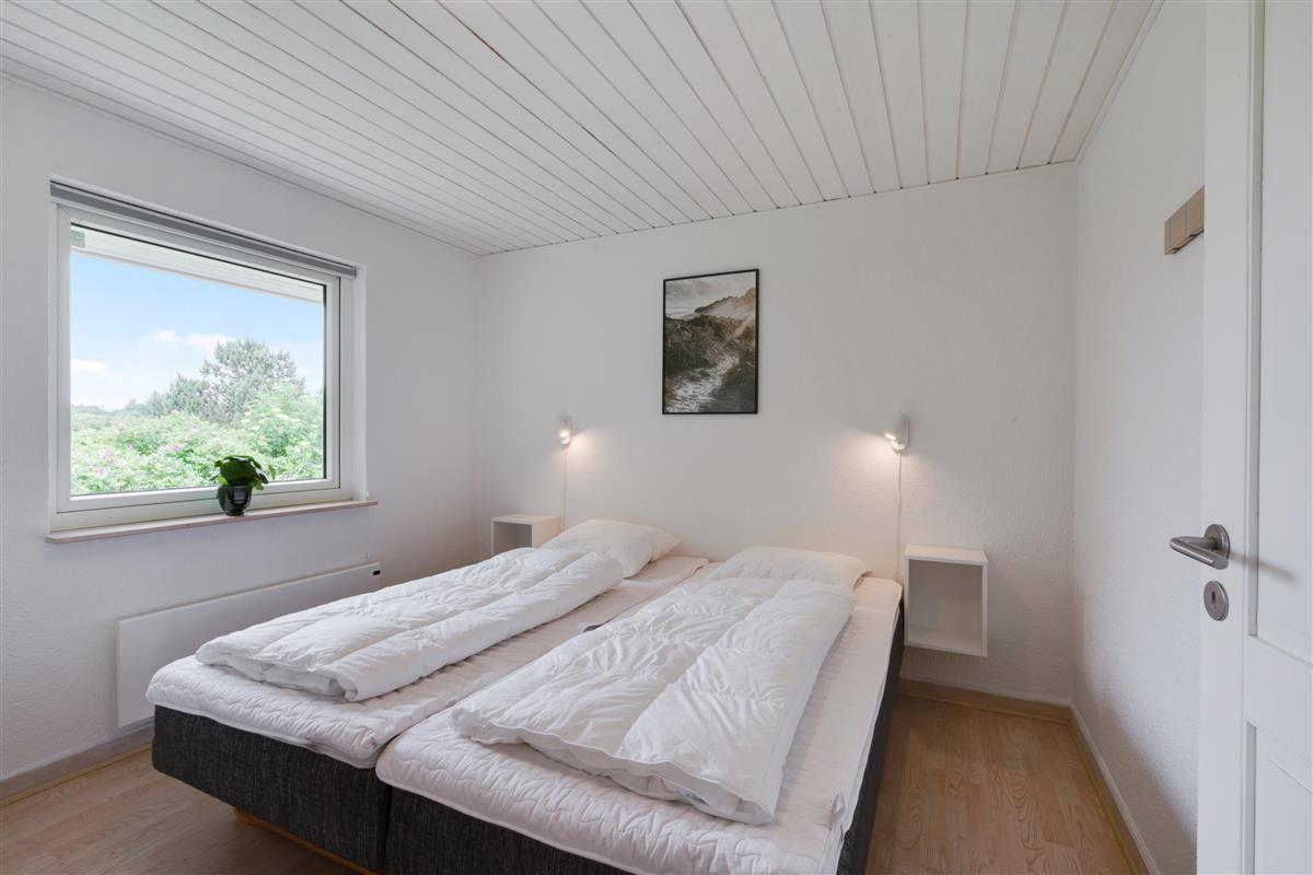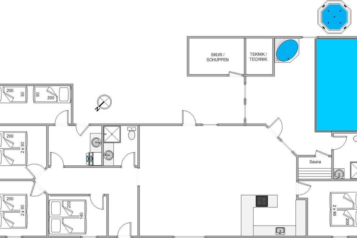The spacious living room with dining area, corner sofa and wood-burning stove forms the heart of the holiday home. Here you can play board games or settle down with a good book by the fire while your family or friends enjoy the pool, sauna or hot tub. The décor is bright and welcoming, with white-painted walls and ceilings and light, easy-care flooring. Large windows flood the space with natural light, and from the terraces you can keep an eye on outdoor activities. The bright pool room with hot tub and sauna attracts both water enthusiasts and those seeking relaxation. The outdoor hot tub offers particular tranquillity where you can unwind and breathe in West Jutland's clean air.