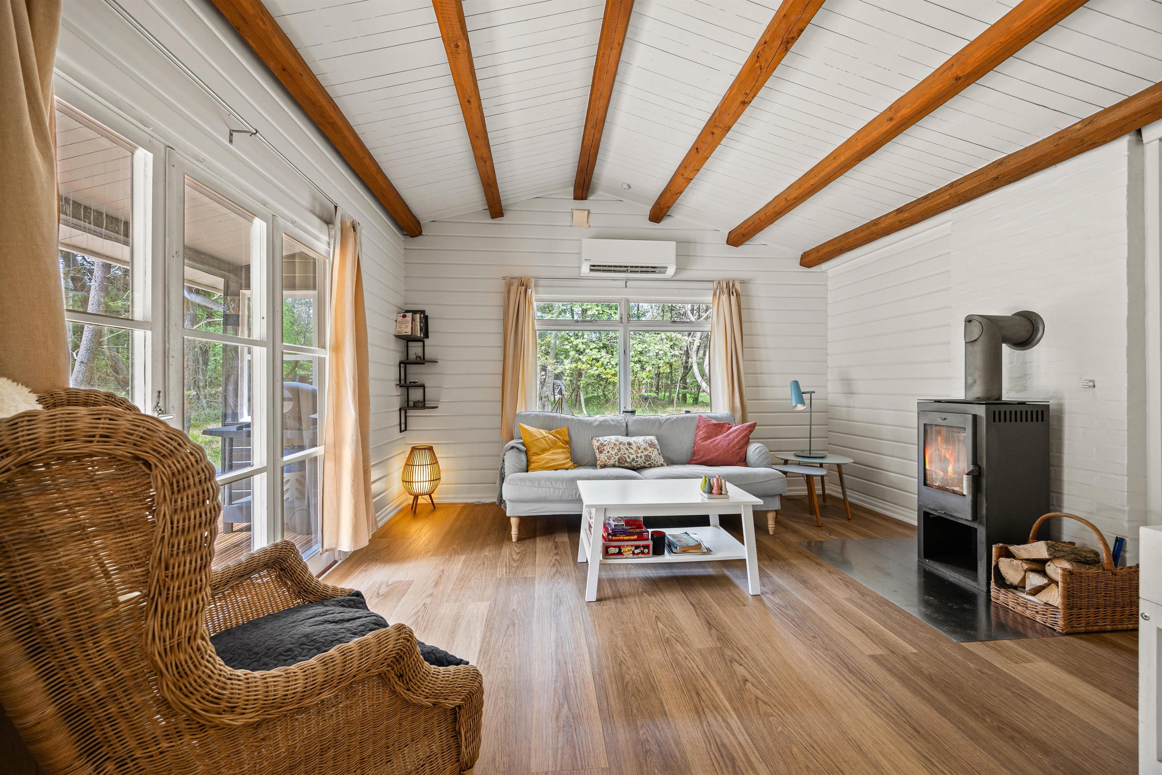 In diesem kleinen, klassischen Ferienhaus mit freiliegenden Dachbalken habt ihr 42 m² Wohnfläche in einer gemütlichen Einrichtung. Im Wohnzimmer könnt ihr den Holzofen anzünden und euch an kühlen Sommerabenden aufwärmen, und die Küche ist mit dem Nötigsten ausgestattet.