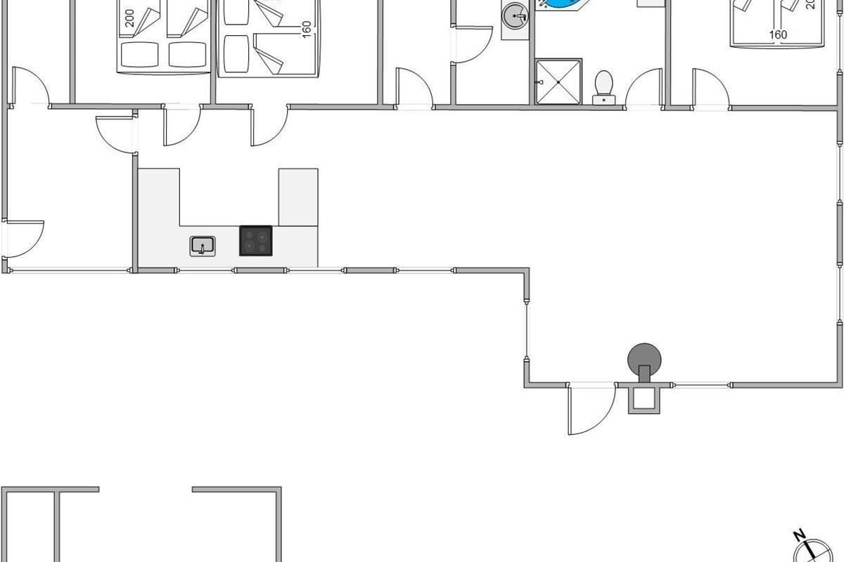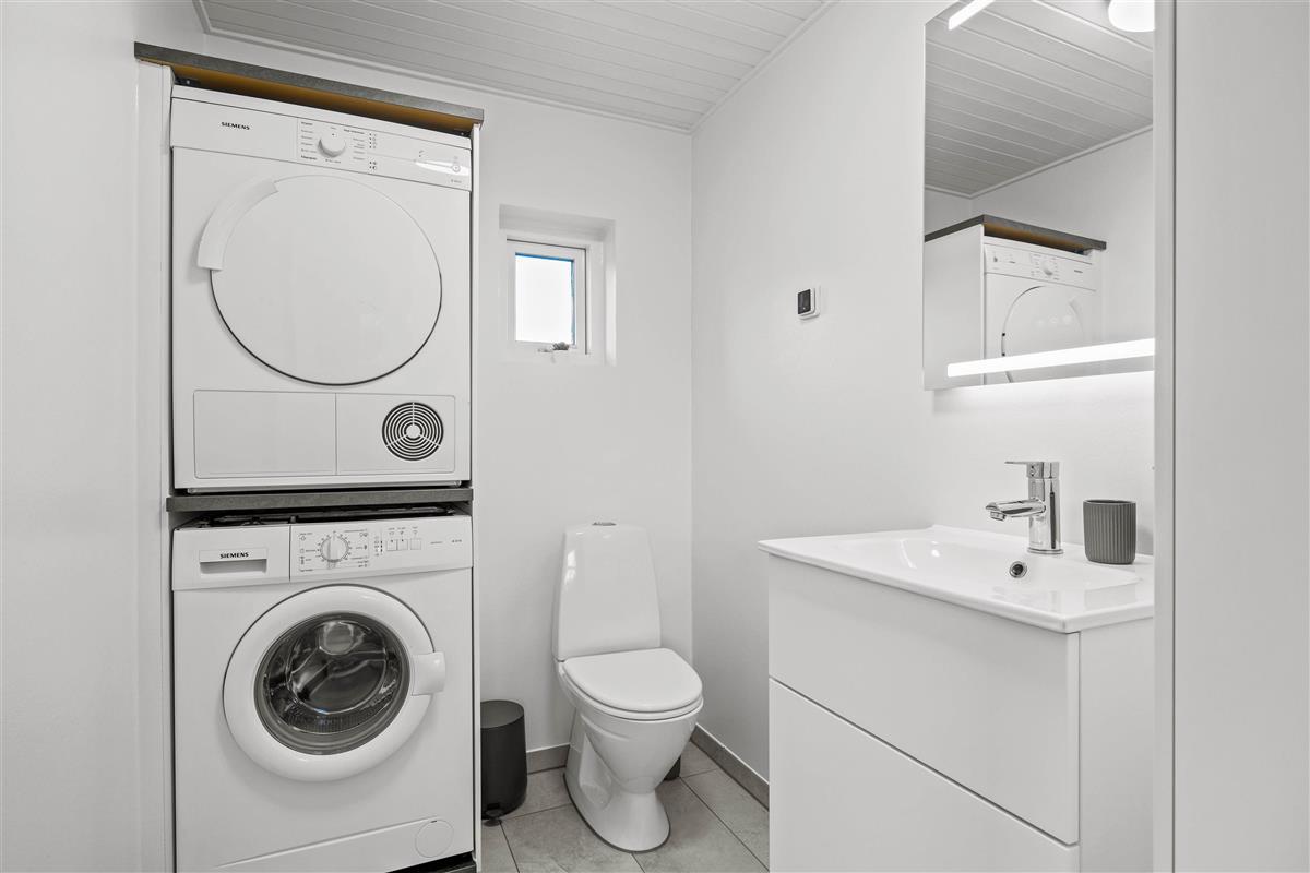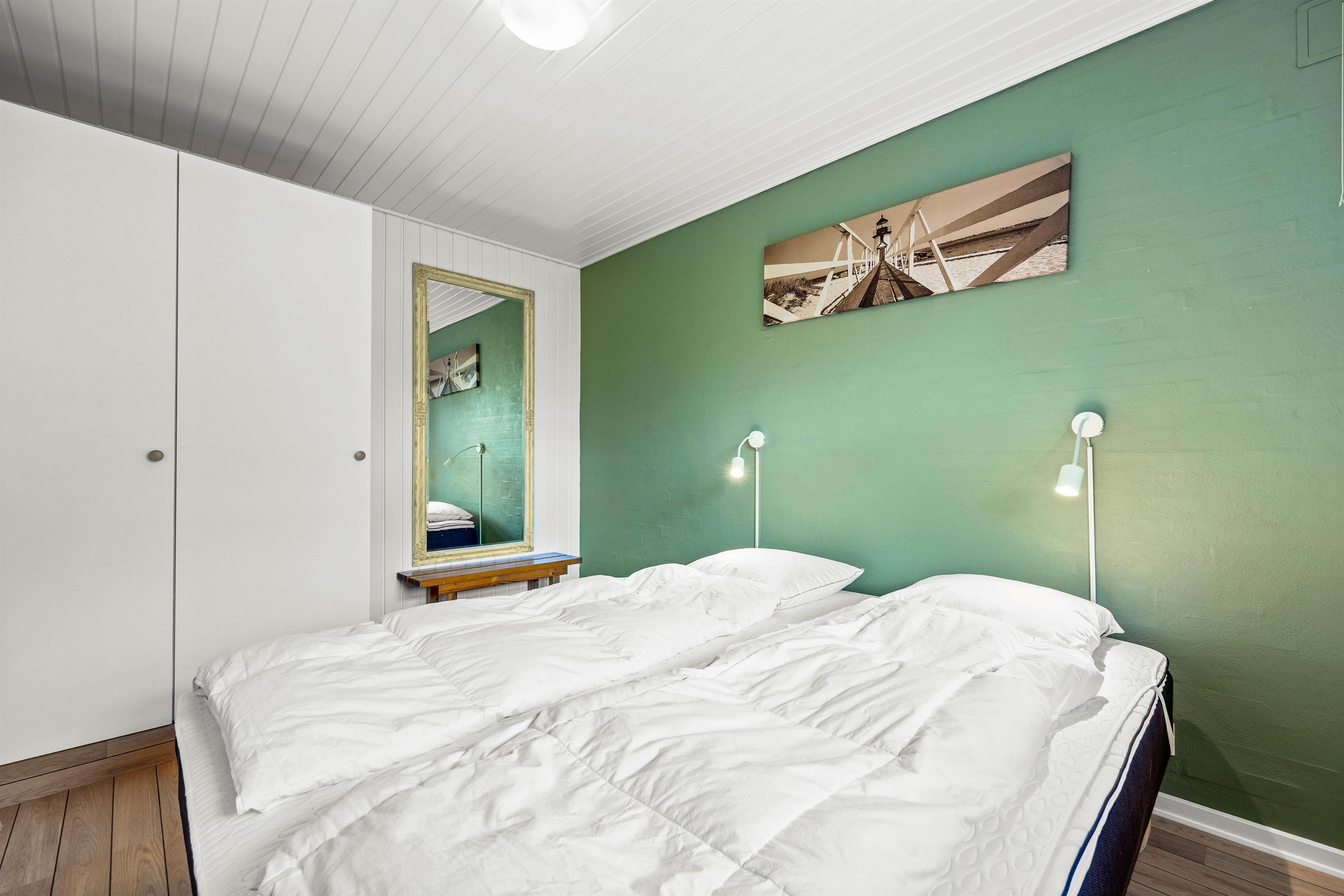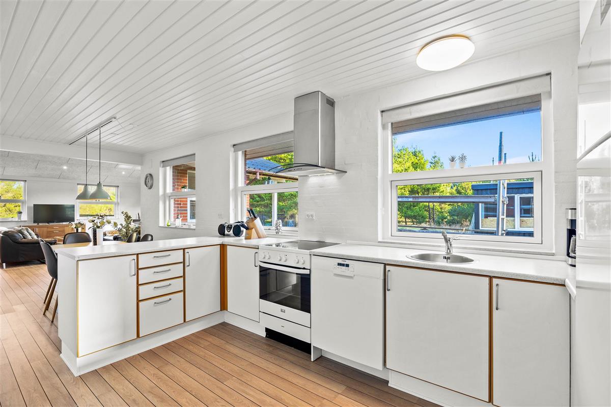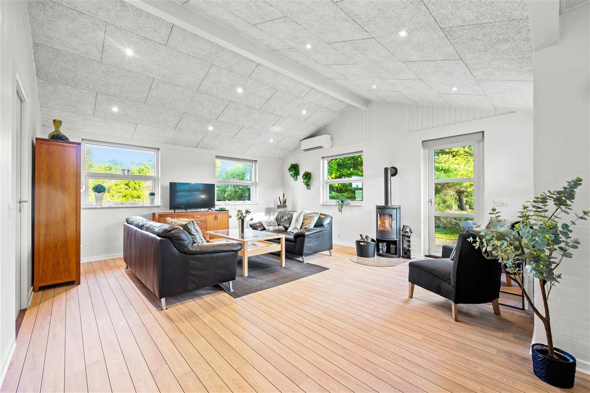 The holiday home's layout at Søndertoften 2 features an open-plan design with characterful angles that create a particularly cosy atmosphere. The dining table, perfect for shared meals and board games, extends from the beautiful kitchen. Beyond lies the comfortable living area with access to the terrace. Here you'll find sofas, armchairs and the wood-burning stove, whose crackling fire provides warmth and comfort. The Danish concept of 'hygge' will quickly help you settle into holiday mode.