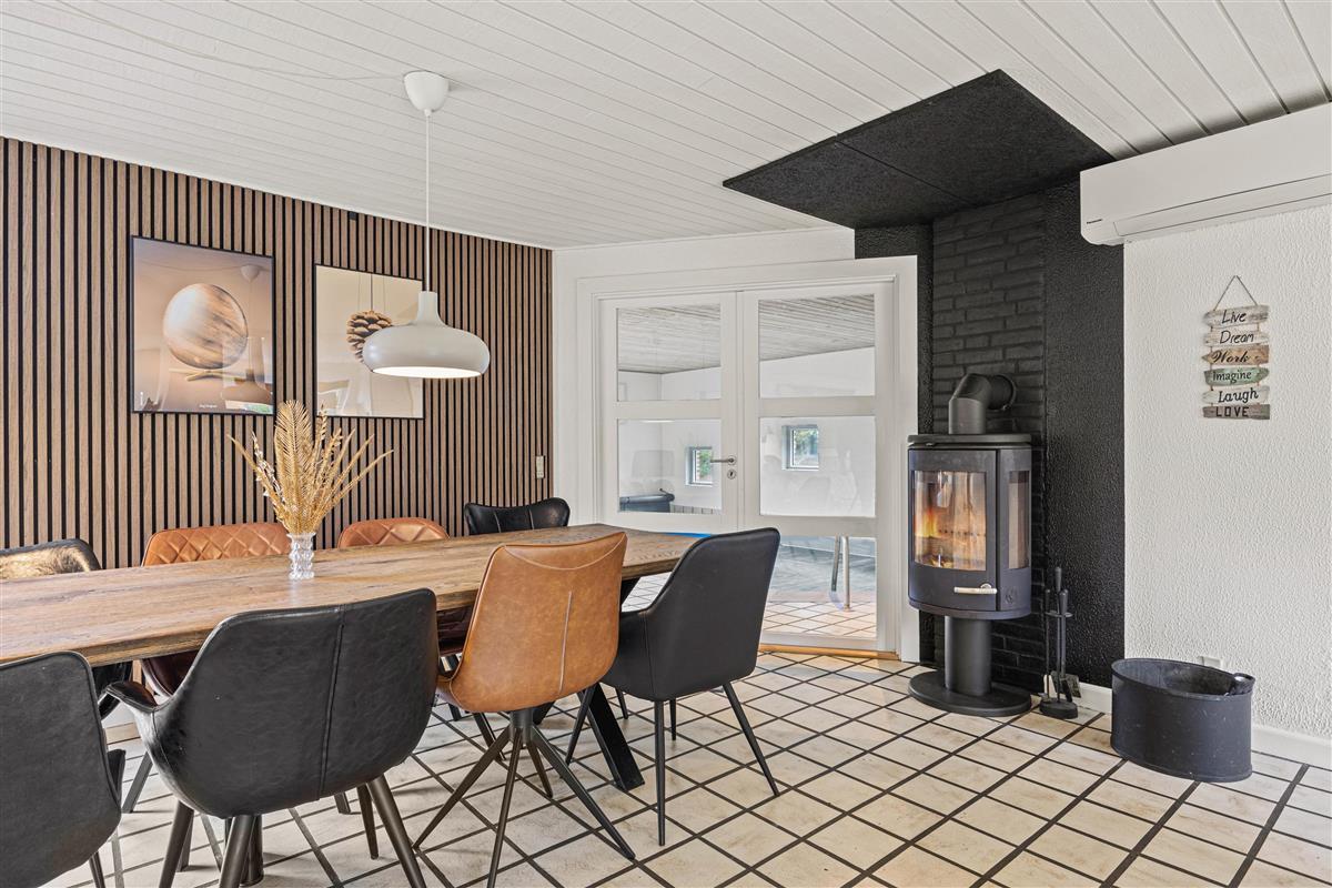 The living area, with its open-plan kitchen, cosy sofas and wood-burning stove, is perfect for relaxation and spending time together. The well-equipped kitchen opens onto the dining area, ensuring those cooking remain part of the social atmosphere.