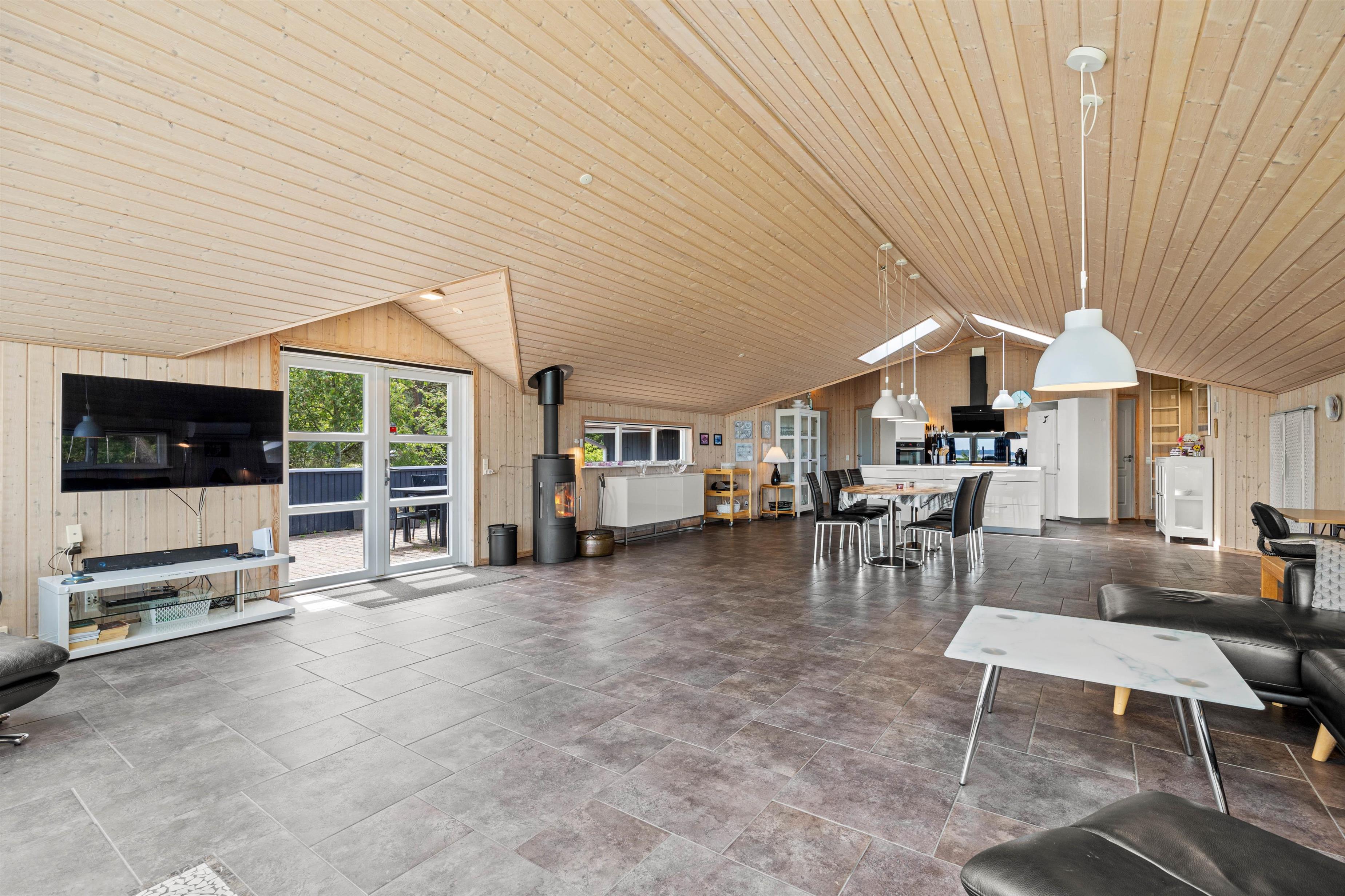 The distinctive architecture, featuring light-flooded, high-ceilinged rooms and comfortable furnishings, creates a welcoming atmosphere. The heart of the house is the spacious open-plan living and dining area with kitchen. There's plenty of room for cosy evenings by the crackling wood-burning stove, cooking together, or enjoying games nights. The highlight is the large, circular panoramic window offering stunning views across Ho Bay and the starlit sky. The entire living area benefits from underfloor heating.