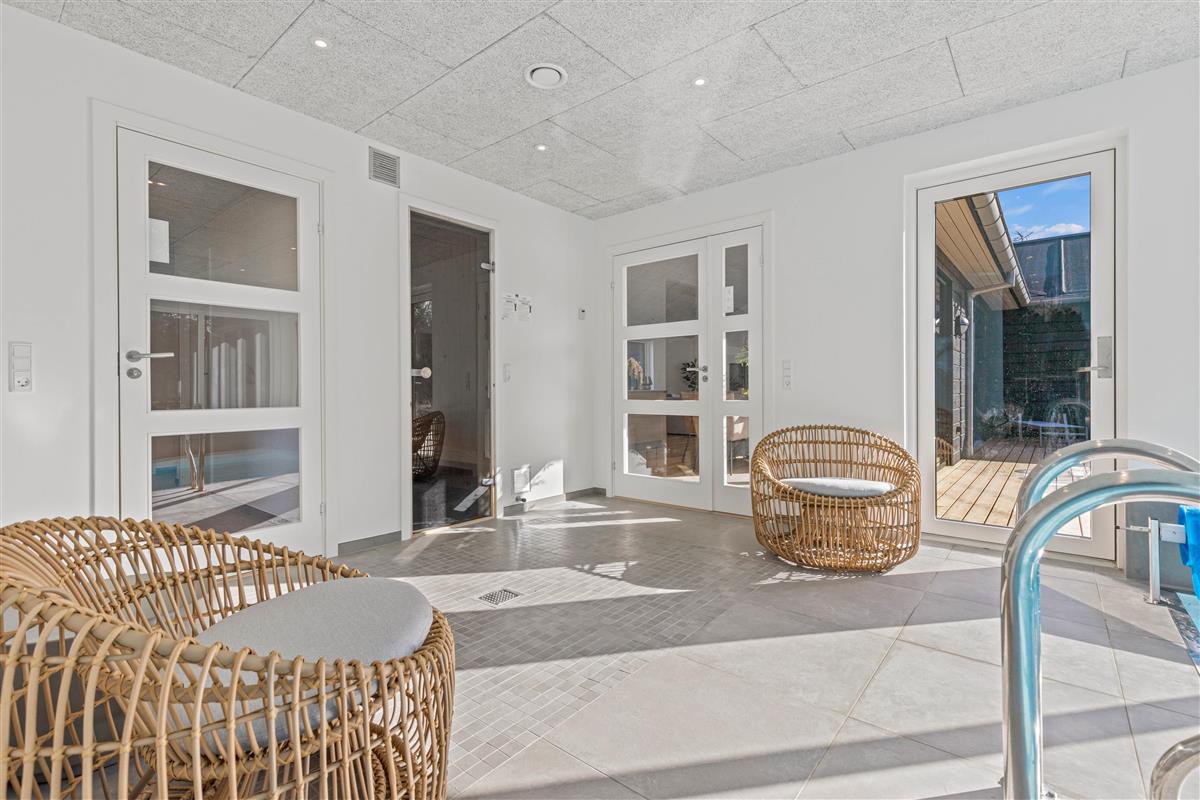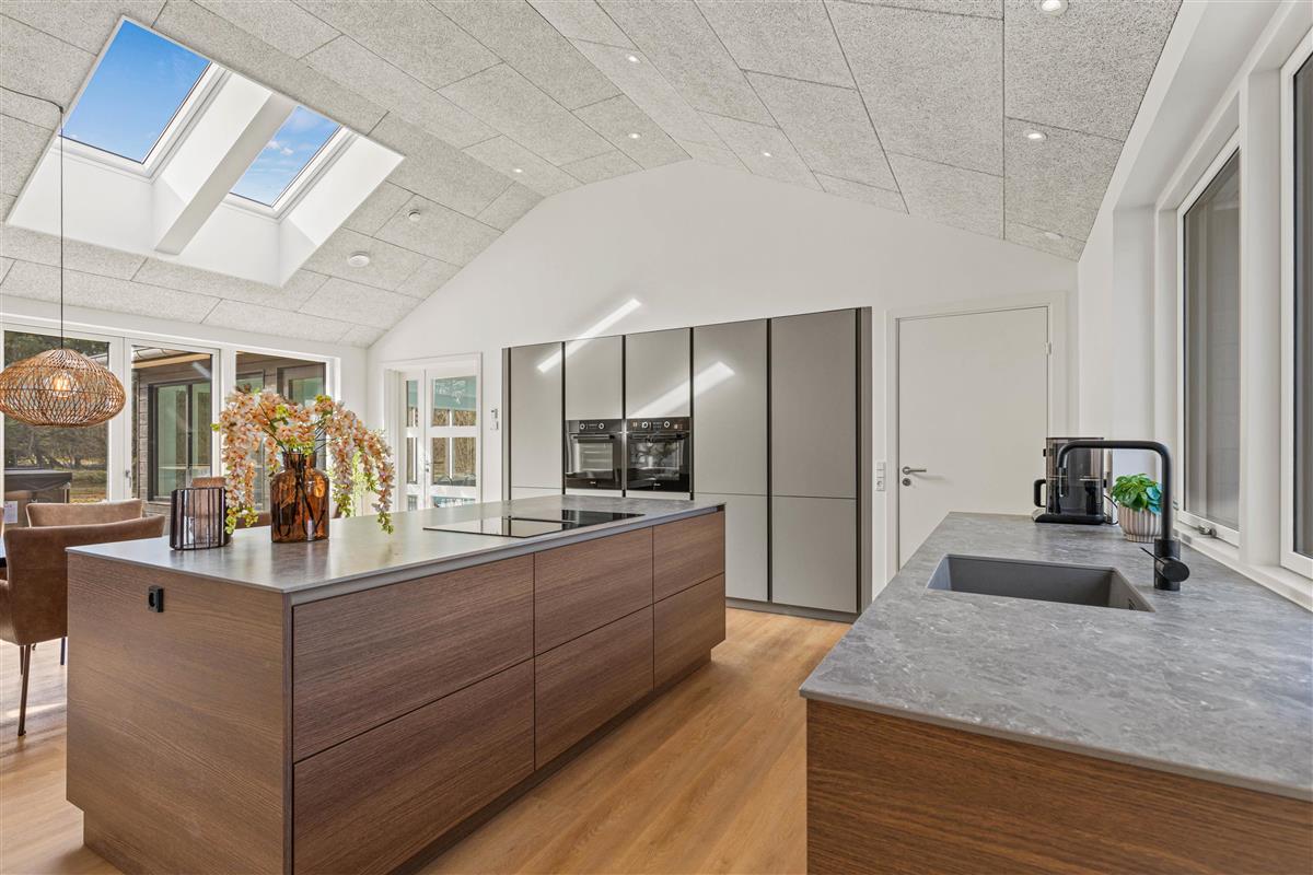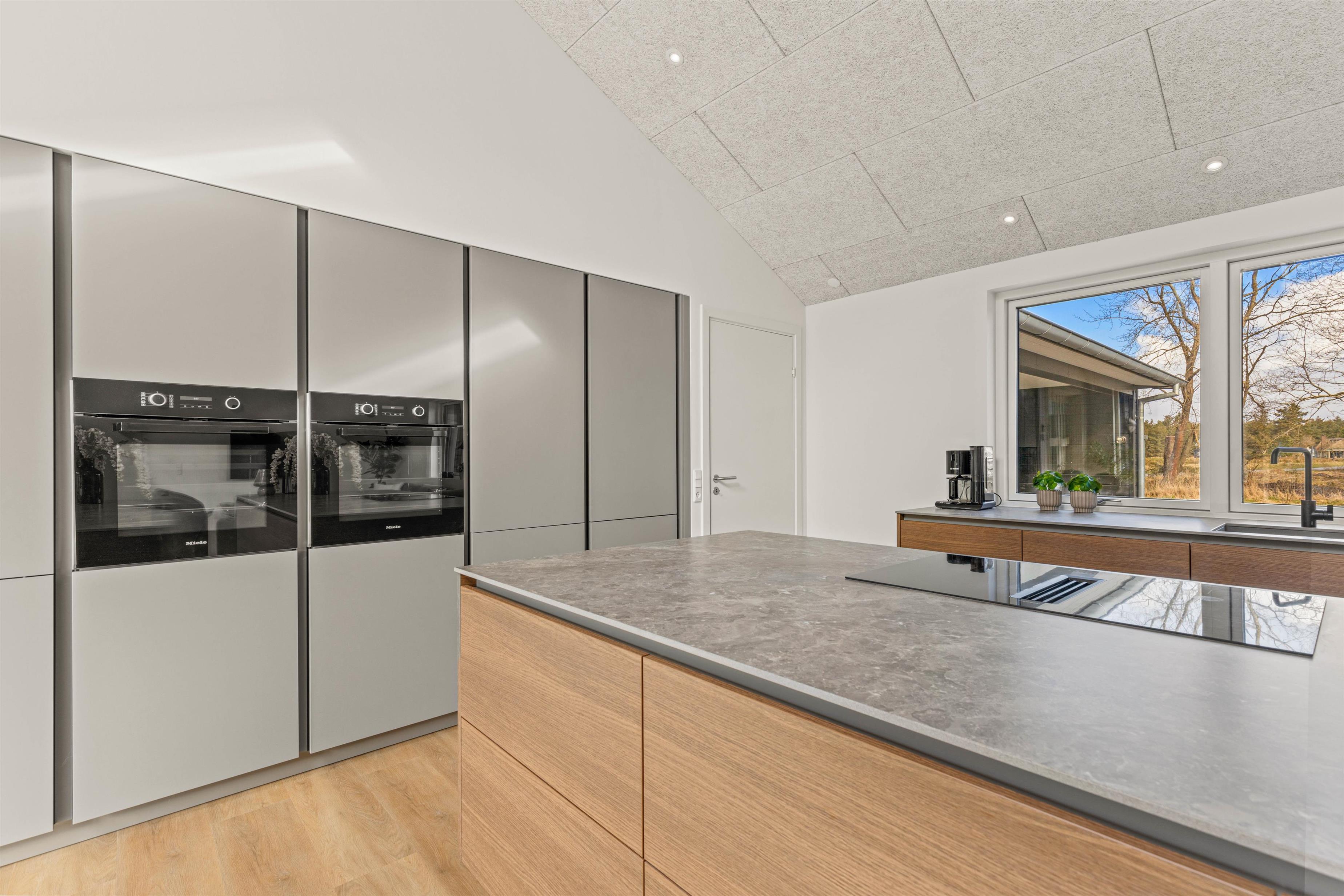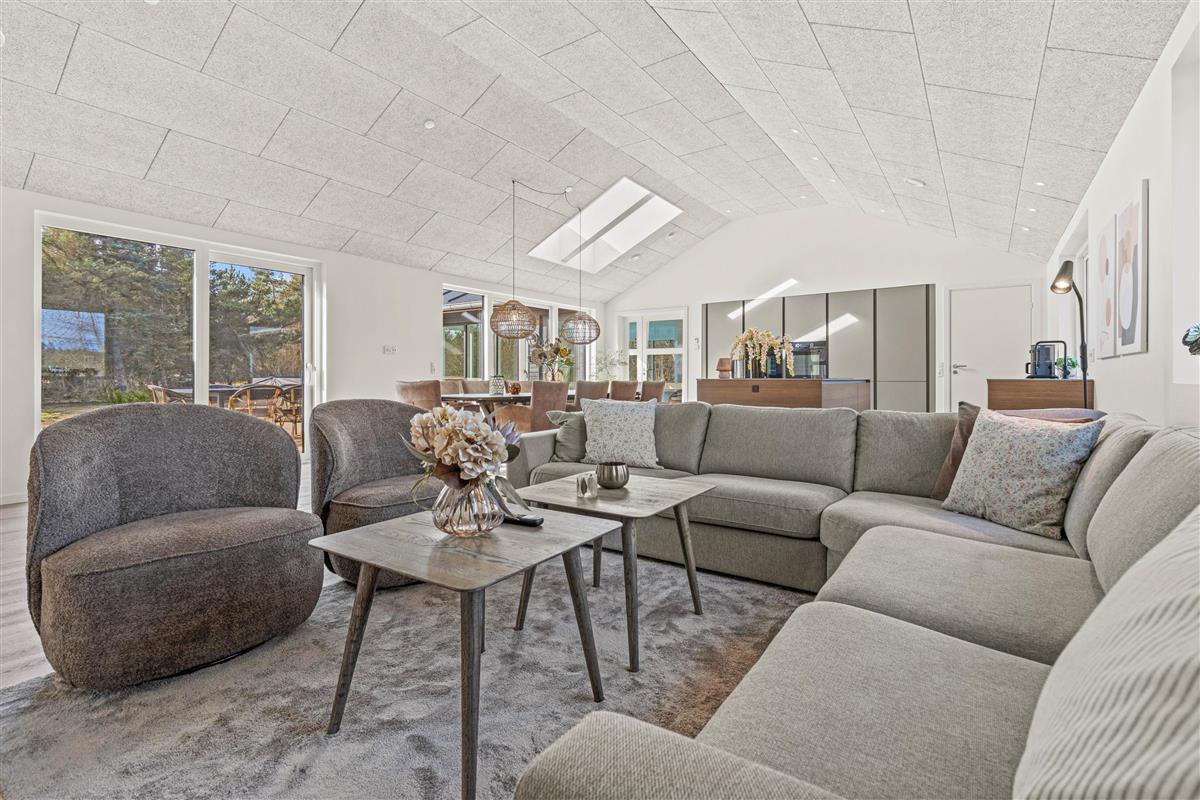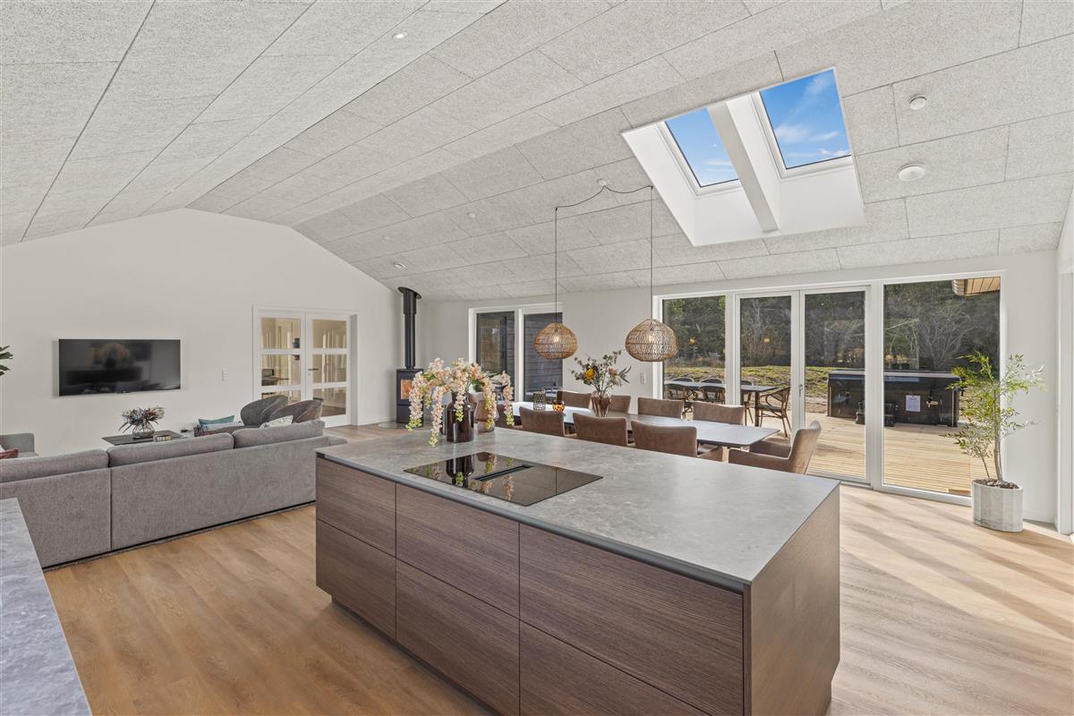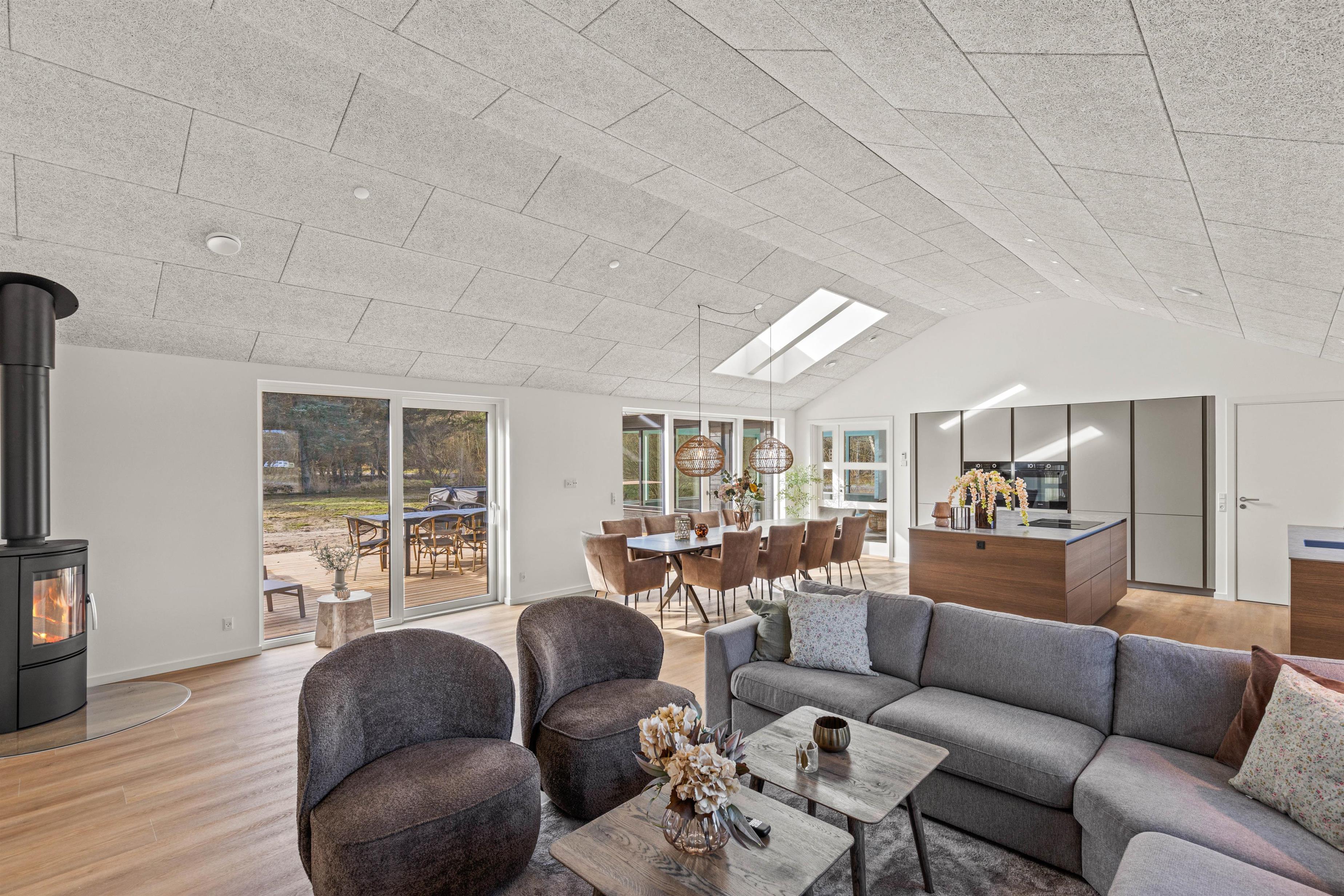 Cooking becomes an event in the fully equipped modern kitchen. There's nothing better than preparing meals in such a spectacular kitchen, with abundant worktop space and high-end appliances - perhaps with a glass of wine in hand. The open-plan layout keeps you connected to family activities. The comfortable sofas offer plenty of cosy seating for all guests, and with the wood-burning stove lit, your hygge evening can begin.
