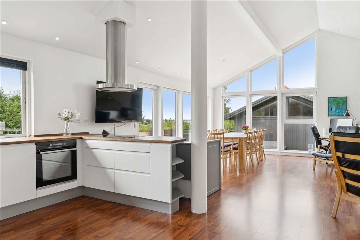 Ruim vakantiehuis van 145 m² met 3 slaapkamers, 8 slaapplaatsen, open keuken, groot terras met uitzicht op de fjord, rustige weg, garage en op slechts 400 m van het water.