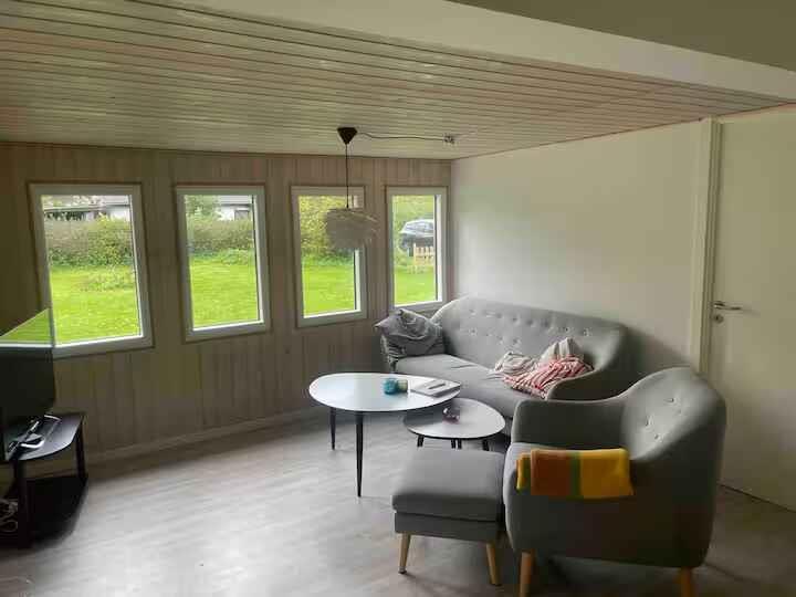Gezellig zomerhuis met 2 slaapkamers, grote groene tuin en buitenbad. Volledig uitgeruste keuken, ruime woonkamer met pelletkachel en modern bad. Dicht bij de Lammefjord met steiger, klein strand en mooie natuur het hele jaar.