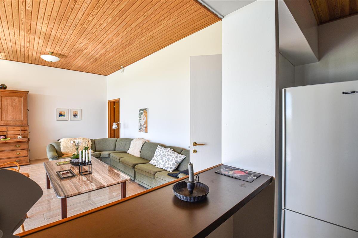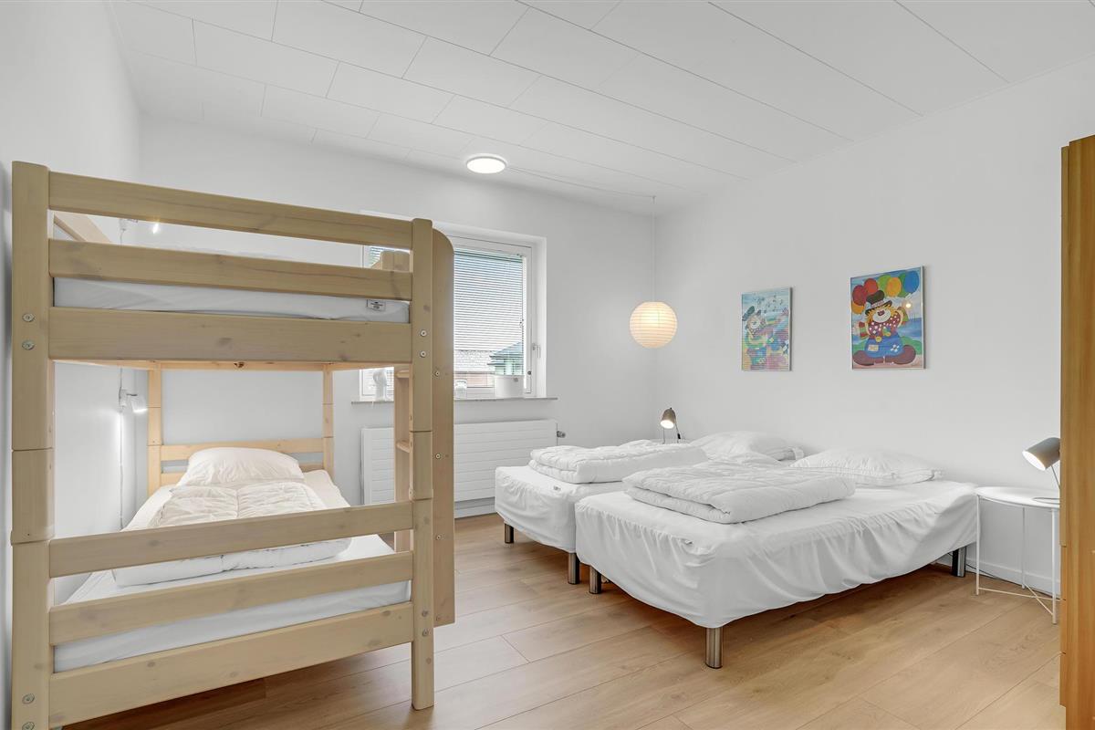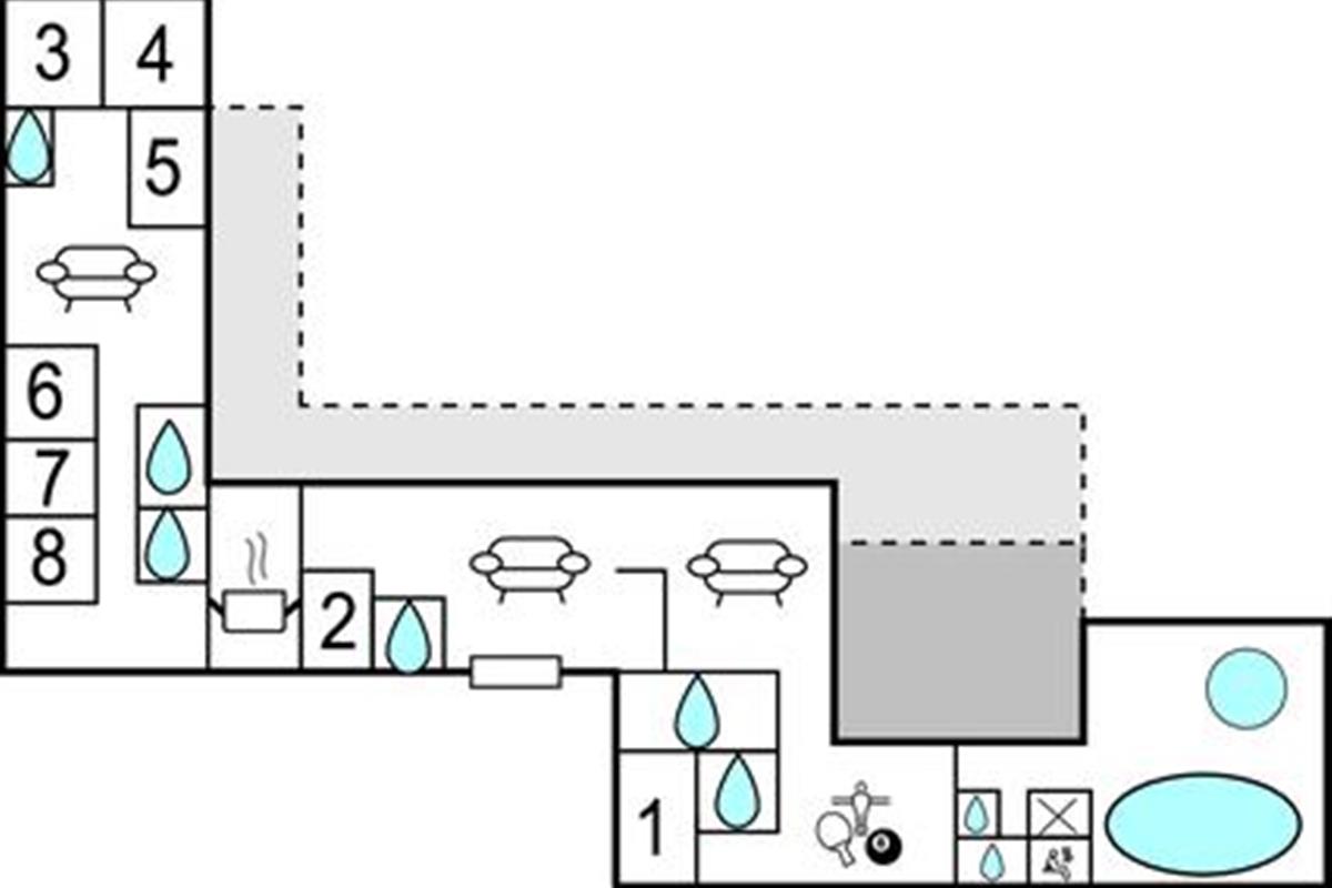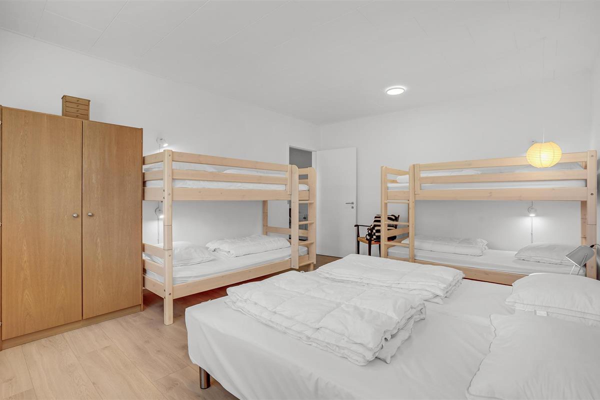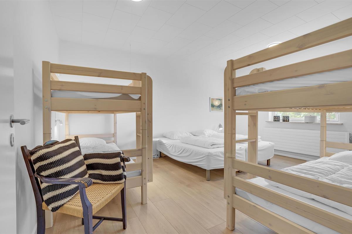 Vanuit de keuken leidt de gang naar het ene slaapgedeelte van het huis met 6 slaapkamers, waarvan enkele familiekamers met tweepersoonsbedden en een stapelbed in de kamer. Aan deze kant van het huis zijn er ook 3 badkamers met douche en gastentoilet. Daarnaast is er een slaapbank in de tv-kamer en nog een slaapbank in een doorgangskamer. De achtste slaapkamer bevindt zich naast de hobbykamer. Deze slaapkamer heeft een badkamer met 2 wastafels, douche en ligbad.