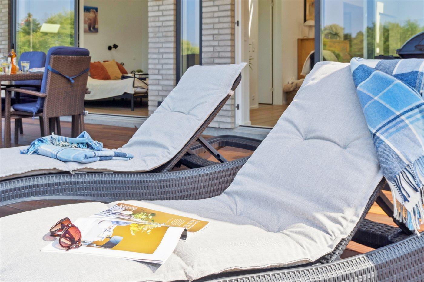 De vakantiewoning is gelegen op een 1000 m² groot aangelegde tuin. Afstand tot de zee 945 m. Dichtstbijzijnde winkel 300 m. Er is een golfbaan op een afstand van 4200 m. Bij de vakantiewoning hoort terras. Daarnaast is er een overdekt terras. Barbecue. Het huis heeft een stopcontact voor het opladen van een elektrische auto. Oplaadstekker type 2. Met 11 kW-laadvermogen. Parkeerplaats bij het huis.