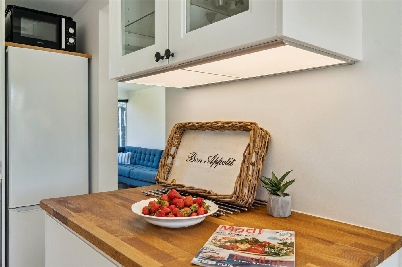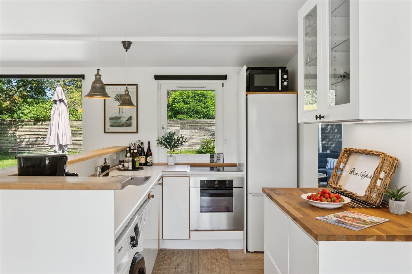 De keuken is uitgerust met koelkast Er is 4 inductiekookplaten, heteluchtoven, magnetron en vaatwasser.