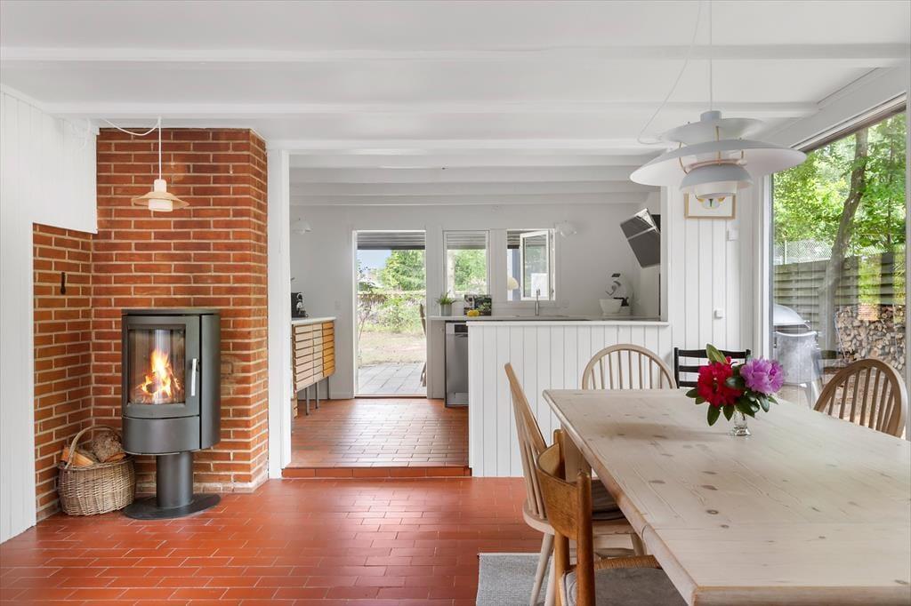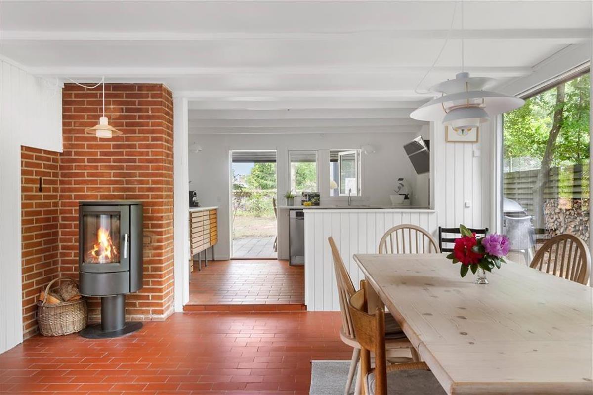 Schon beim Betreten wirst du von einer Einrichtung empfangen, die pure Sommerstimmung und Wärme ausstrahlt. Die offene Küche geht harmonisch in den hellen Essbereich über und schafft einen einladenden Raum für gemeinsames Kochen und gemütliches Beisammensein. Große Fenster und der direkte Zugang zur Terrasse lassen das Tageslicht hereinströmen, während der Kaminofen an kühleren Tagen für wohlige Wärme und Gemütlichkeit sorgt. Genieße deinen Morgenkaffee mit Blick in den Garten, während das Feuer leise knistert. Im Anschluss an den Essbereich liegt das gemütliche Wohnzimmer mit bequemen Möbeln – der perfekte Ort, um sich mit einem guten Buch aufs Sofa zu kuscheln oder nach einem erlebnisreichen Tag einfach zu entspannen. Die Schlafzimmer sind sowohl komfortabel als auch praktisch eingerichtet – eines mit Doppelbett und Kinderbett, das andere mit einem Doppelbett. Die Einrichtung ist schlicht und wohnlich – genau so, wie man es von einem klassischen dänischen Ferienhaus erwartet.
