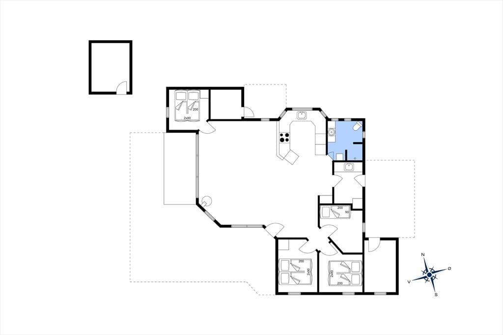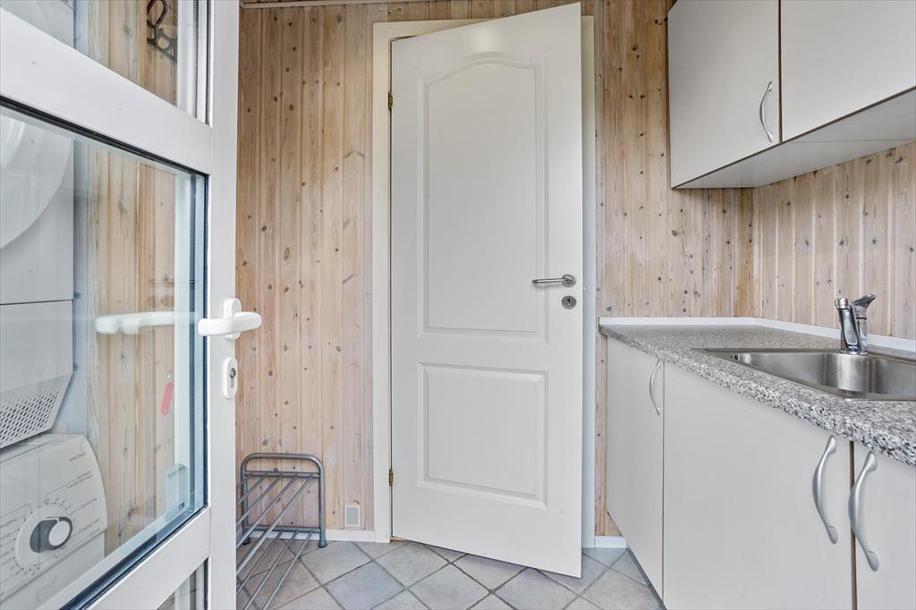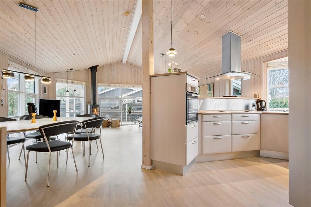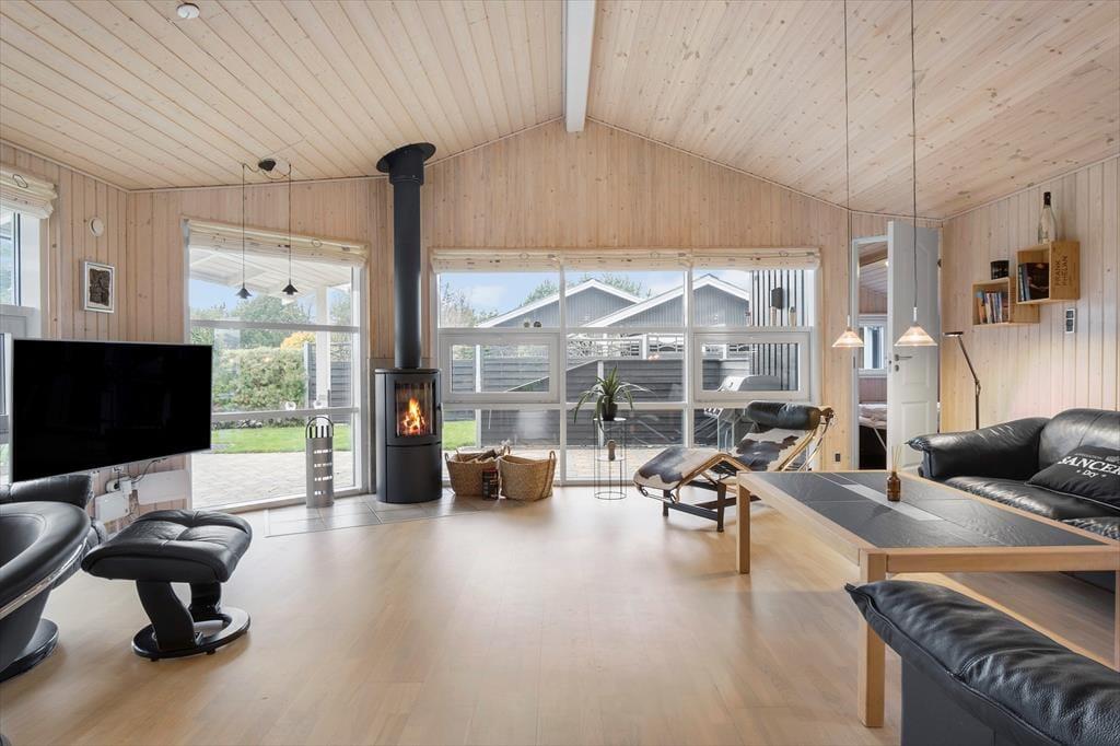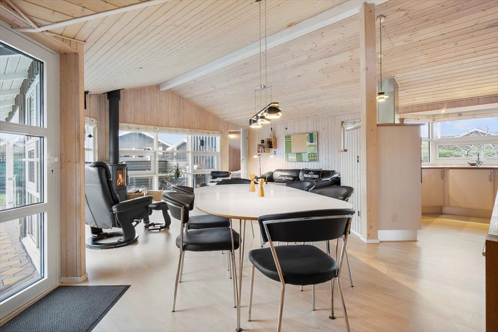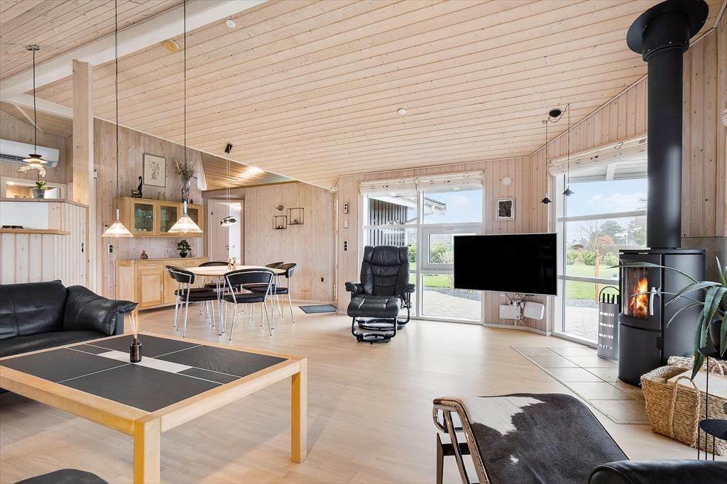 Dieses gemütliche Ferienhaus für 7 Personen beinhaltet einen Eingangsbereich mit einer Waschmaschine und einem Wäschetrockner und eine gut ausgestattete Küche, die unter anderem mit einem Geschirrspüler versehen ist. Die Küche fügt sich offen in den Aufenthaltsraum ein, der sich aus Wohn- und Essbereich zusammensetzt. Der Aufenthaltsraum verwöhnt mit einem direkten Zugang zur Terrasse, mit einem Kaminofen und mit einer energiesparenden Wärmepumpe. Die Schlafplätze verteilen sich auf drei Schlafräume mit je einem Doppelbett und auf einen Schlafraum mit einem Einzelbett. Das große Badezimmer begrüßt Sie mit einer Duschnische.