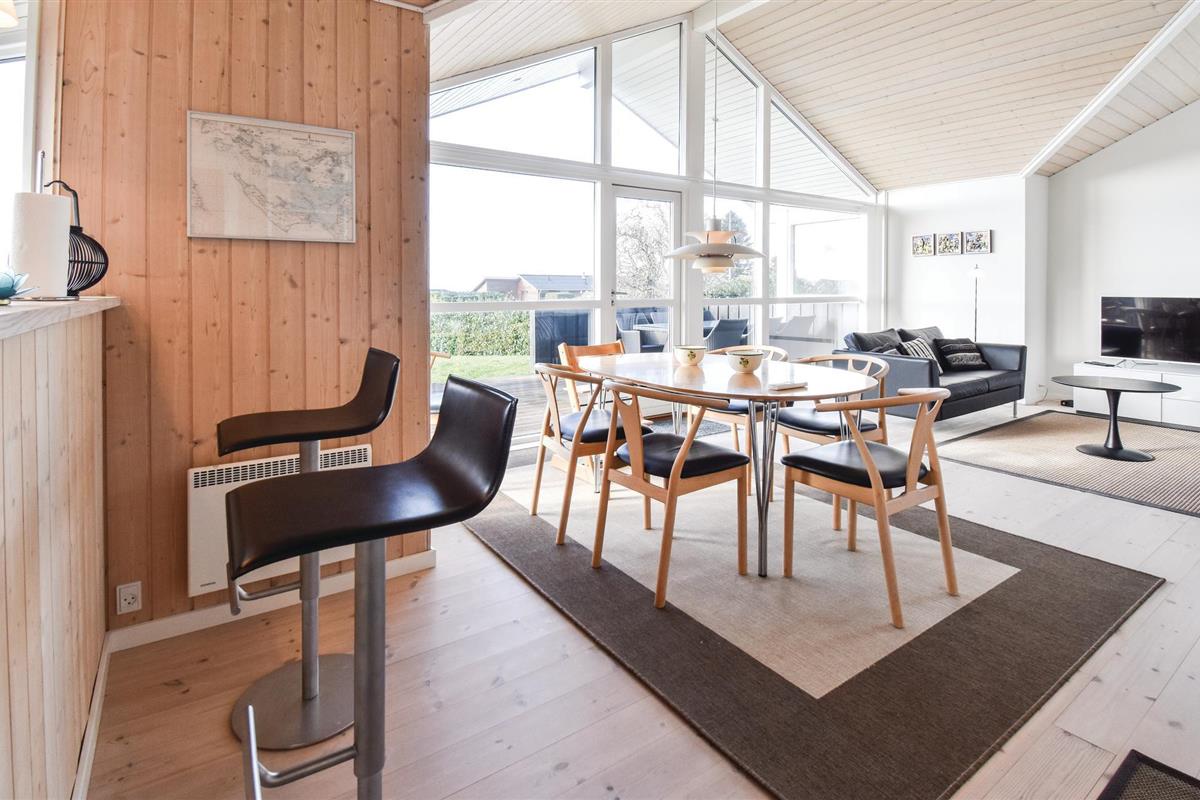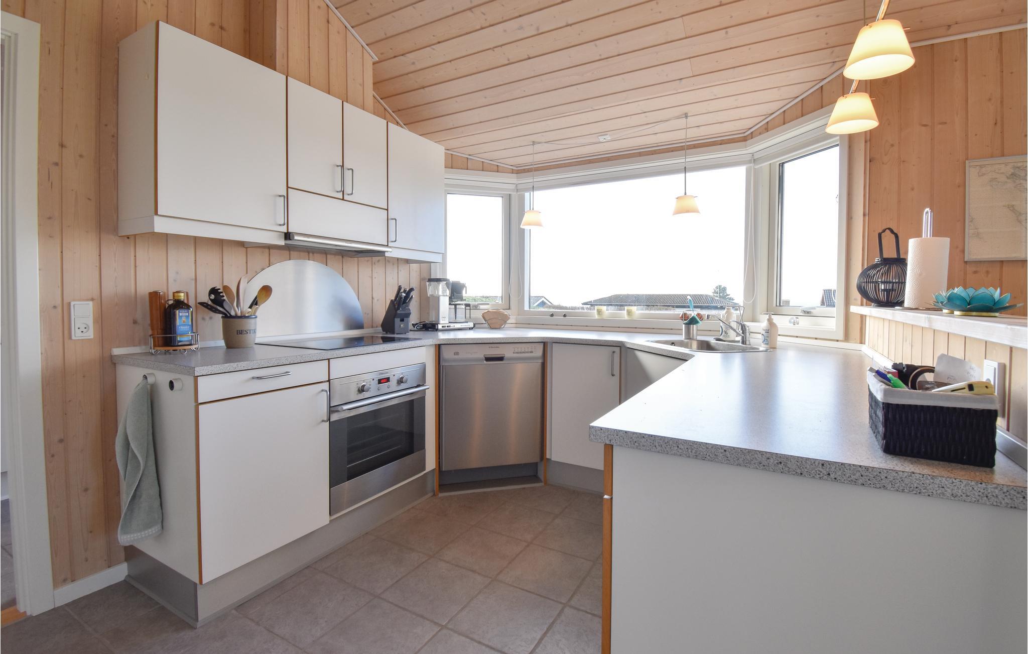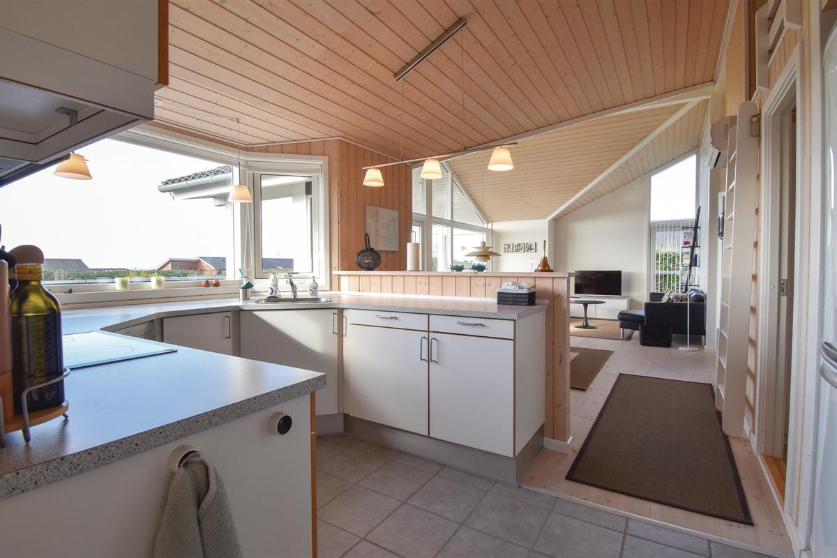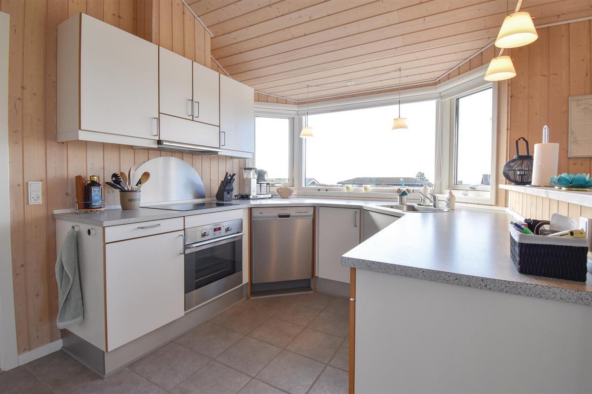 Het eerste wat u in het huis aantreft is een ruime wasruimte met wasmachine en u krijgt een eerste indruk van de hoge plafonds in het huis. Aangrenzend is de goed uitgeruste keuken-woonkamer met uitzicht op zee. De keuken is zo ingedeeld dat het gemakkelijk is om te communiceren met de anderen in het woongedeelte. Ook hier bieden de grote raampartijen een geweldig panorama en een optimale lichtinval.