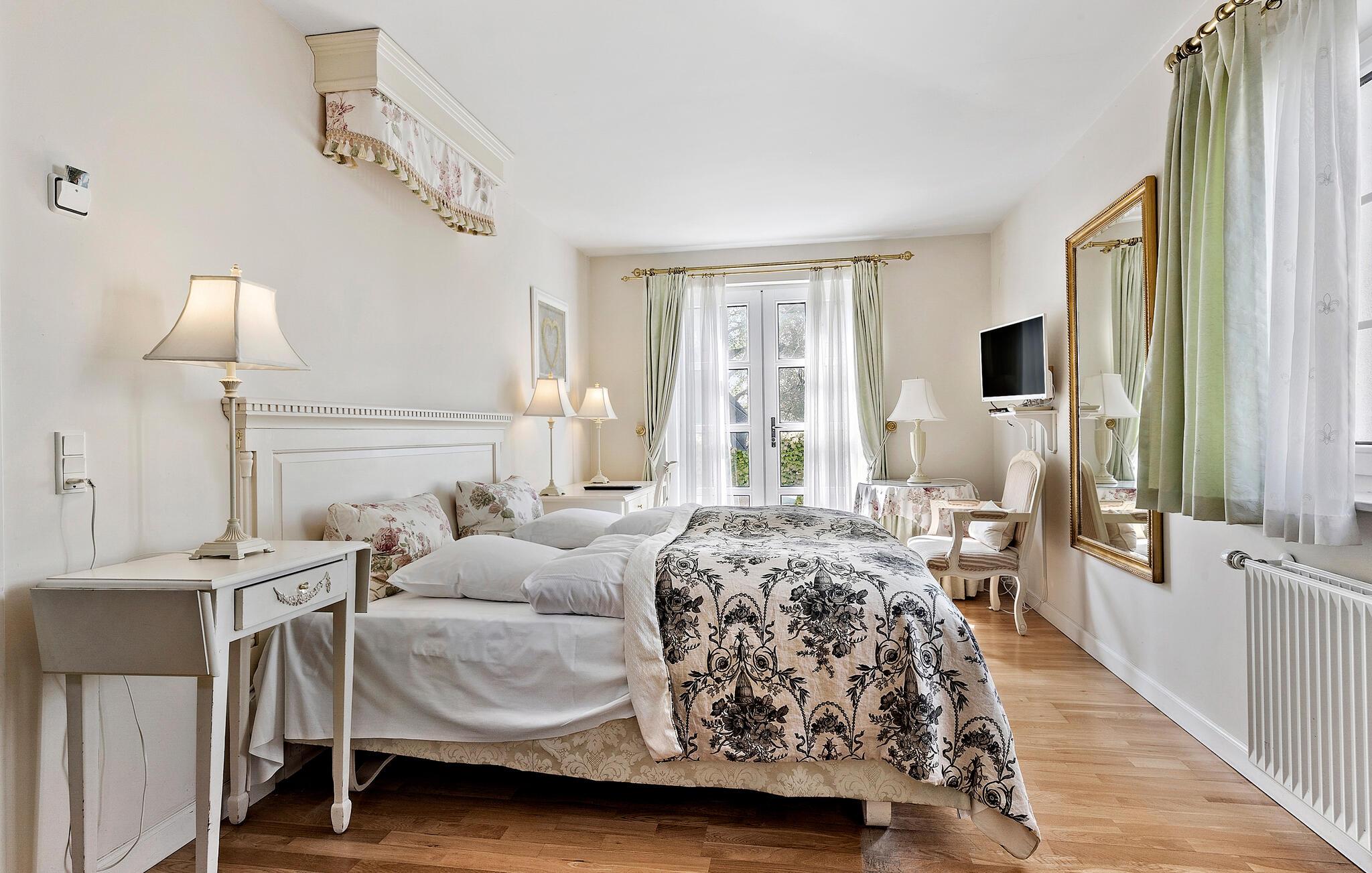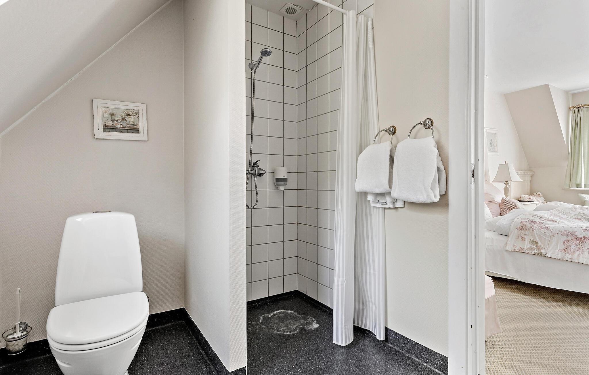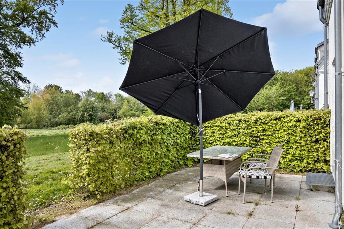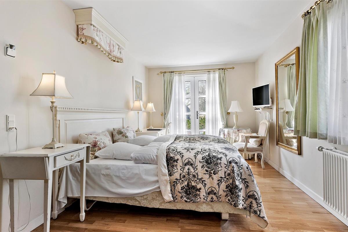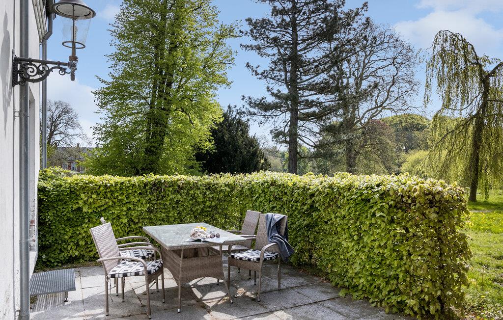 Elegant en stijlvol vakantiehuis in kasteelpark Hvedholm, ideaal voor familie en vrienden, met privébadkamers en terras.