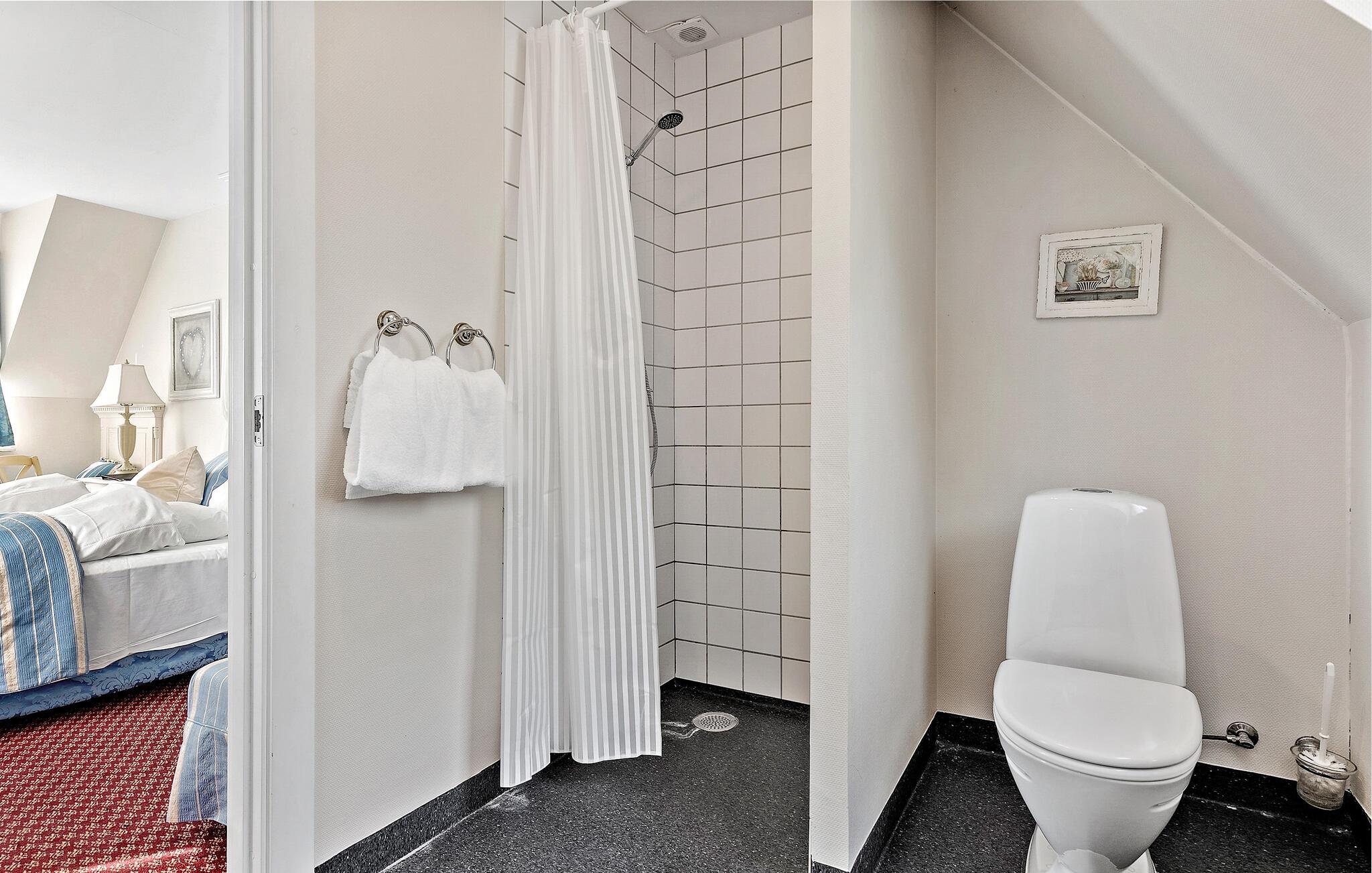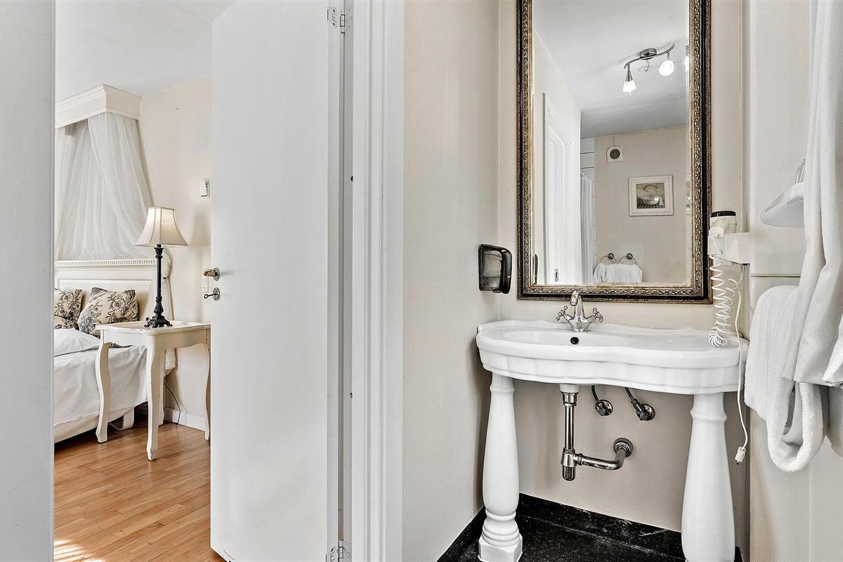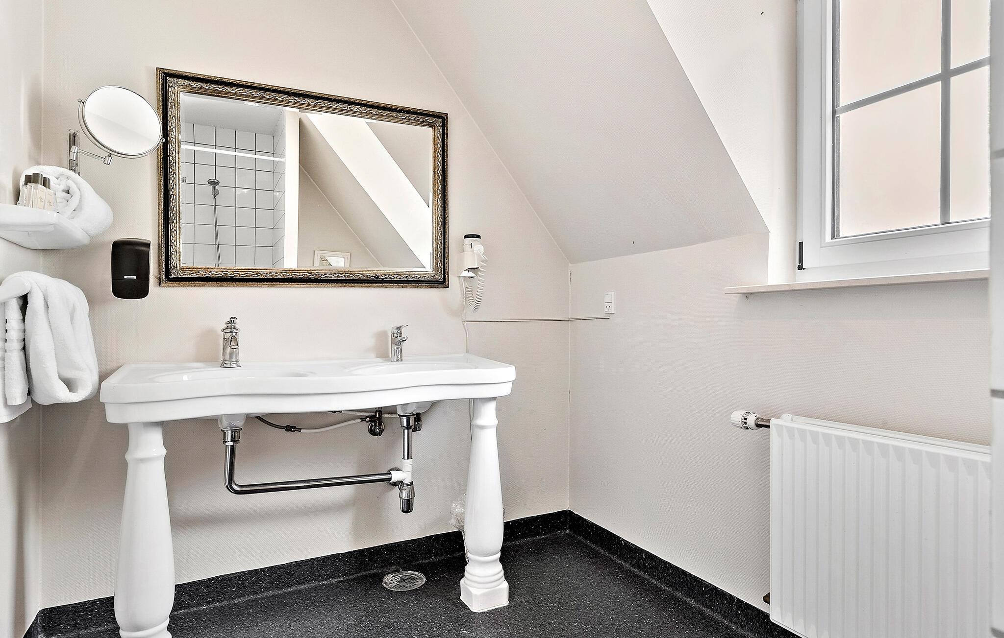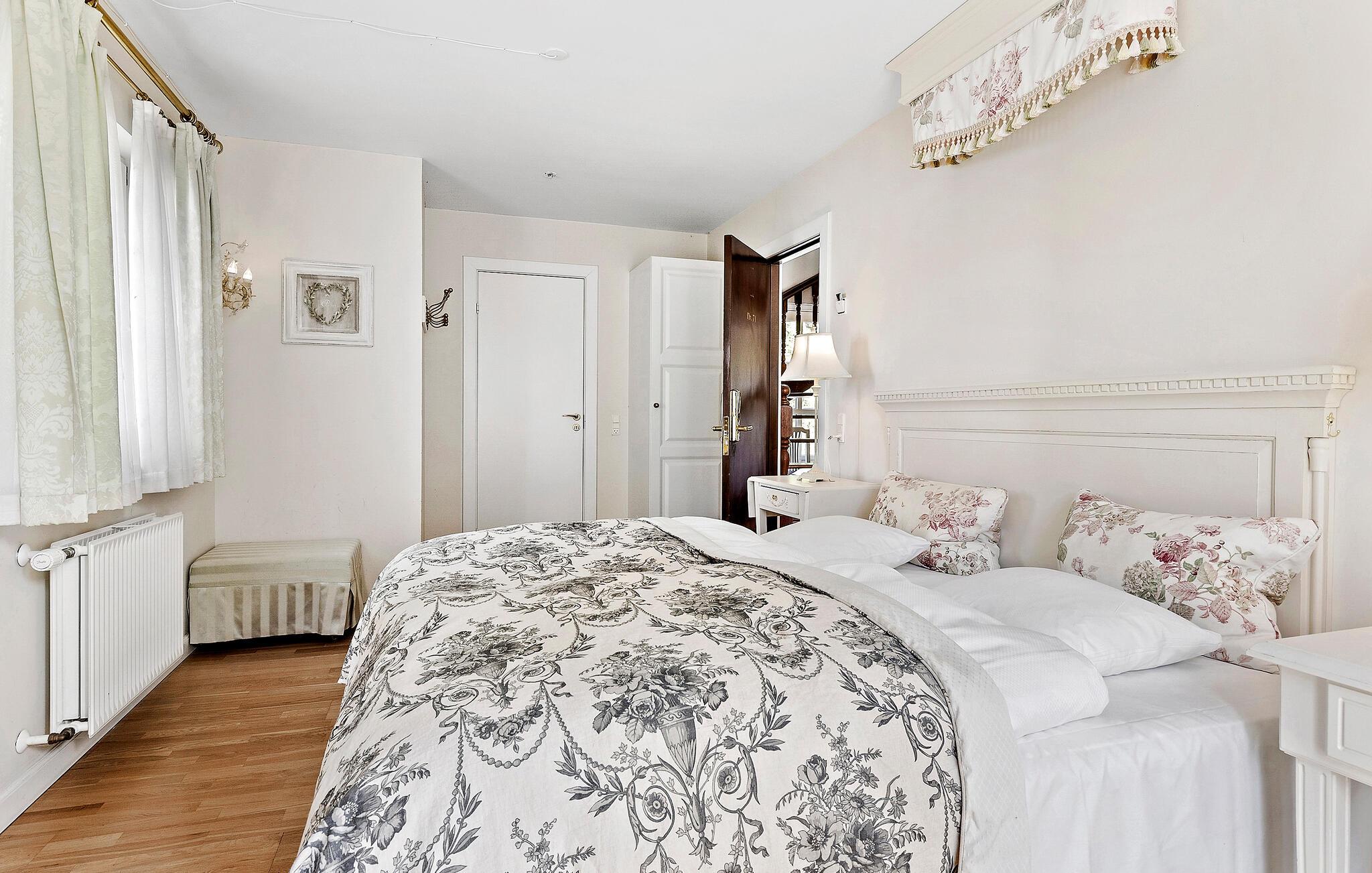 Elegant en stijlvol vakantiehuis in kasteelpark Hvedholm, ideaal voor familie en vrienden, met privébadkamers en terras.