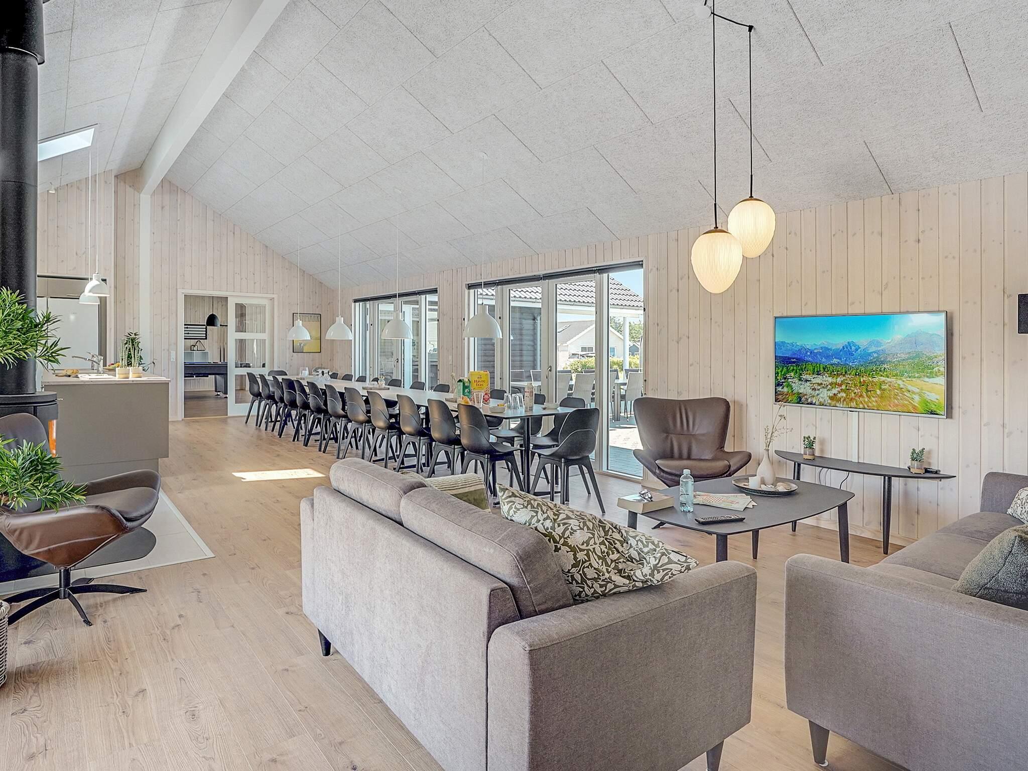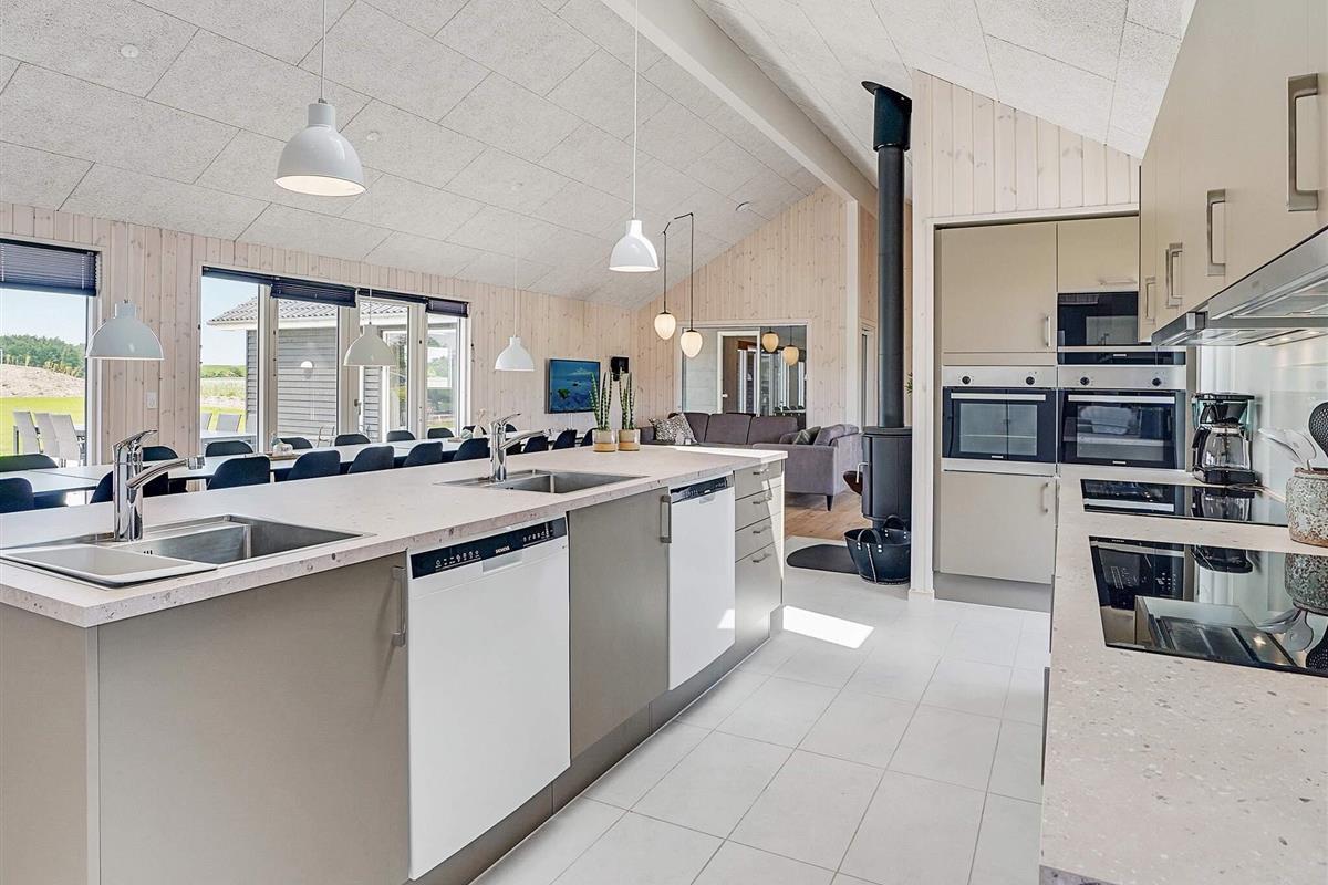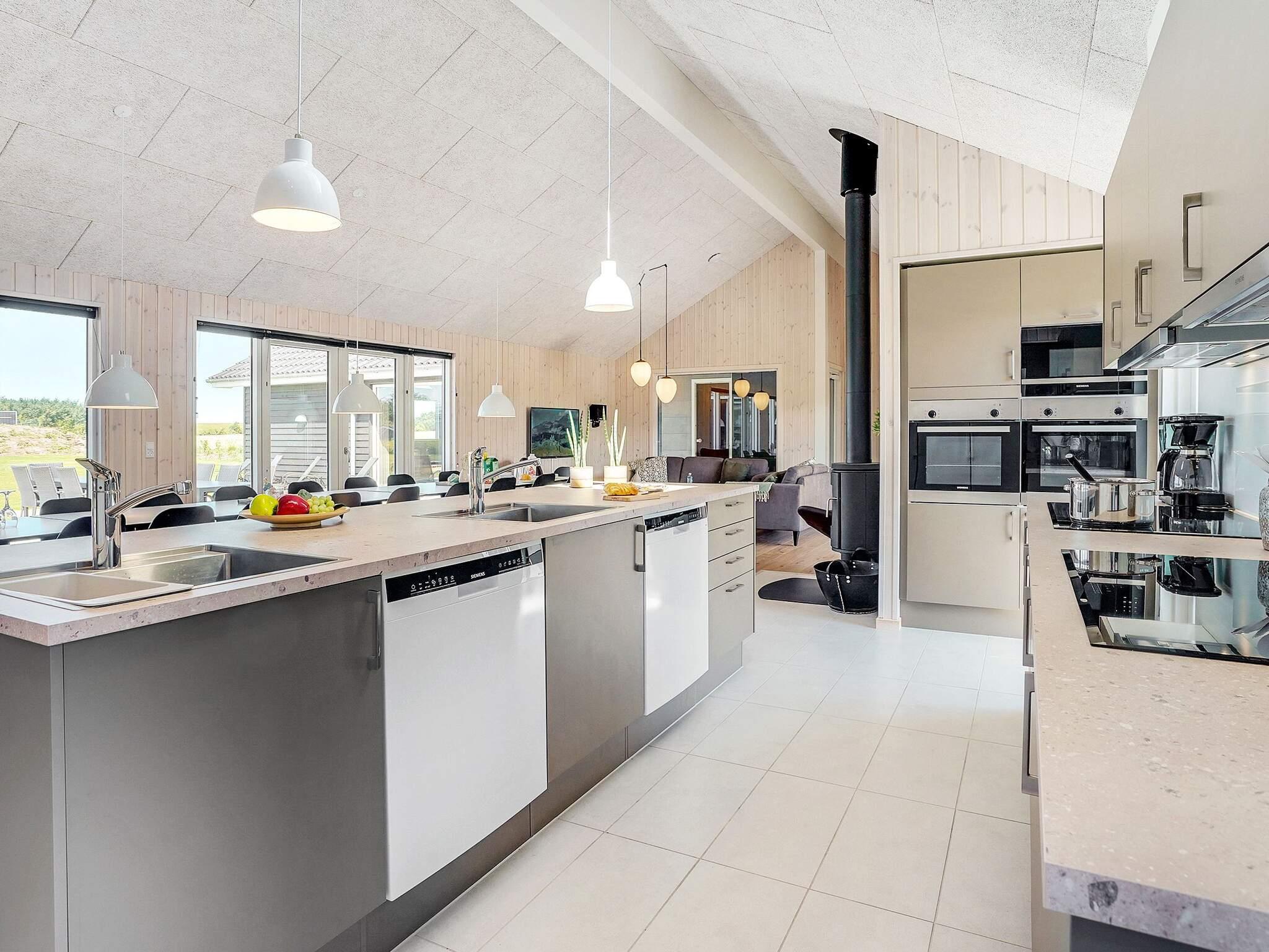 Das Herzstück des Ferienhauses, die große Wohnküche, bietet viel Platz für große Festessen. Köche können in der gut ausgestatteten Küche mit zwei Geschirrspülern, zwei Backöfen, zwei Spülbecken, zwei Kühlschränken und einem zusätzlichen Herd ein Abendessen für 26 Personen zaubern. Zum Servieren und Genießen finden 26 Personen am langen Esstisch Platz. Die große offene Küche ist mit dem hellen Wohn- und Aufenthaltsraum verbunden, wo der Holzofen an kühleren Tagen für wohlige Wärme sorgt.