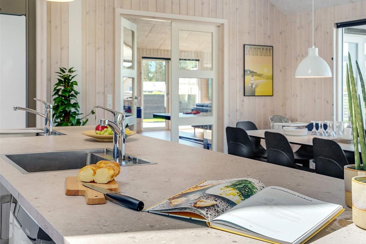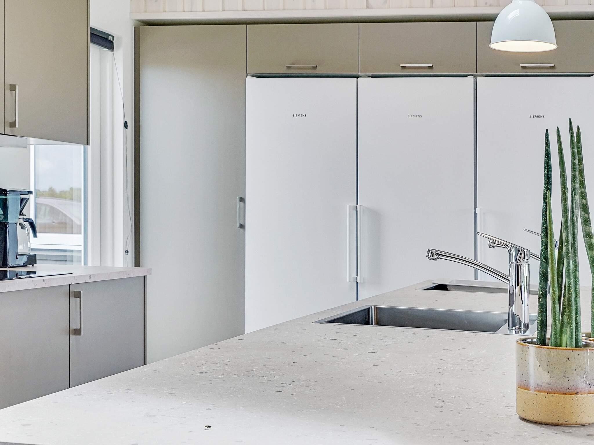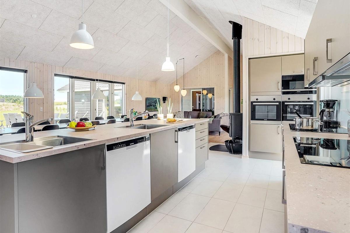 Das Herzstück des Ferienhauses, die große Wohnküche, bietet viel Platz für große Festessen. Köche können in der gut ausgestatteten Küche mit zwei Geschirrspülern, zwei Backöfen, zwei Spülbecken, zwei Kühlschränken und einem zusätzlichen Herd ein Abendessen für 26 Personen zaubern. Zum Servieren und Genießen finden 26 Personen am langen Esstisch Platz. Die große offene Küche ist mit dem hellen Wohn- und Aufenthaltsraum verbunden, wo der Holzofen an kühleren Tagen für wohlige Wärme sorgt.