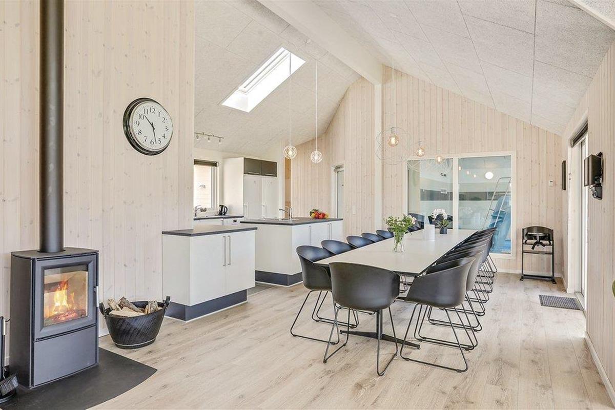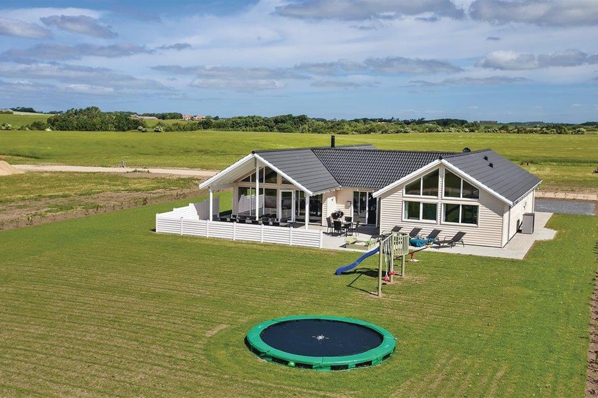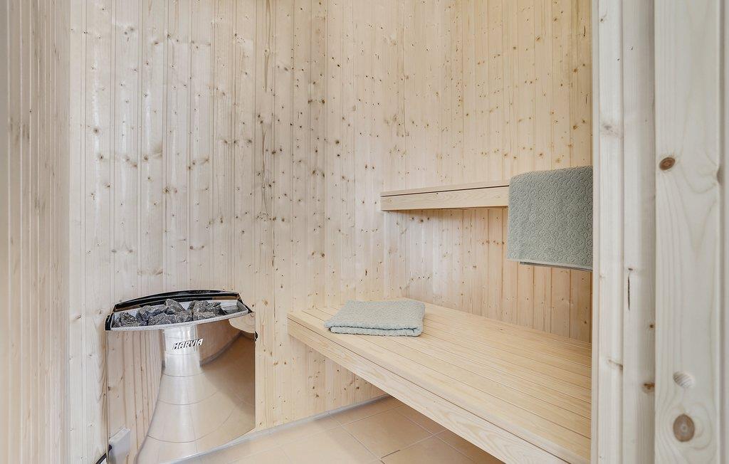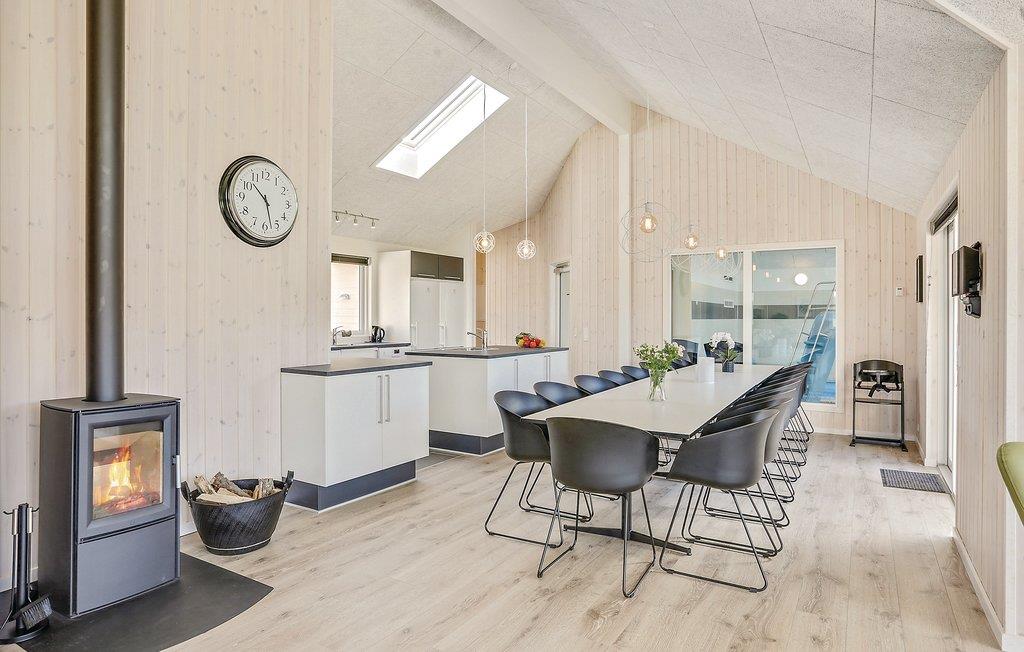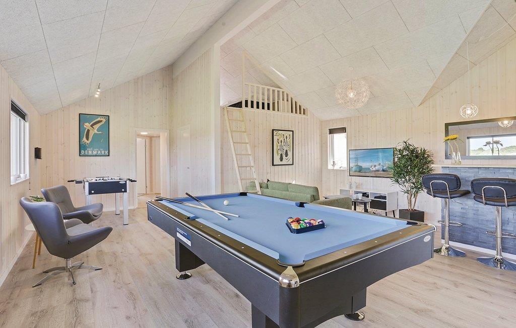 Het prachtige vakantiehuis voor 18 personen bevat 7 slaapkamers verdeeld over twee delen van het huis. Vier slaapplaatsen bevinden zich op de slaapzolder. Er zijn drie badkamers, een grote keuken en een lichte woonkamer. Er is ook een speelkamer met biljart, tafeltennis, darts en Wii. Aan de bar kunt u drankjes bereiden. En dat is nog niet alles. In het gedeelte met het zwembad wordt u ook verwend met een whirlpool en een sauna. Het huis ligt in een nieuw gebied dicht bij het Hostrup strand. Het kindvriendelijke Limfjord ligt op slechts een paar minuten lopen en aan het einde van een pad. Aan het einde van het pad is ook een gemeenschappelijke speeltuin, kinderen kunnen daar komen zonder zich zorgen te hoeven maken over het verkeer. Een paar kilometer van het huis is er een natuurspeeltuin. Het vakantiehuis is omgeven door natuur en ligt niet ver van Skive en Holstebro, waar u heerlijk kunt winkelen en dineren.