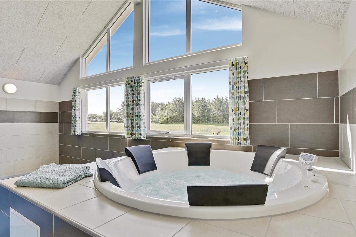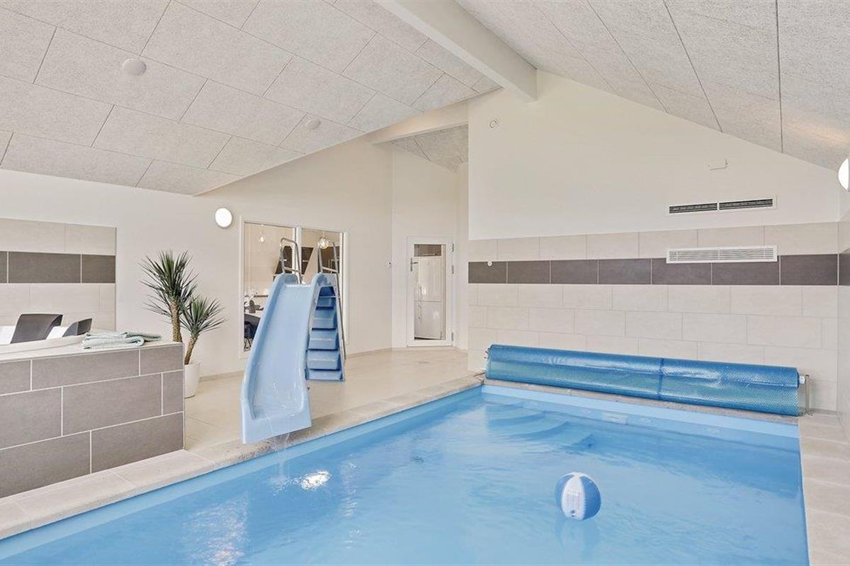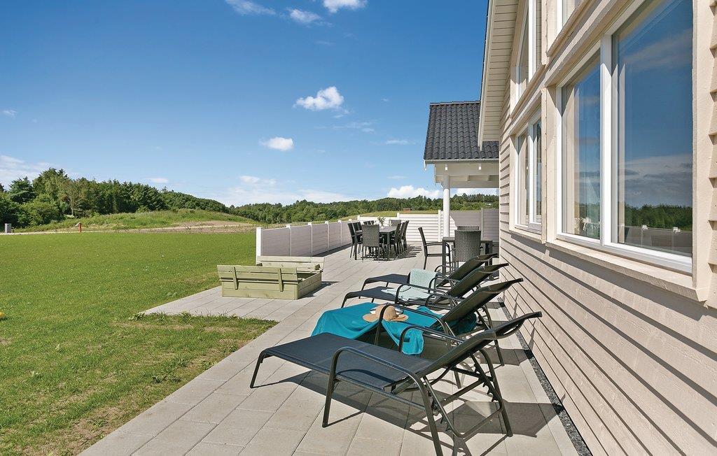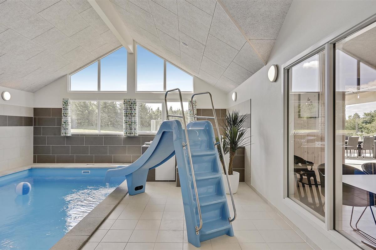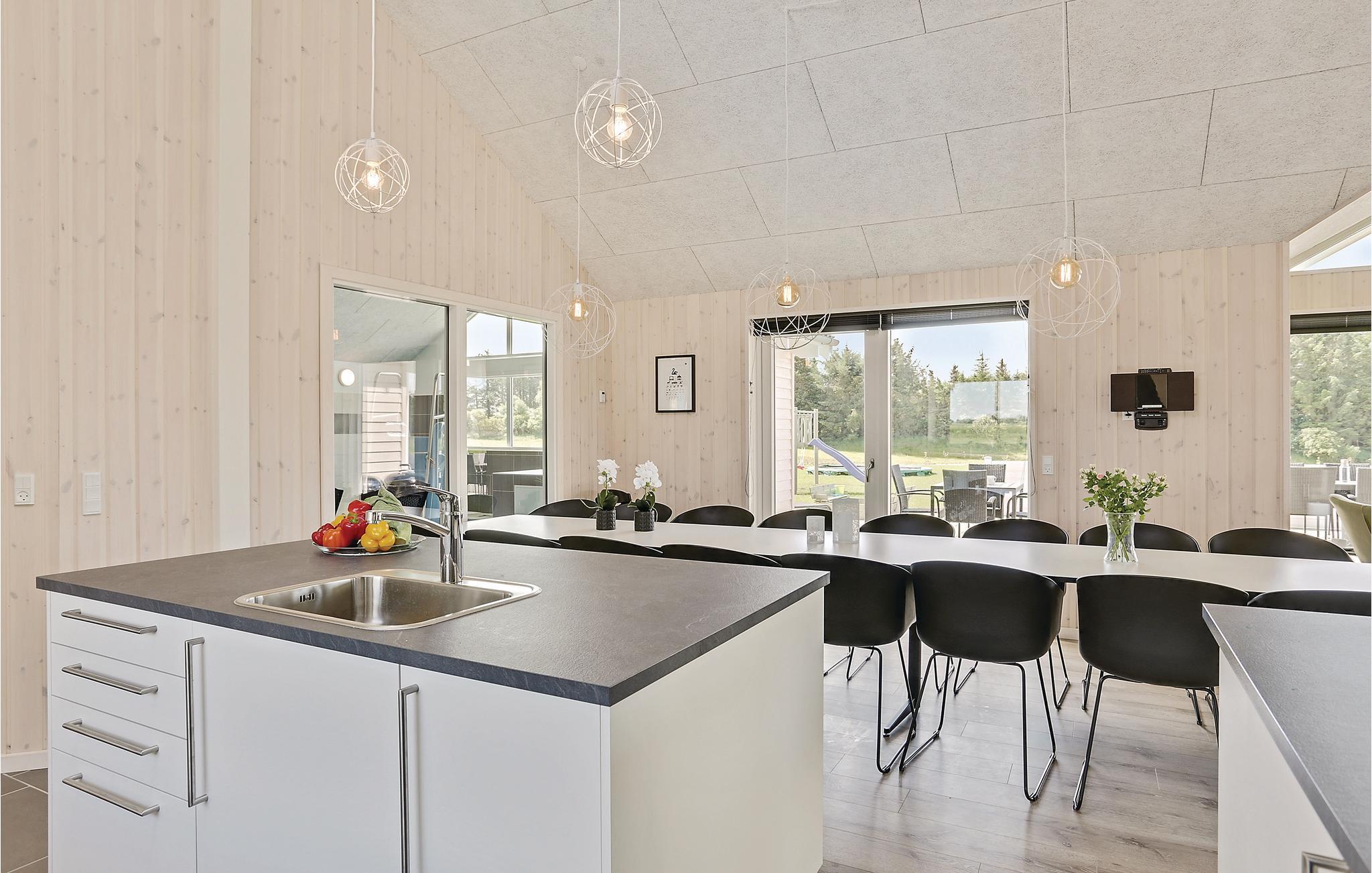 Het prachtige vakantiehuis voor 18 personen bevat 7 slaapkamers verdeeld over twee delen van het huis. Vier slaapplaatsen bevinden zich op de slaapzolder. Er zijn drie badkamers, een grote keuken en een lichte woonkamer. Er is ook een speelkamer met biljart, tafeltennis, darts en Wii. Aan de bar kunt u drankjes bereiden. En dat is nog niet alles. In het gedeelte met het zwembad wordt u ook verwend met een whirlpool en een sauna. Het huis ligt in een nieuw gebied dicht bij het Hostrup strand. Het kindvriendelijke Limfjord ligt op slechts een paar minuten lopen en aan het einde van een pad. Aan het einde van het pad is ook een gemeenschappelijke speeltuin, kinderen kunnen daar komen zonder zich zorgen te hoeven maken over het verkeer. Een paar kilometer van het huis is er een natuurspeeltuin. Het vakantiehuis is omgeven door natuur en ligt niet ver van Skive en Holstebro, waar u heerlijk kunt winkelen en dineren.