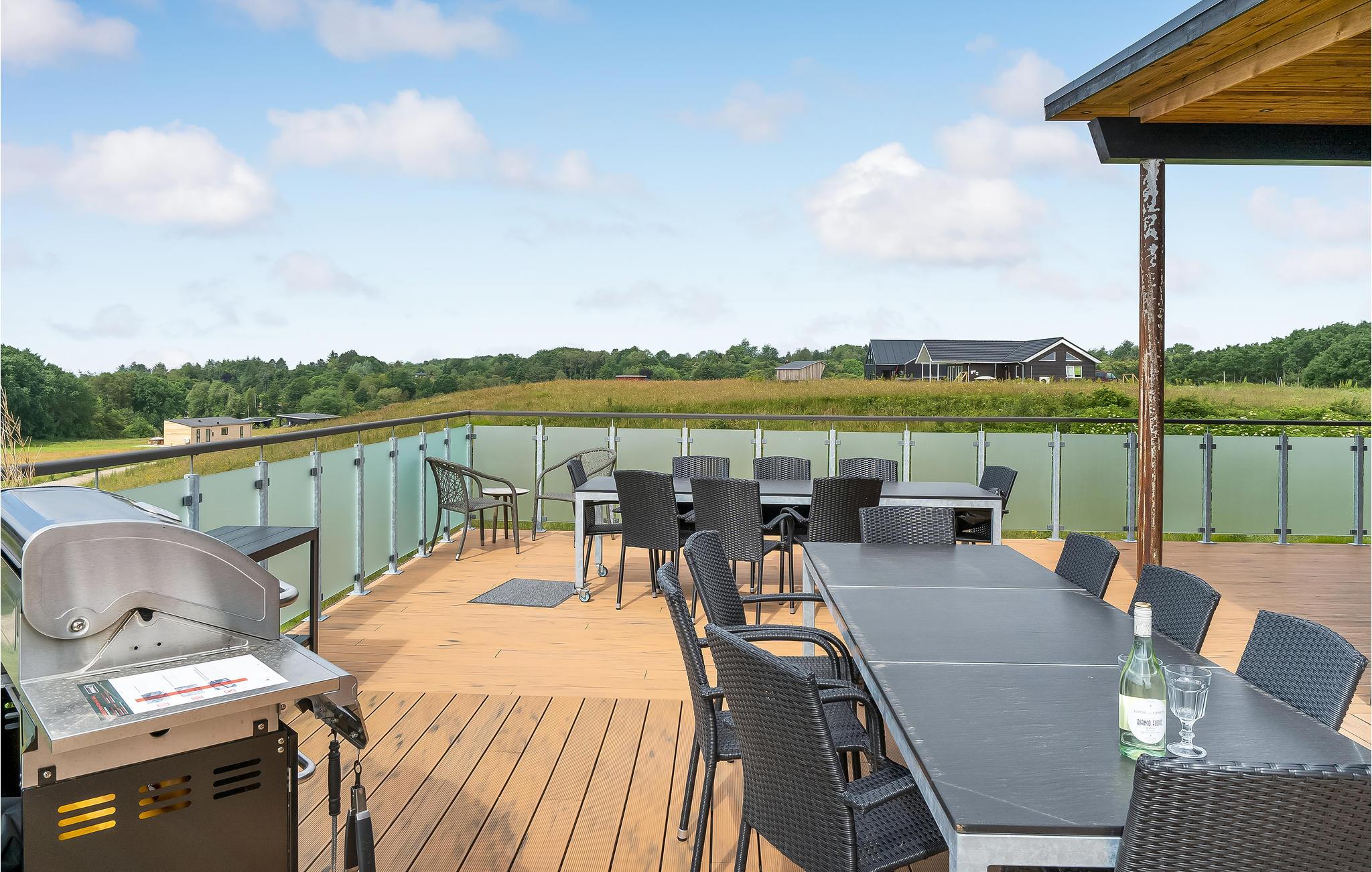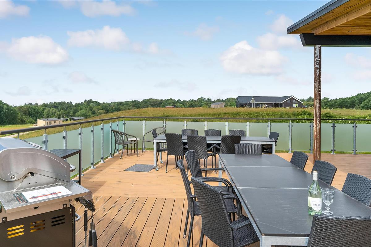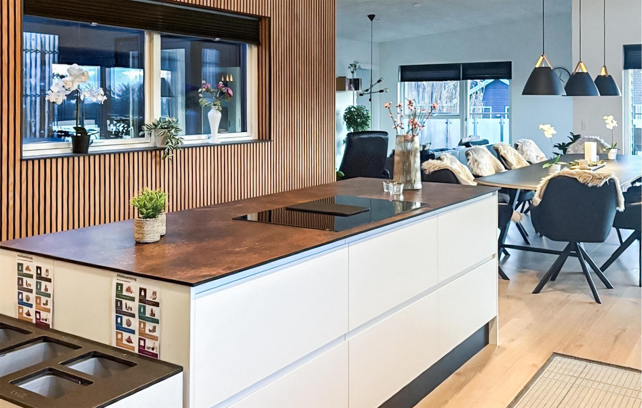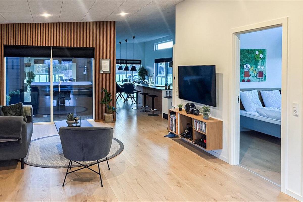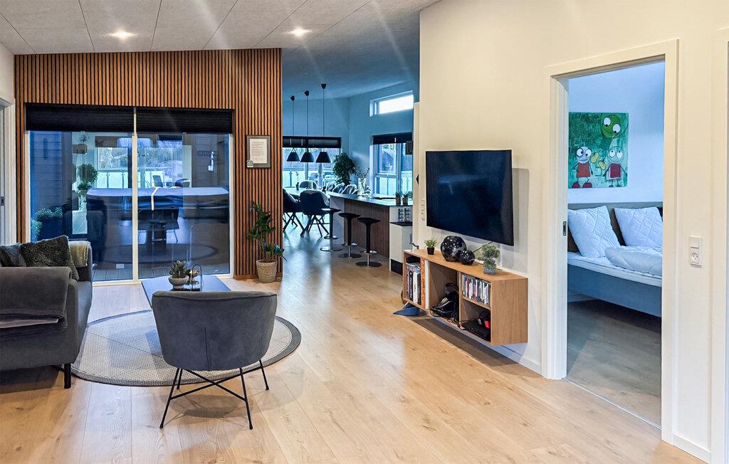 Dit extra grote vakantiehuis biedt de optimale setting voor een geslaagde vakantie met veel gasten en in een comfortabele omgeving. Het huis ligt op een open natuurgrondstuk met uitzicht op het landschap en veel ruimte om te spelen en actief te zijn. Het hoogwaardige vakantiehuis is uitgerust met alle voorzieningen die u zich op vakantie kunt wensen. Binnen wacht u een lichte en moderne sfeer met een inrichting in een elegante, Scandinavische stijl. Het hart van het huis is de open woon- en keukenruimte, waar u kunt samenkomen met familie of vrienden. Breng samen ontspannende tv-avonden, gezellige maaltijden of spannende spelletjesavonden door. De grote ramen laten prachtig daglicht binnen.