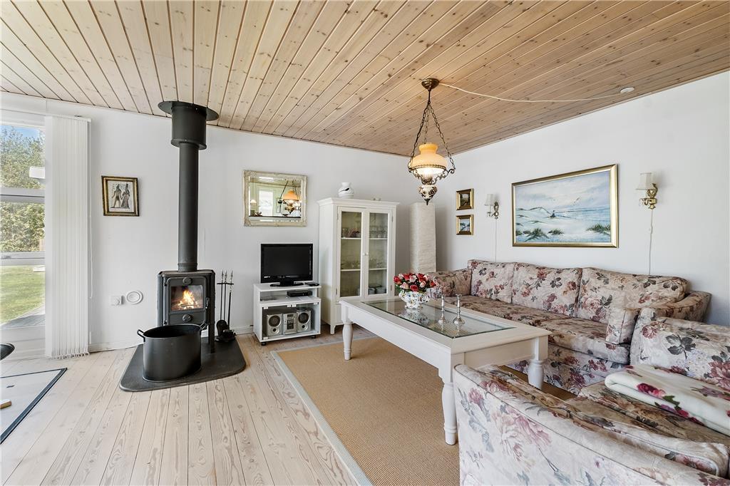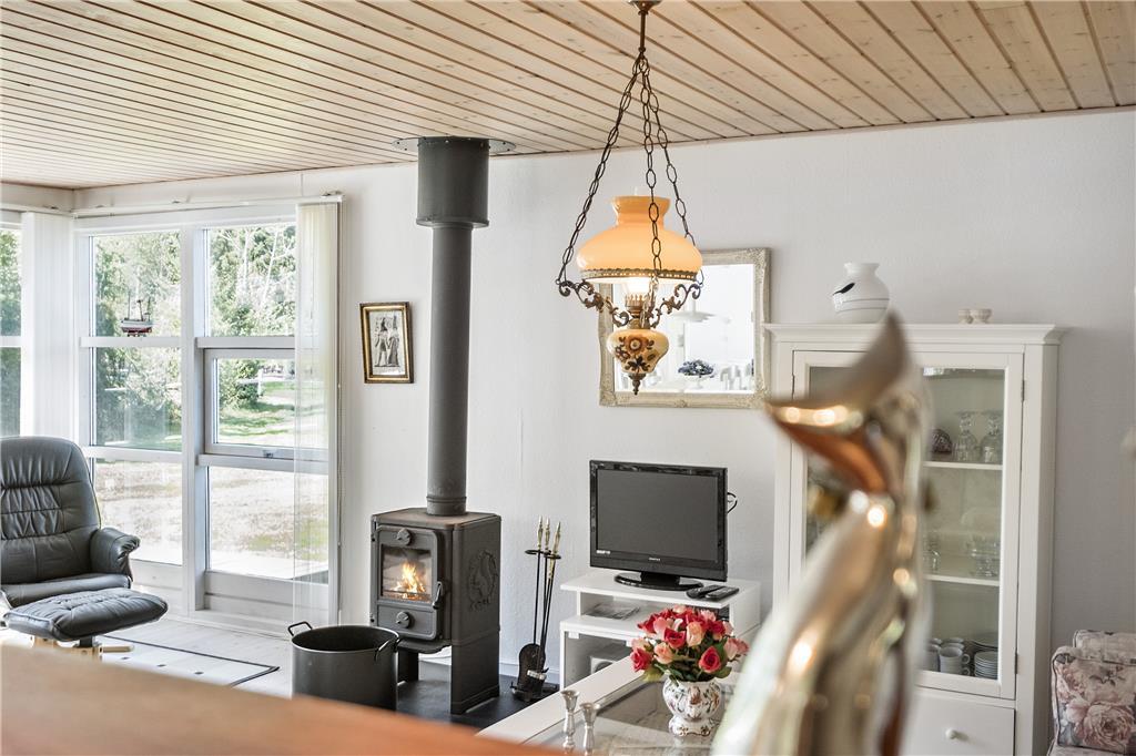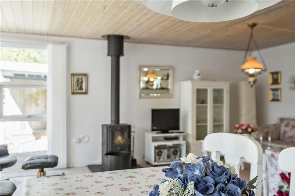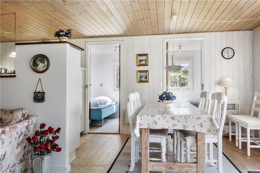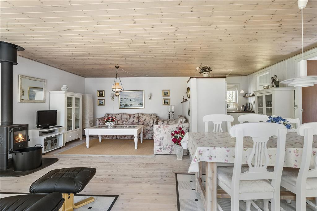 Das Zentrum des Ferienhauses besteht aus einem großen Wohnzimmer mit Essbereich und offener Küche. Vom Wohnzimmer aus gibt es einen Zugang zu guten Schlafzimmern, ausgestattet mit einem Doppelbett und zwei Etagenbetten. Über den kleinen Flur gibt es einen Zugang zu einem kleinen, aber entzückenden Badezimmer. Das Haus ist so eingerichtet worden, wie ein Ferienhaus sein sollte, so dass die müde und hektische Seele komplett entspannen und ganz herunter kommen kann. Es ist die pure Ferienhausgemütlichkeit!