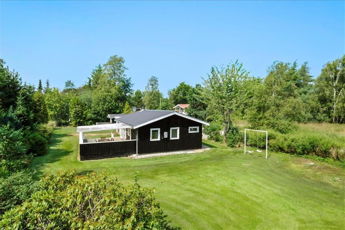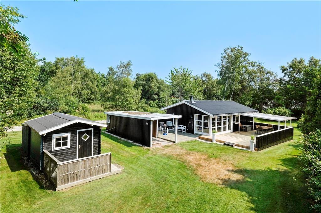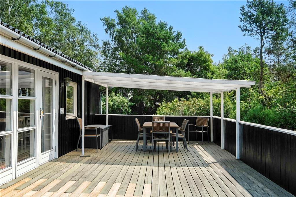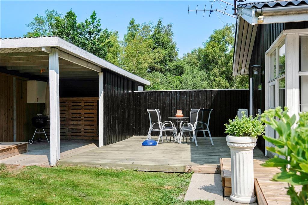 Nach Westen und nach Süden hin gibt es eine große teils überdachte teils offene Terrasse, so dass immer die Möglichkeit besteht, das Leben draußen und die Sonne von morgens bis abends zu genießen. Das Ferienhaus liegt auf einem großen Gartengrundstück mit Bäumen und Büschen auf allen Seiten, so dass Sie ganz für sich sind - allenfalls können Sie mit den Nachbarn etwas Sichtkontakt austauschen. Es gibt Raum für Spiele und Lebensfreude.