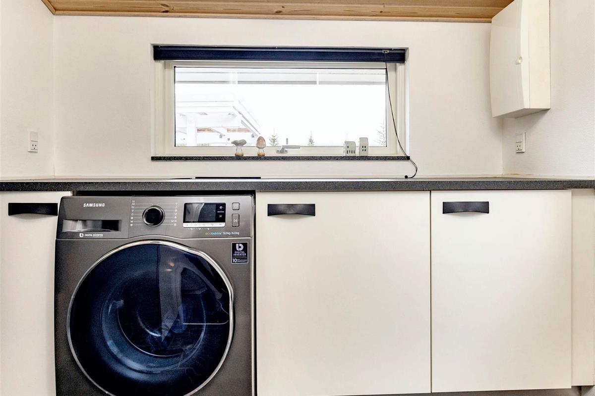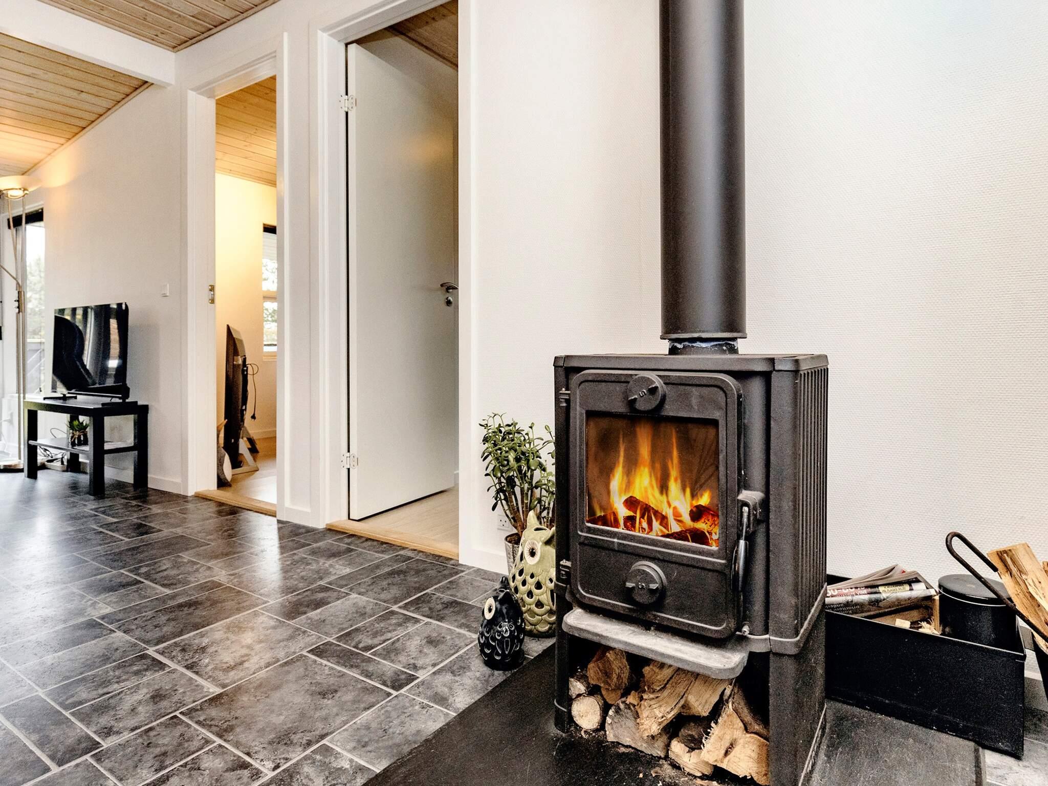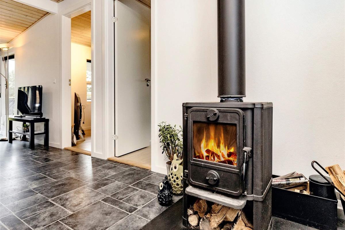 Innen Eingangsdiele mit Waschmaschine. Große, offene Wohnküche mit Holzofen. Sehr guter Lichteinfall durch die großen Fenster nach Süden und direkter Zugang zu einer großen und teilweise überdachten Terrasse. Helles Badezimmer in schönen Materialien und mit einer guten, geräumigen Duschkabine mit Glastüren. Es gibt drei gute Schlafzimmer, aufgeteilt in eines mit Doppelbett, ein Zimmer mit zwei Einzelbetten und ein Zimmer mit Etagenbett mit zwei Kojen.