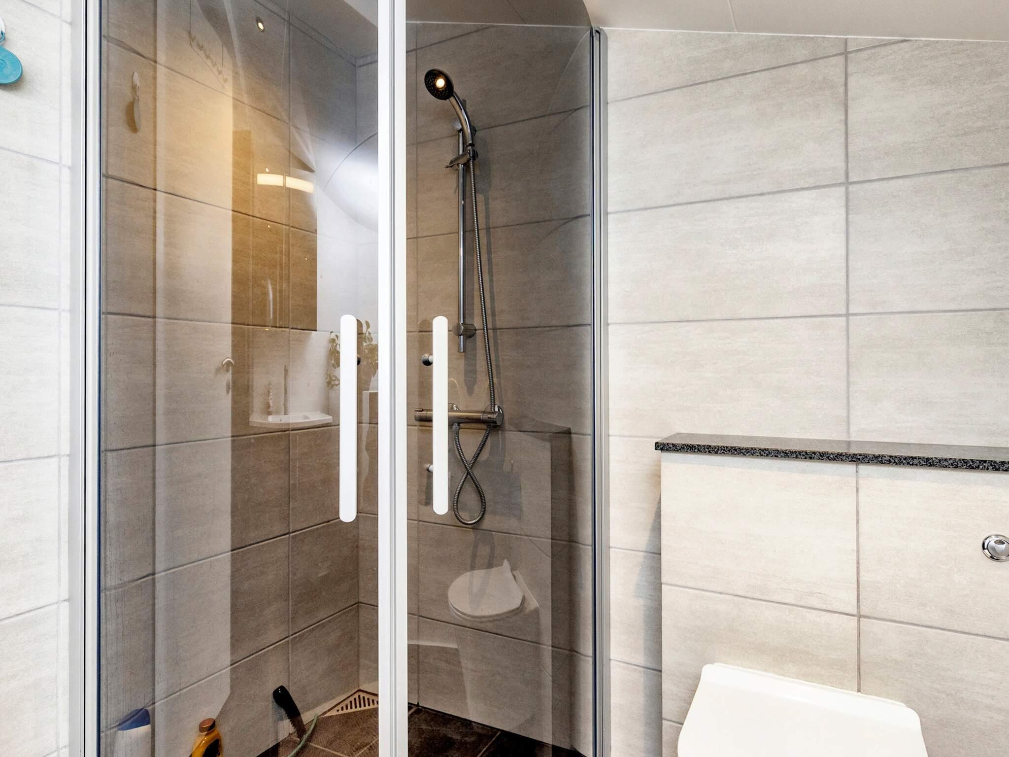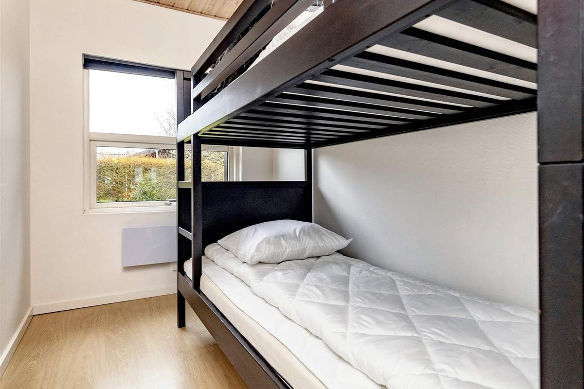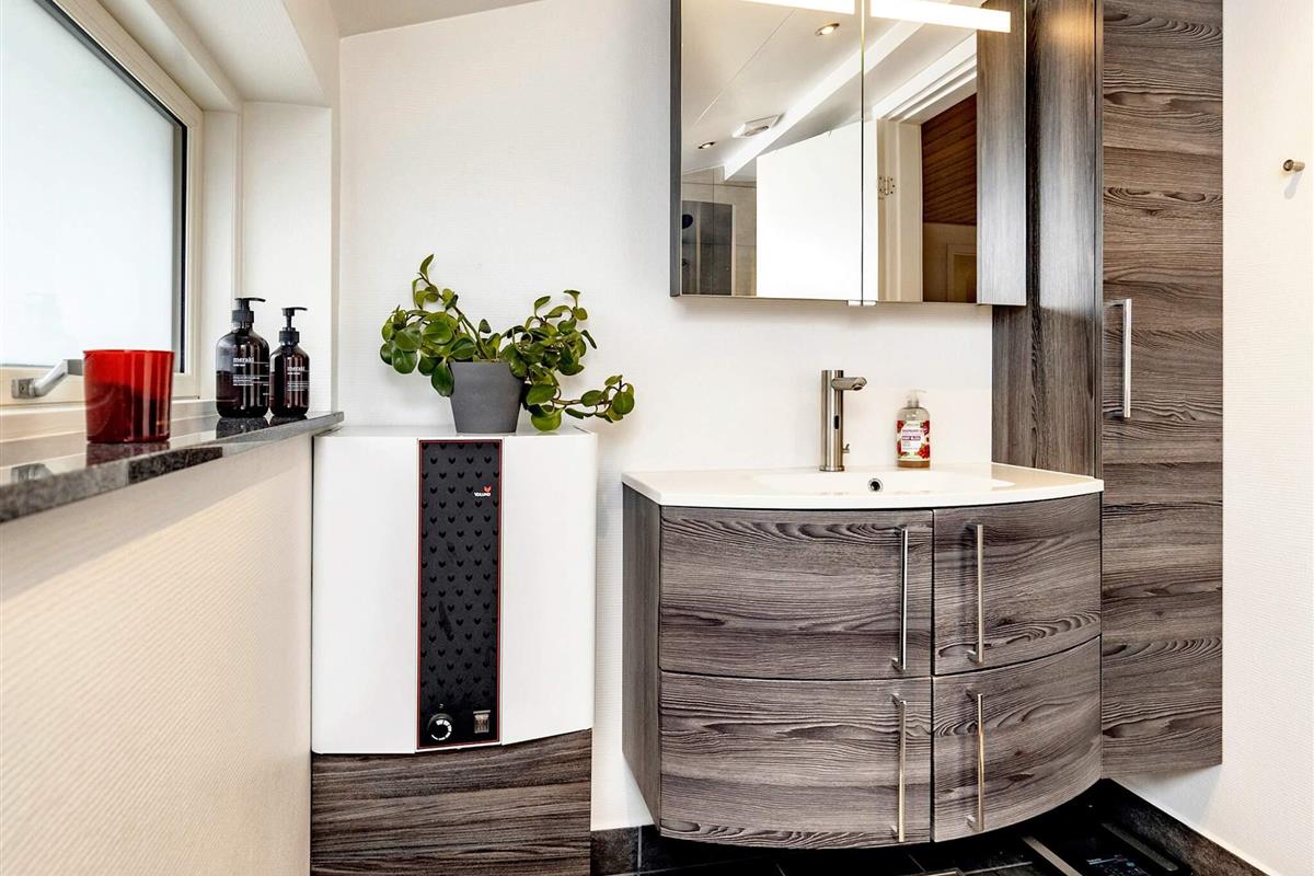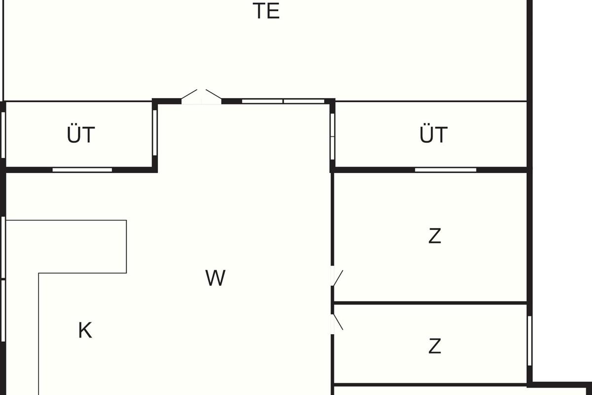 Innen Eingangsdiele mit Waschmaschine. Große, offene Wohnküche mit Holzofen. Sehr guter Lichteinfall durch die großen Fenster nach Süden und direkter Zugang zu einer großen und teilweise überdachten Terrasse. Helles Badezimmer in schönen Materialien und mit einer guten, geräumigen Duschkabine mit Glastüren. Es gibt drei gute Schlafzimmer, aufgeteilt in eines mit Doppelbett, ein Zimmer mit zwei Einzelbetten und ein Zimmer mit Etagenbett mit zwei Kojen.