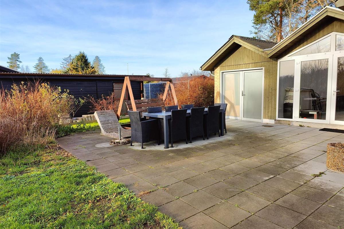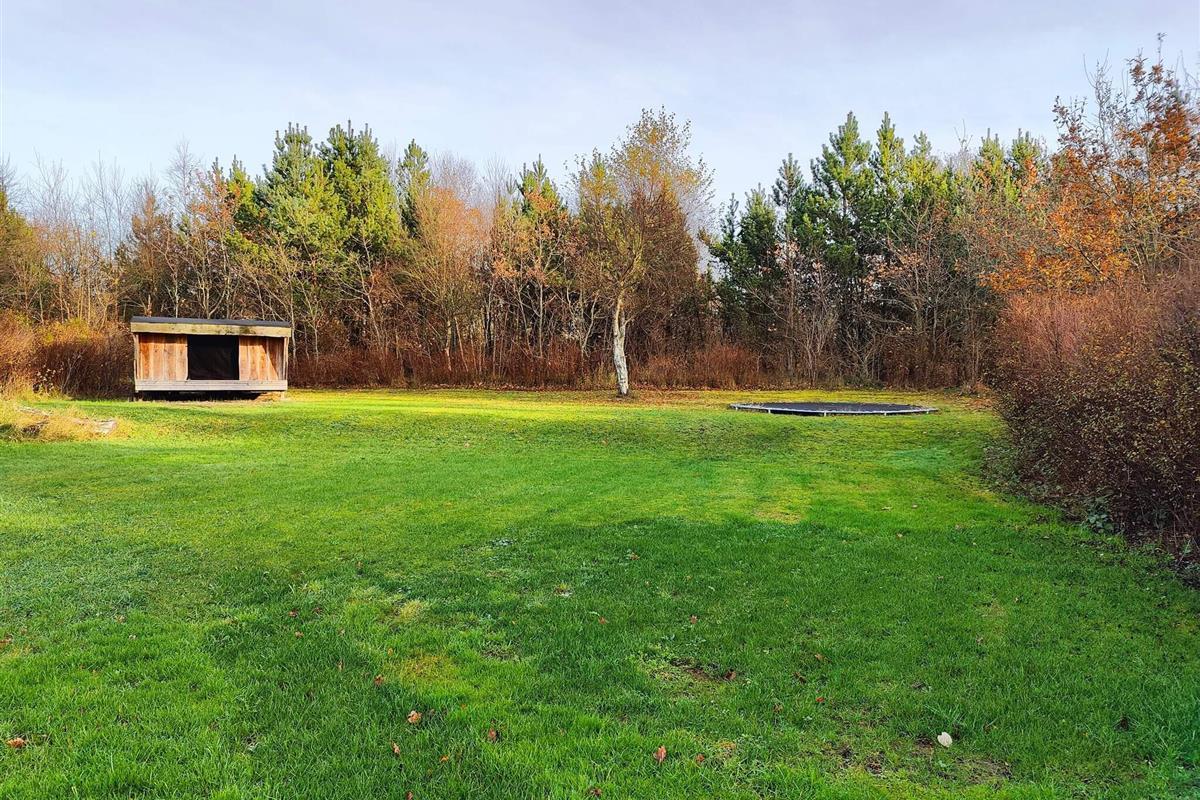 Der Garten des Hauses grenzt an einen Waldstreifen, der zum Entspannen und Spielen einlädt. Das Grundstück bietet insgesamt 1200 m² mit zwei Terrassen, Gartenmöbeln, einem Unterstand mit Feuerstelle und einem Trampolin.