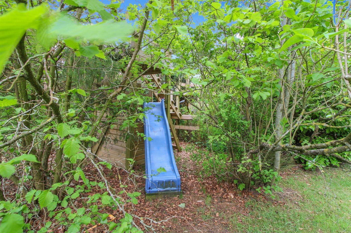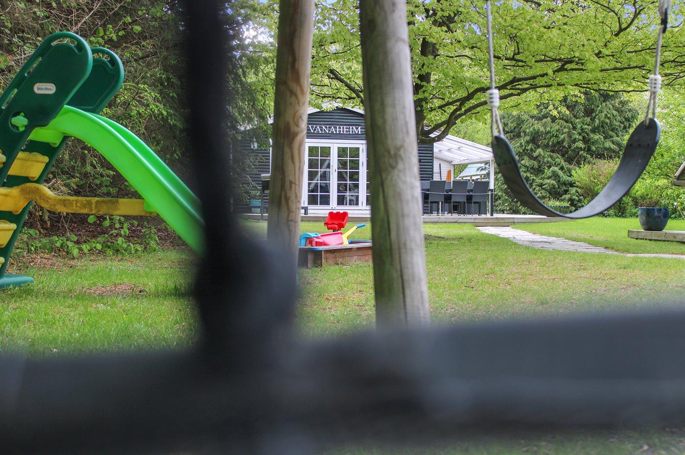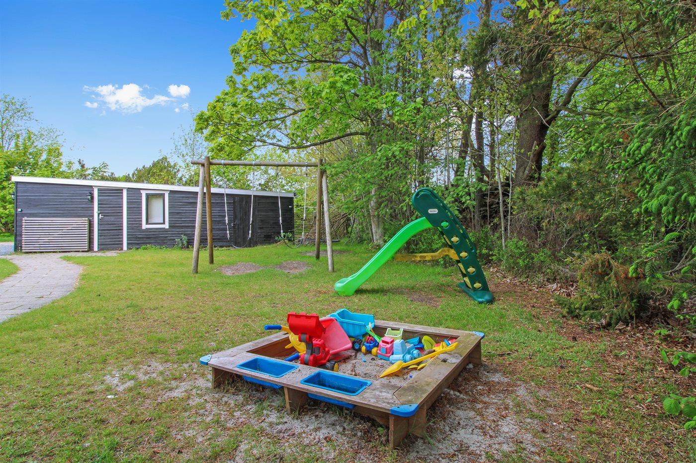 De vakantiewoning is gelegen op een 1250 m² groot aangelegde tuin. De grond is omheind. Afstand tot de zee 875 m. Dichtstbijzijnde winkel 4100 m. Er is een golfbaan op een afstand van 4400 m. Bij de vakantiewoning hoort 75 m² terras. Daarnaast is er een 8 m² groot overdekt terras. Schommel. Zandbak.Vuurplaats. Parkeerplaats bij het huis.