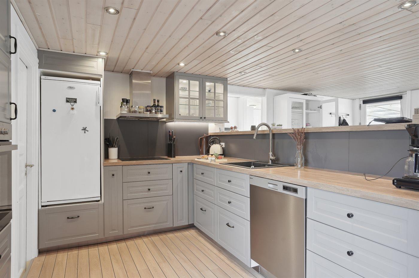 De keuken is uitgerust met koelkast Er is 4 inductiekookplaten, heteluchtoven, magnetron en vaatwasser.
